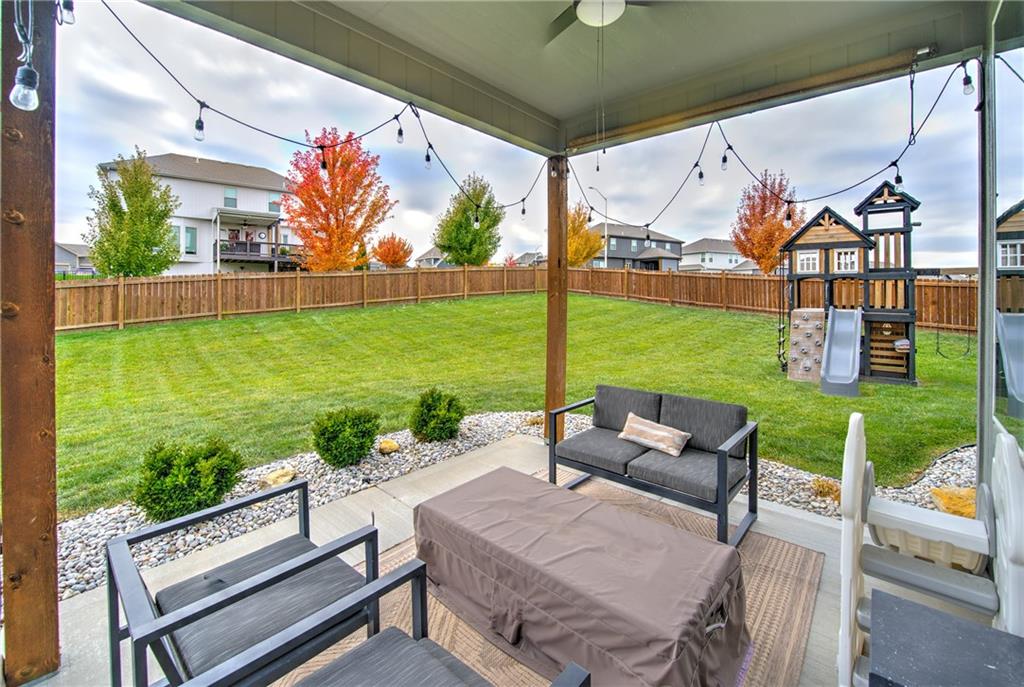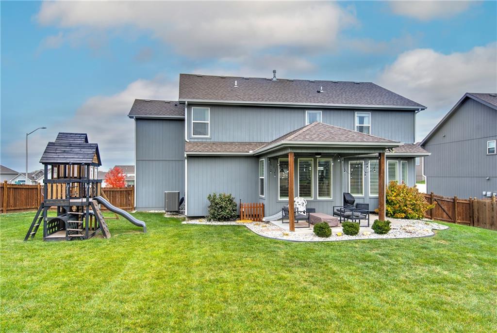 This two-story home, built in 2018, shows the pride of ownership. It looks like new without the wait! Entering you see the hardwood floors and vaulted ceilings, open floor plan and its almost 3,500'. The main level features a formal dining area into the living room, with a beautiful fireplace, large windows for the sun to shine through. And nice built-in shelving. The eat-in kitchen has beautifully painted cabinetry, an island with extra seating, and a large walk-in pantry with a nice 1/2 bath on the main level. From the kitchen, you can access the covered patio, an ideal space for entertaining and watching the kids and pets play in the fenced back yard. Situated on a 0.26-acre lot, the backyard offers nice landscaping, a privacy fence, and nice plants and bushes. Upstairs, the primary suite awaits, complete with a tray-lit ceiling and large windows. The oversized primary bathroom features beautifully tiled floors and shower, a large soaker tub, and a spacious walk-in closet. Also includes two additional bedrooms with a Jack and Jill bath, a 4th bedroom with private suite, and a nice laundry room on this level. The lower level, finished in 2020, incorporates the modern finishes and attention to detail found throughout the rest of the home. It features a tiled wet bar with extra cabinetry, a sink, and quartz counters, and an extra count top perfect for the kids to do homework or just a place to enjoy. A cozy family room and 2nd fireplace. The fifth bedroom/office, with double door entry, and the fourth full bath complete this level, with luxury vinyl plank floors throughout With access to the wonderful amenities Benson Place Fieldstone has to offer and located within the award-winning Liberty School District. This home truly has it all. Come See, Fall in Love and make this your next place to call Home.