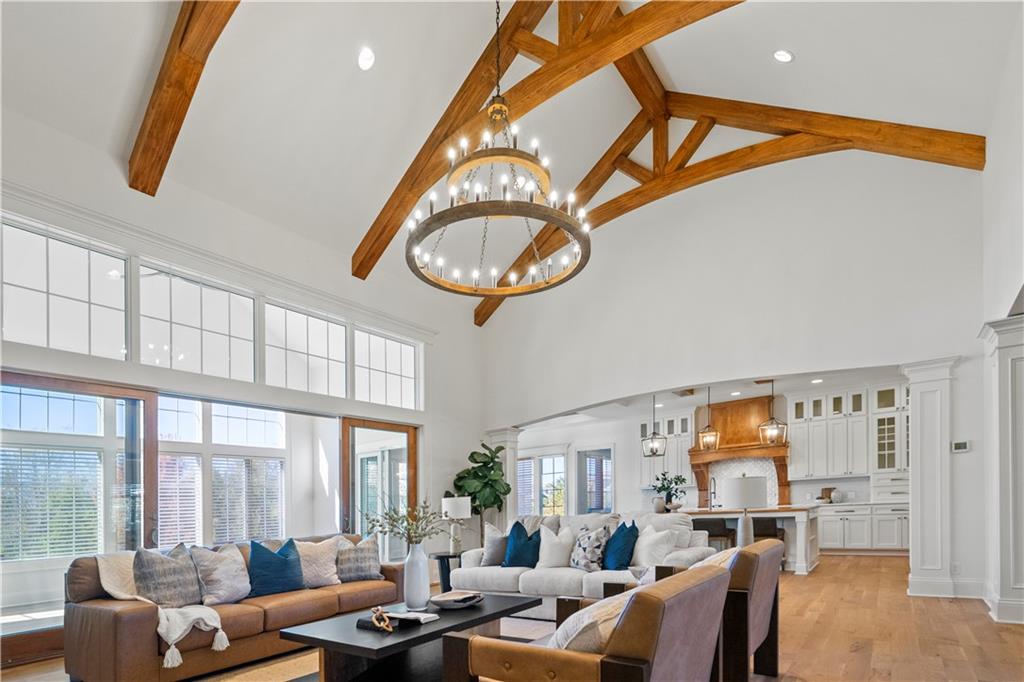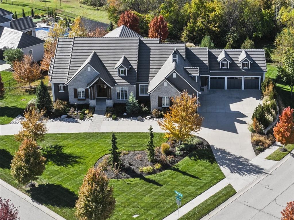 Fall head over heels for this stunning luxury reverse 1.5 story in The Farms at Garnet Hill! Impressive from the start--thoughtful landscaping, circle drive and a 5 car garage. Custom build by Cecil & Ray design team. This elegant home blends timeless design with resort-style living. Step inside to soaring ceilings, rich hardwoods and expansive windows showcasing beautiful views of the private backyard oasis. The open-concept main level features a great room with stone floor to ceiling fireplace and built-ins flowing seamlessly into the gourmet kitchen. Please any chef and entertain in style in this expansive kitchen featuring custom cabinetry, large center eat-in island, walk-in butler's pantry and high-end stainless steel appliances. Adjacent dining and breakfast areas! Easily move the experience onto the lanai with multiple access points for convenience. Spacious primary suite offers a spa-inspired bath including double vanity, soaking tub, large walk-in shower and huge walk-in closet conveniently adjacent to laundry room. Second main-floor bedroom or office with built-ins adds flexibility. Option to take the stairs or use the elevator to the beautifully finished walk-out basement. Here the entertainer’s dream continues with a family room, rec area, gorgeous wet bar, tiered media room, two additional bedrooms each with their own en-suite bath and walk-in closets and bonus pool bathroom with changing room and 2nd laundry. Walk-out access to your in-ground resort styled pool, covered patio, sun deck and lush landscaping providing privacy. Impeccably maintained, thoughtfully designed and located in one of Overland Park’s most desirable neighborhoods—this is luxury living at its finest! WELCOME HOME!