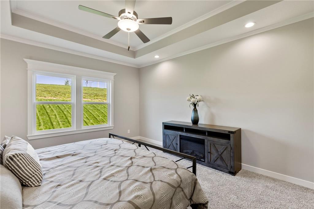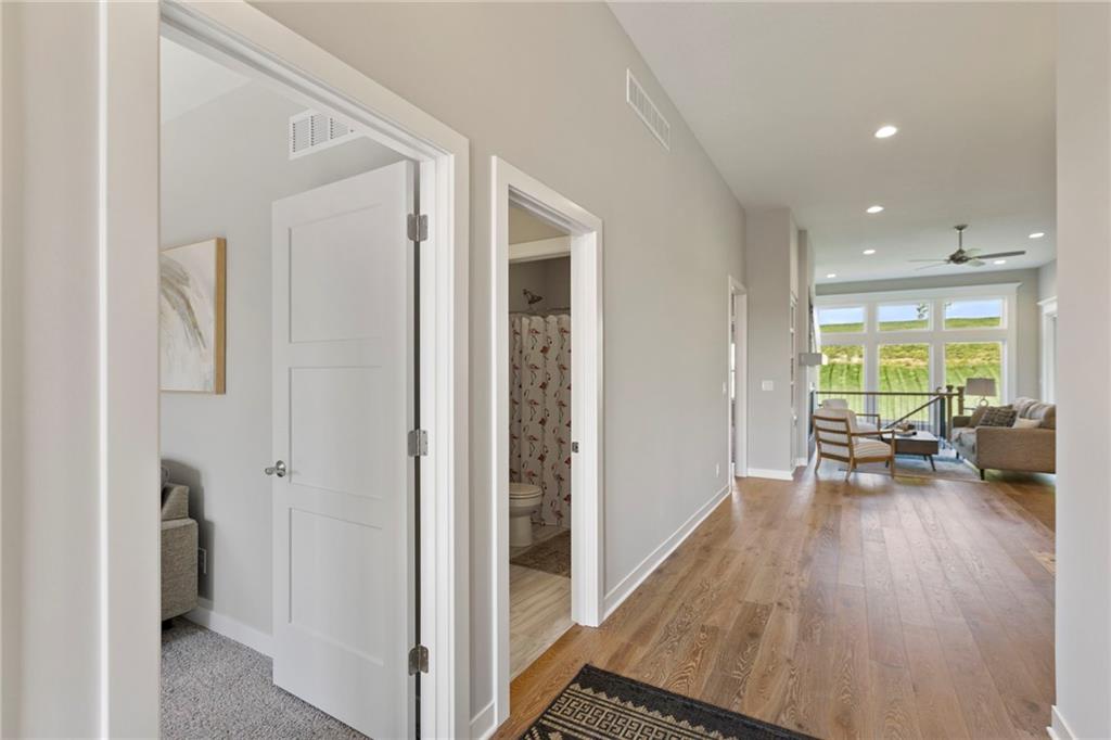 ** Exceptional quality meets effortless living in the final Patriot Home available in Maintenance Provided Cadence Villas.This home is finished.** Resize your living space with ease and enjoy the benefits of maintenance provided living in the Truman by Patriot Homes! Located on a secluded cul-de-sac homesite, this Reverse 1.5-story open concept floor plan includes a stone-clad traditional façade, three-car garage, and covered front porch. The 8-foot front door leads into a spacious entry with a 12-foot ceiling highlighted by an elegant trim treatment and chandelier. Hardwood flooring throughout the main entry, living and kitchen accentuates the seamless flow between the dining room, kitchen, and great room while a bedroom and full bathroom just off the entry makes for an ideal guest or bonus room. Arguably the showpiece of the home, the kitchen is outfitted with expansive quartz countertops, large center island, shaker style custom cabinetry, and stainless steel Samsung appliances. Opposite the kitchen is a cozy great room with a gas fireplace, built-in bookshelves, floor-to-ceiling windows, and an 8-foot sliding glass door that opens to a covered patio. A private hallway leads to the master suite showcasing an exquisite freestanding soaker tub, zero entry walk-in shower, Bluetooth audio system, and a sizeable walk-in closet with third tier pull down rods. The Truman comes equipped with additional conveniences such as 8-foot tall garage doors with an included belt drive opener on main door, an irrigation system, high efficiency 96% Lennox furnace, whole house humidifier, and 50-gallon electric water heater. Homeowners also have an annual HOA fee of $600. This villa is in Prestigious Phase 1, Cadence Villas, a Hunt Midwest Maintenance Provided Community.
