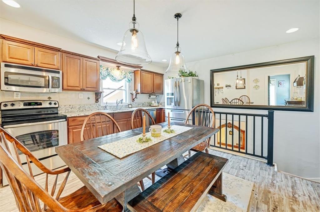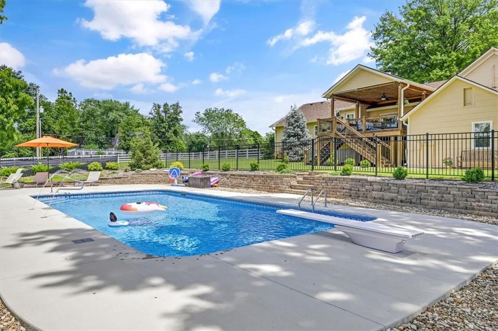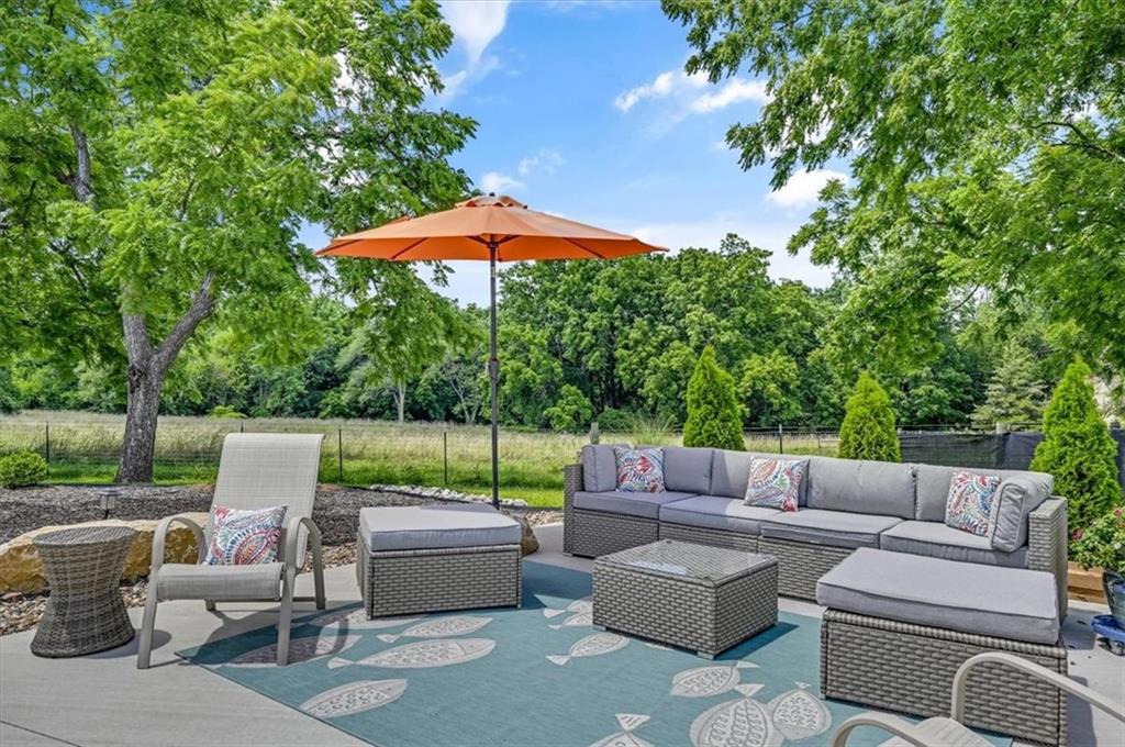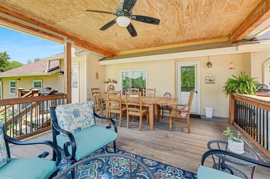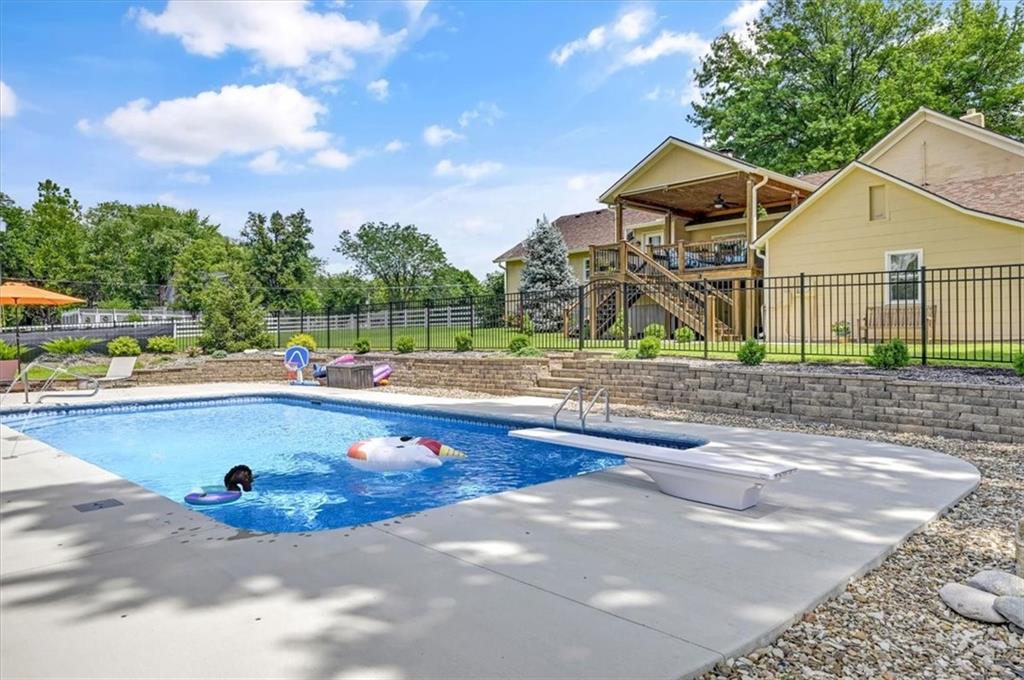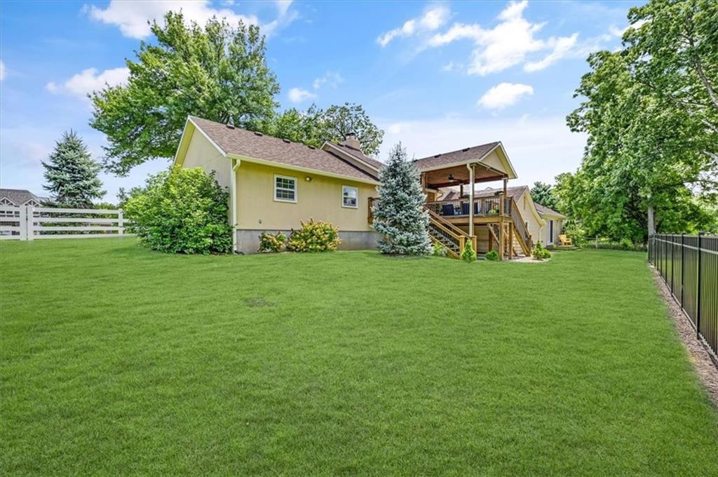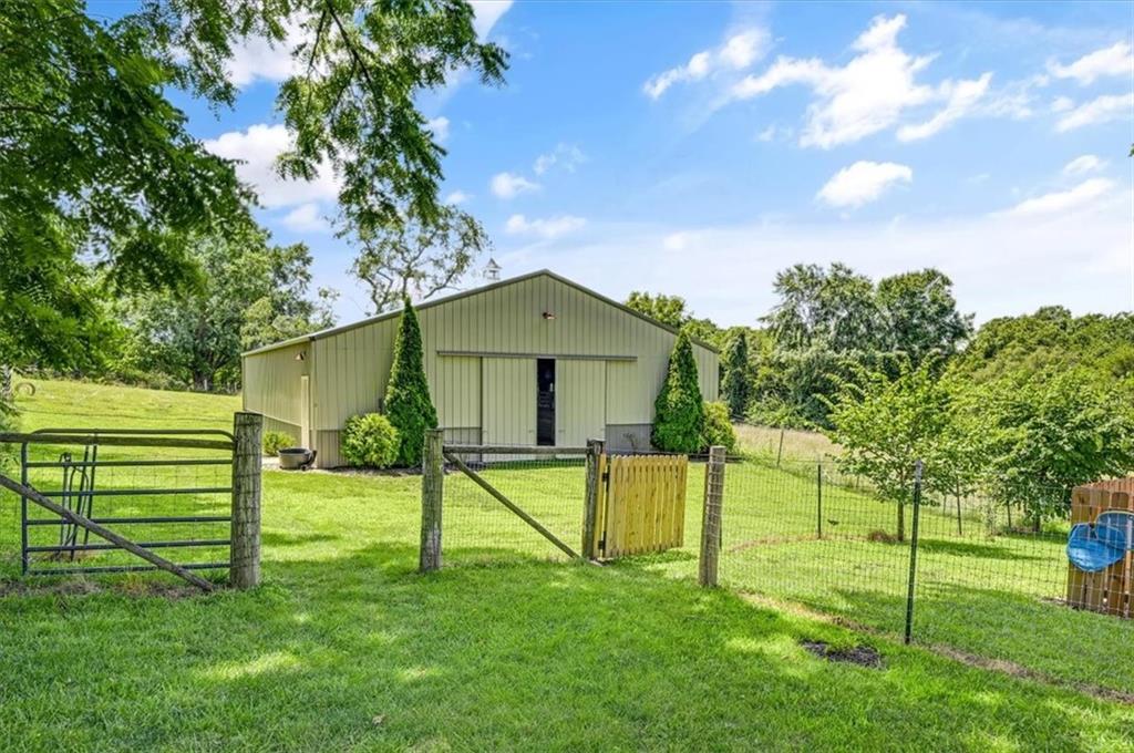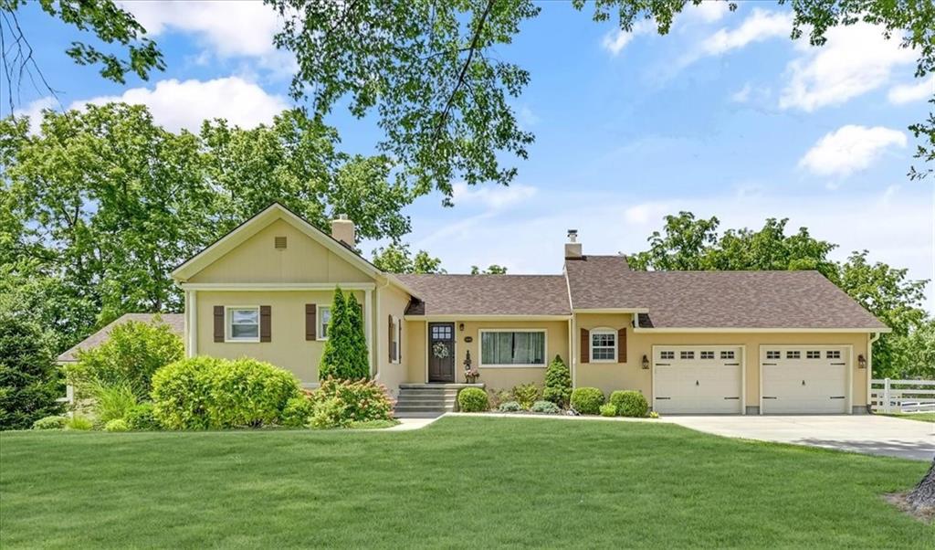 This original farmhouse has been expanded upon to evolve into the charming home that it is today. In a well-respected and established neighborhood, you will find this true retreat on 9+/- acres, ready for horses! In 2015 the 2-car attached garage, mudroom/office, covered deck and new barn were all added. The heated inground diving pool was added in 2023. The roof and furnace are 2 years old while the AC is only 6 years old. The main level features living room with wood burning fireplace, eat in kitchen, 1 bedroom and a full bathroom. The lower level features a 2nd large bedroom, full bathroom, laundry room, storage room and a spacious primary suite. The primary suite walks out to the backyard, the primary bathroom and walk-in closet have heated tile floors. The covered deck provides ample space for outdoor eating and gathering or walk down to the pool area for some fun or relaxation in the sun surrounded by beautiful landscaping and the privacy of your land behind. Fenced and crossed fenced with vinyl fencing in the front and smooth on the remaining fencing. The main barn is 40x50 and has 3 large stalls, a tack room and plenty of extra space for hay and a tractor. The second older outbuilding has a run-in shed on one side and a closed-in unfinished area on the other. Centrally located close to both Fort Leavenworth and the Legends. This property includes 3 street fronts in case a new owner wanted to subdivide the land in the future.