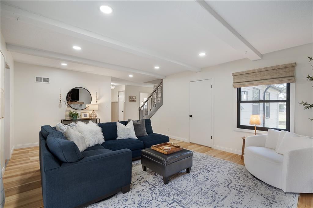 Stunning ranch/1.5 story in sought after Pinehurst subdivision. Welcome to this 5bd/3.1ba/2 car garage main level living home nestled on a quiet cul-de-sac. Light, bright and ah-mazing! Sitting on over a 1/2 acre lot, this park-like property is perfect for quiet family nights or loud exciting gatherings w/friends. Step inside to new engineered wood floors (gorgeous) in entry, formal living and dining room, family room and hallway to bedrooms! New carpet in all bedrooms (no animals or shoes have walked on the carpets:); staircase features designer carpet leading up to 2nd level adding a touch of luxury to the home's updated style. New interior/exterior paint, new Renewal by Anderson windows on front of house (adds so much natural light), new windows in family room, new light fixtures, new canned lights in family room, textured ceilings thru-out (not popcorn!) and gorgeous gas fireplace. Kitchen boasts granite counters, stainless steel appliances, double oven, and eat-in area. Elegant master ensuite w/sliding door, remodeled shower and new gorgeous vanity; laundry room, two generous-sized bedrooms on main level and hall bath complete the main level. Upstairs you'll find two large bedrooms w/walk-in closets and jack and jill bath, perfect for guest bedrooms, office, craft room, play room all overlooking the gorgeous backyard park! This home continues to impress w/epoxy-coated floors in lower level recreation room and new half bath. Tons of storage in lower level. Two car garage has epoxy-coated floor, too! Easy access to highways, close to award-winning Shawnee Mission schools, shopping, restaurants and more! See it before it's gone. **All information deem reliable but not guaranteed. Buyer and buyer's agent to verify all information, including measurements, during inspection period.**