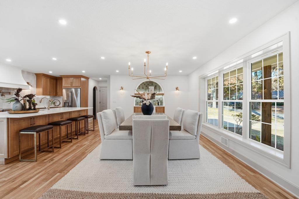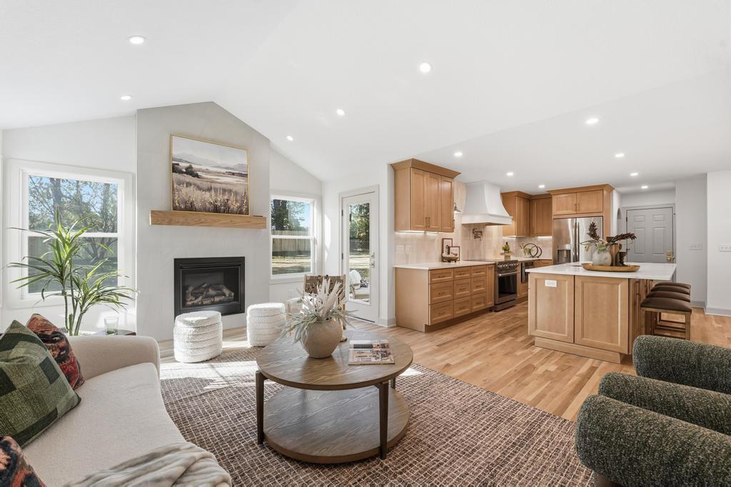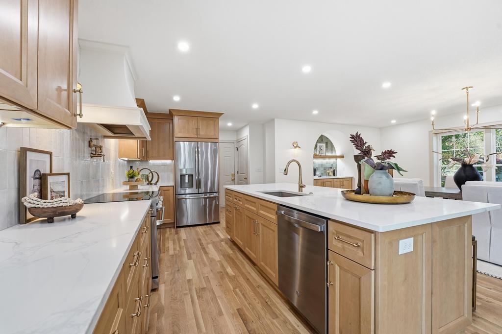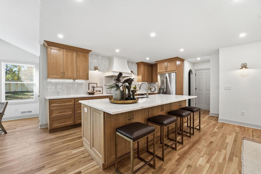 ABSOLUTELY STUNNING REMODELED RANCH IN THE HEART OF LEAWOOD! This beautifully reimagined 4-bedroom, 3-bath home perfectly blends timeless charm with sophisticated modern design. Step inside to an inviting open-concept layout featuring gleaming refinished hardwood floors, designer lighting and high-end finishes throughout. The vaulted family room is filled with natural light and anchored by a cozy fireplace—ideal for gathering or relaxing. Show stopping kitchen will impress any chef with quartz countertops, custom cabinetry, walk-in pantry, stainless steel appliances and a large eat-in island perfect for entertaining. Seamlessly connected dining area with built-in dry bar makes hosting effortless! Retreat to the spacious primary suite boasting a walk-in closet with washer/dryer hook-ups and a luxurious spa-inspired bath with double vanity, soaking tub and walk-in shower. A second main-level bedroom and full bath offer flexibility for guests or a home office. Full, finished lower level expands your living space with a generous rec room, two additional bedrooms, a third full bath and ample storage. Enjoy outdoor living on the patio overlooking the beautifully landscaped backyard with access from the family room to easily move the party outdoors. Bonus feature includes an EV car charger in the attached garage. Located in a highly sought-after Leawood neighborhood near parks, top-rated schools, premier shopping and dining. Move-in ready, meticulously updated and absolutely stunning—WELCOME HOME!