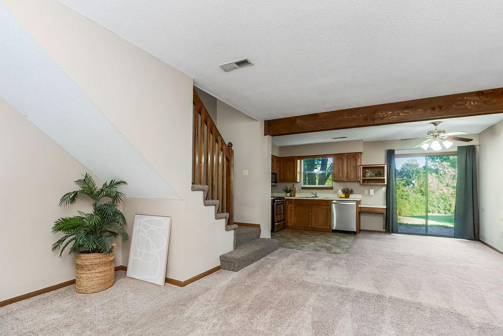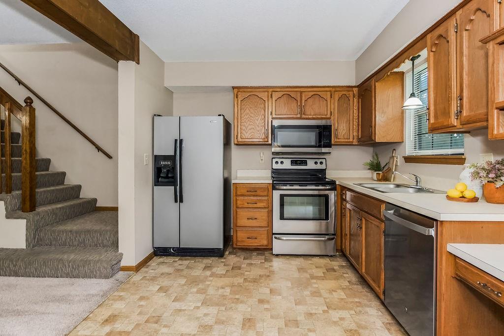 Don’t miss your opportunity to own this beautiful townhouse in the heart of Lee’s Summit! Step inside to a welcoming living room with a cozy corner fireplace—perfect for relaxing evenings. The kitchen shines with sleek stainless steel appliances, generous cabinetry, and a bright breakfast nook that opens to the back patio. A convenient half bath completes the main level. Upstairs, you’ll find a spacious primary bedroom with vaulted ceilings and private access to the full hall bath, which offers a large vanity, linen closet, and shower/tub combo. Both bedrooms include ceiling fans, large closets, and window blinds for added comfort. Enjoy your own one-car garage and extended driveway, too! The HOA covers lawn care, trash, and exterior maintenance (studs out), while owners insure the interior. The roof is just five years old! All of this in a prime location—minutes from vibrant downtown Lee’s Summit with shopping, dining, and entertainment, plus quick highway access for commuters. Schedule your showing today!