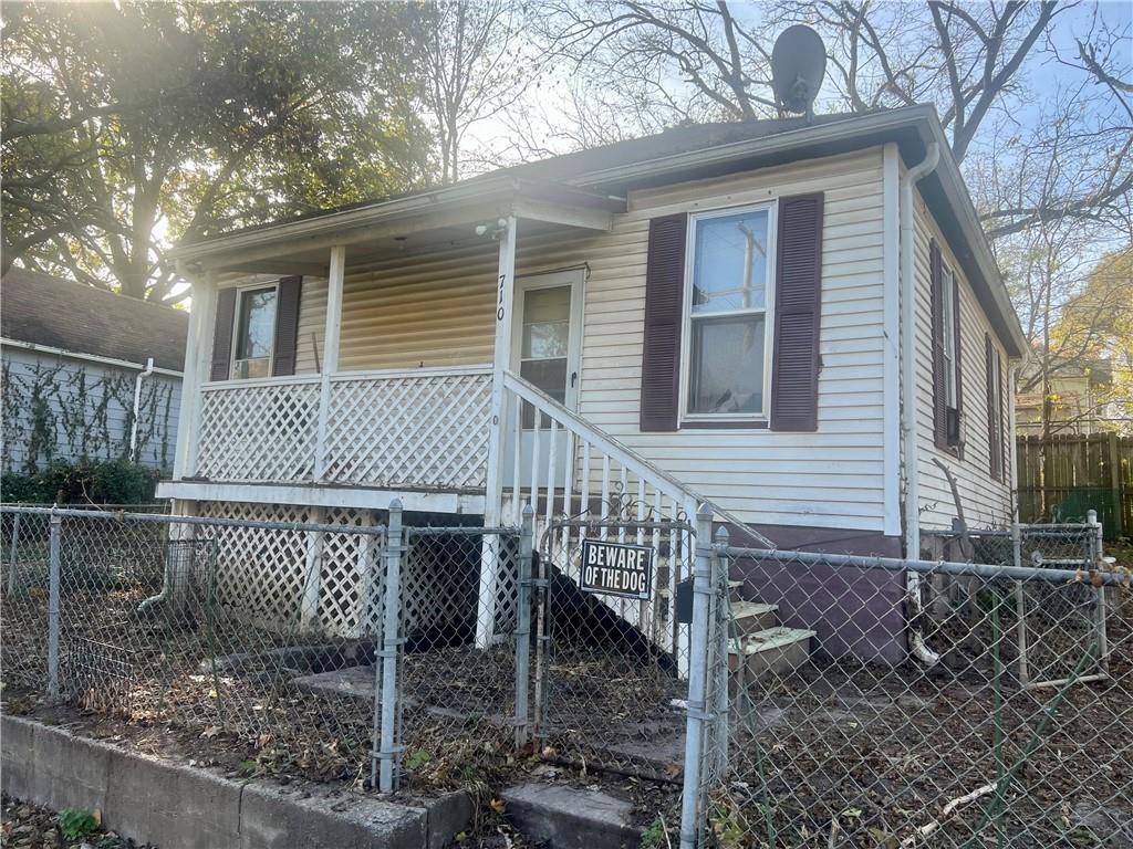 View of front of property featuring a fenced front yard, a gate, a porch, and stairs
