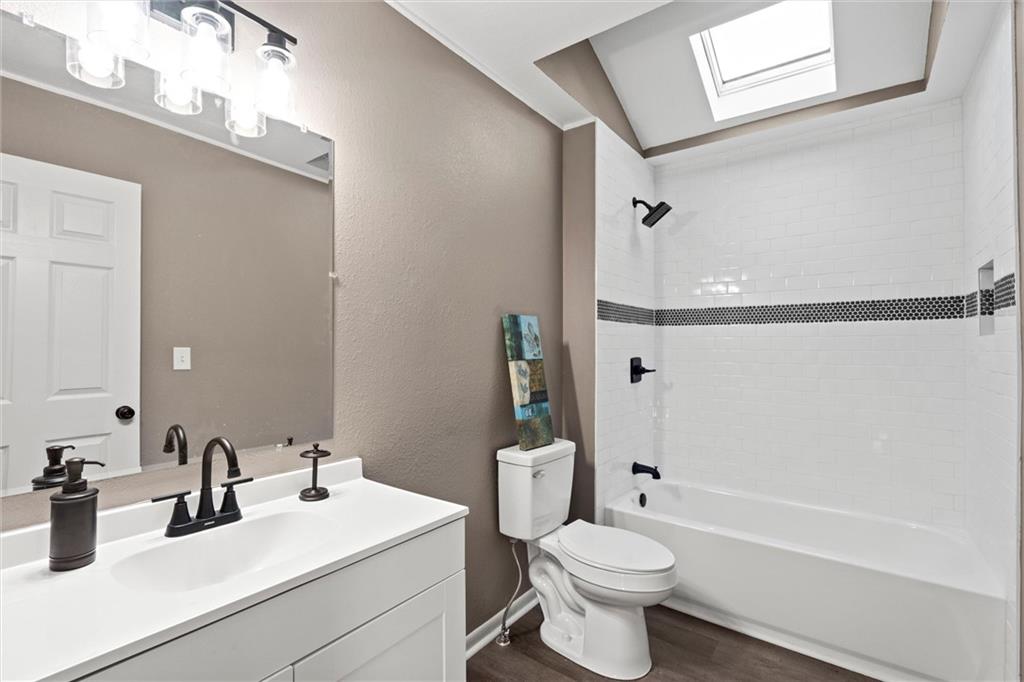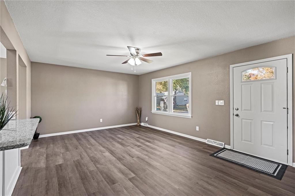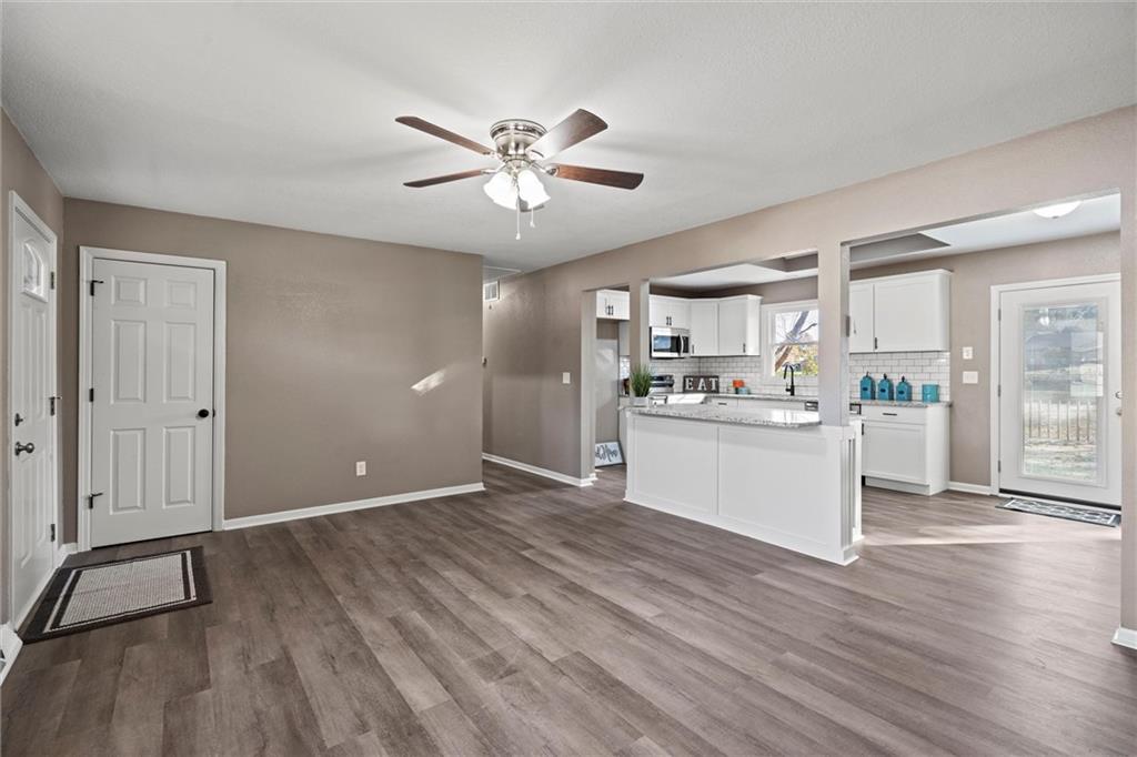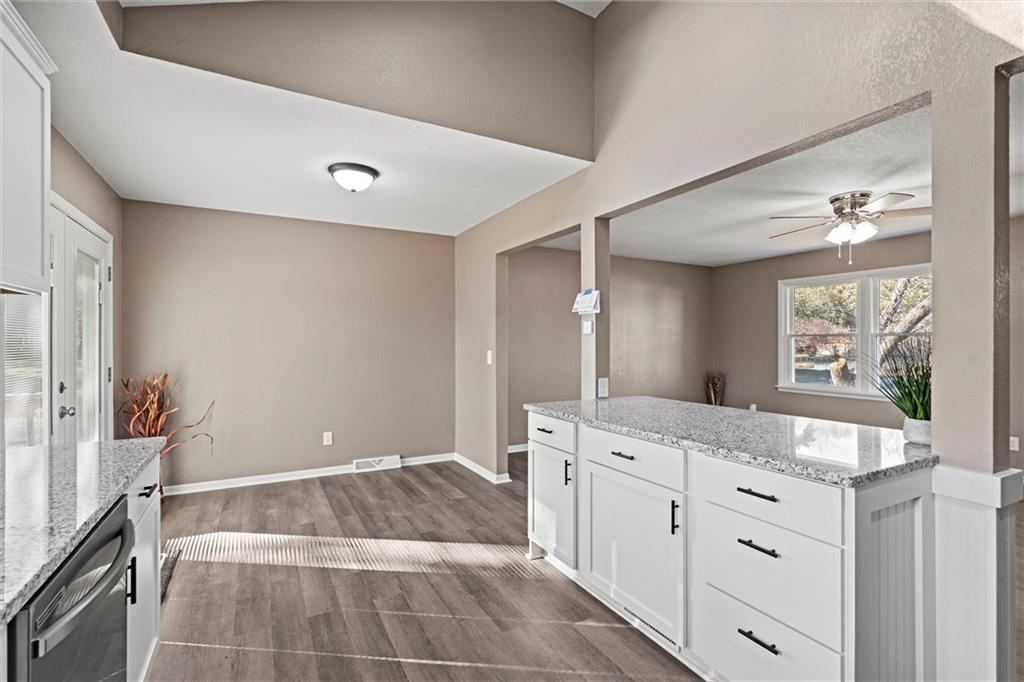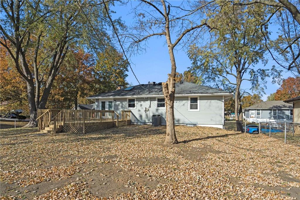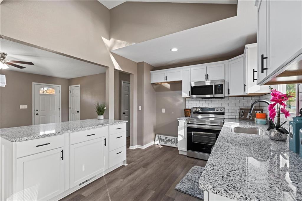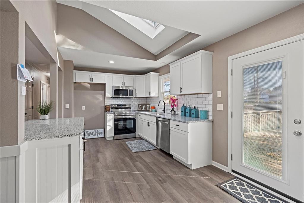 Step inside this beautifully updated home featuring a spacious living room and a rare open-concept kitchen — perfect for entertaining! The kitchen showcases brand-new shaker cabinetry, granite countertops, a subway-tile backsplash, stainless steel appliances, and ample counter space for cooking and gatherings. You’ll find three comfortable bedrooms and a fully remodeled bathroom with an updated vanity, a tiled tub/shower combo, and a skylight that fills the space with natural light. Head downstairs to a versatile media or lounging area and a second fully remodeled bathroom, ideal for guests or family movie nights. Step outside to a massive deck overlooking an even larger fenced backyard — perfect for kids, pets, or entertaining outdoors. With maintenance-free vinyl siding and energy-efficient vinyl windows (2017), roof only 11 years old, there’s truly nothing left to do but move right in!