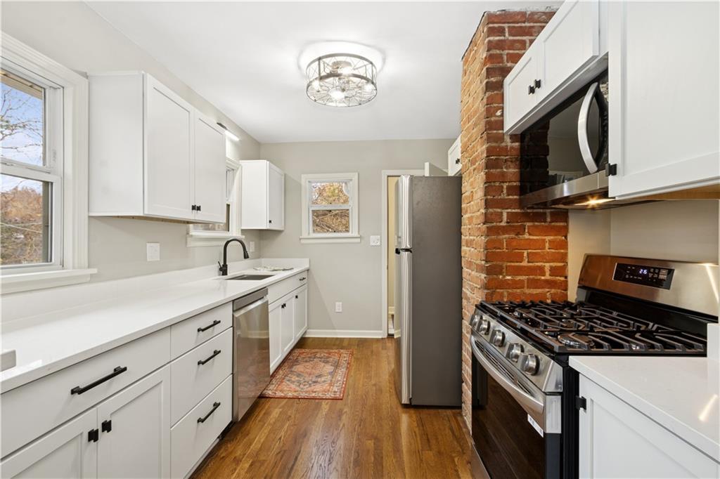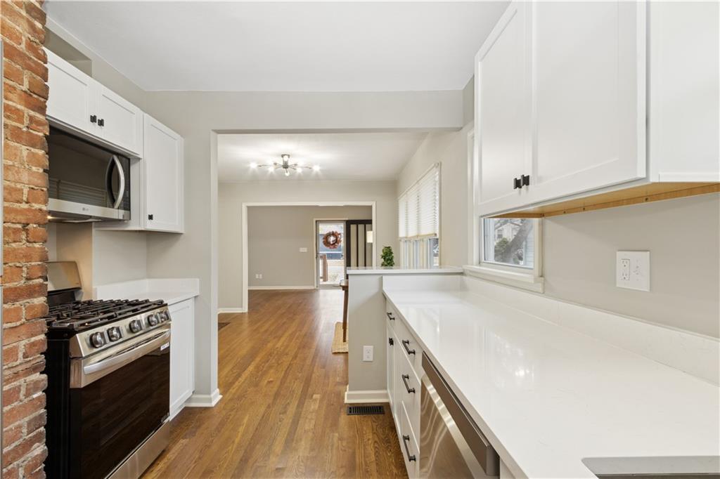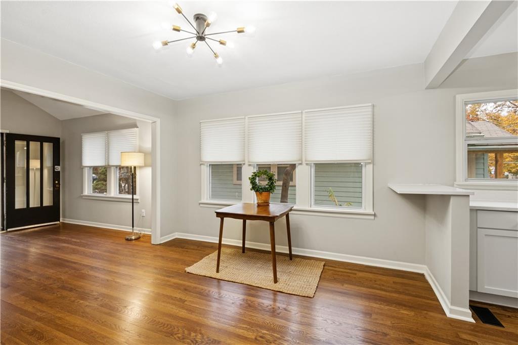 Charming East Brookside bungalow with so many great updates including new HVAC. This 2 bedroom 1 bath home is so fresh and pretty. You'll be welcomed by the cozy, covered front Porch. The entire interior is freshly painted with lovely neutral colors for any décor choices. Refinished hardwoods floors throughout are stunning. The living room and dining room are graciously sized. Here is the WOW! Full kitchen renovation including; new cabinets, stainless steel appliances, quartz countertops, and lighting. There is an inside drop area by the back door for coats and backpacks. Sturdy back steps lead to a fenced yard. The basement is home to a 1 car garage, laundry room and great storage. The back of the shared driveway is private with parking room for an additional car. This home is surrounded by wonderful shops and restaurants - Brookside, Crestwood and Morningside Plaza. Near UMKC and Rockhurst College. It is a gem - don't miss it!