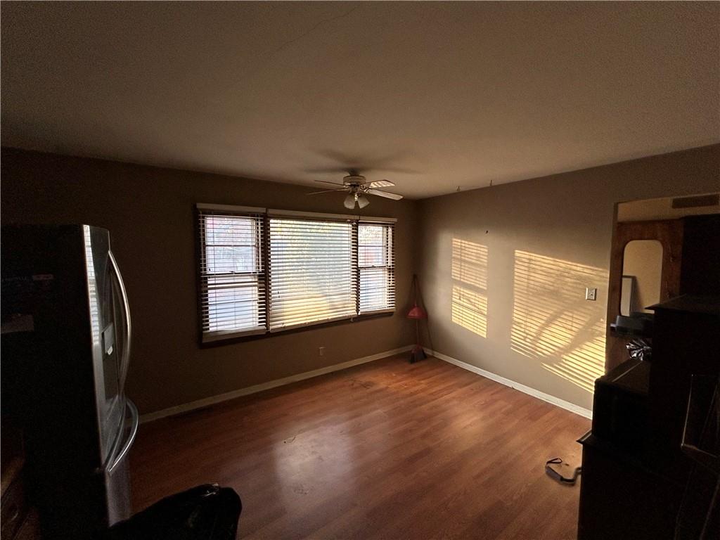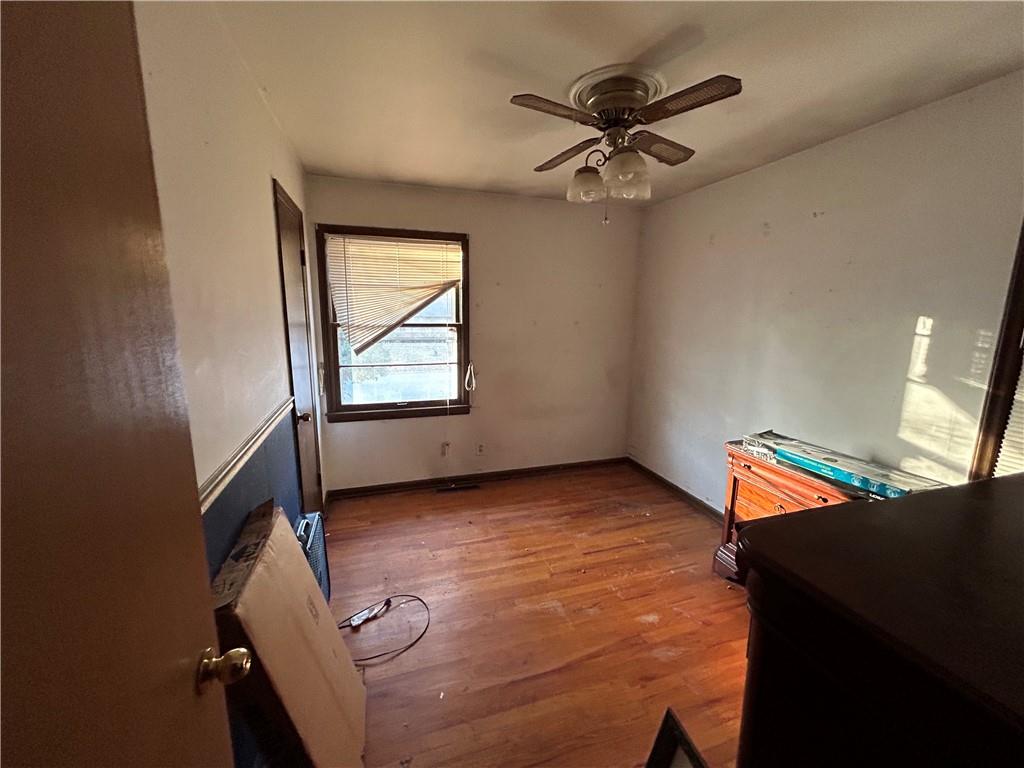Unfurnished bedroom with wood finished floors and ceiling fan