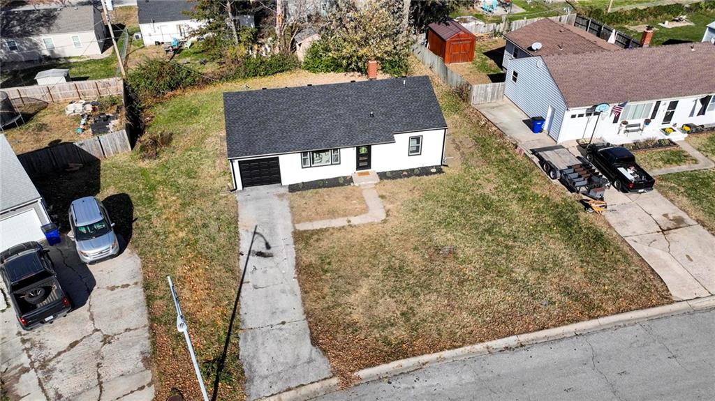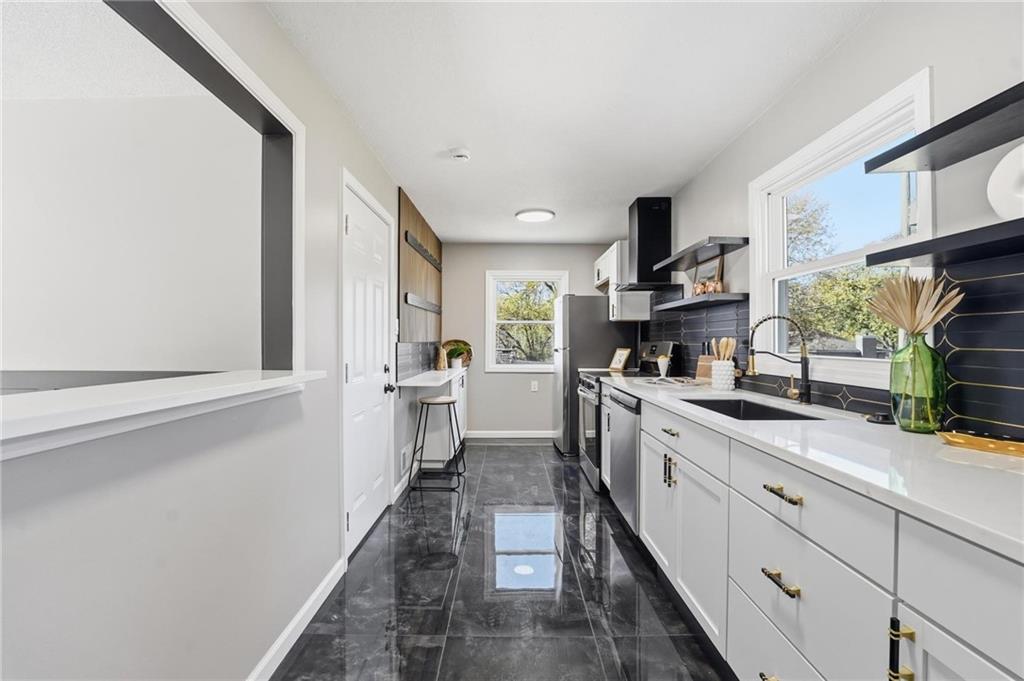 Beautifully Renovated Ranch in the Heart of the Northland! This fully updated 3-bedroom, 2-bathroom ranch-style home offering modern finishes, timeless design, and unbeatable convenience in Kansas City’s Northland. Recent exterior improvements include new siding, new windows, and a new roof, providing long-term peace of mind and excellent curb appeal. Inside, a bright and inviting living space features refinished hardwood floors, fresh neutral paint, and updated trim and hardware for a clean, cohesive feel. The stunning designer kitchen serves as the centerpiece of the home, showcasing sleek black tile accents with gold detailing, quartz countertops, open shelving, new stainless steel appliances, and upgraded cabinets and hardware. The dining area sits just off the kitchen for easy everyday living and entertaining. Both bathrooms have been fully remodeled, featuring modern tilework, stylish lighting, and high-quality fixtures. All three bedrooms offer comfortable space with updated finishes throughout. The expansive unfinished basement is freshly painted and ready for storage, a workshop, or future expansion. A one-car garage and large driveway provide convenient off-street parking. Outside, the freshly painted concrete patio offers a perfect spot for outdoor dining and relaxation. Located minutes from dining, shopping, schools, and major highways, this home blends style, comfort, and location into one incredible opportunity. Don’t miss your chance to own this beautifully updated Northland ranch!