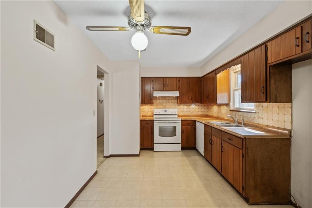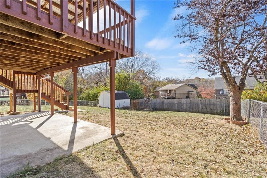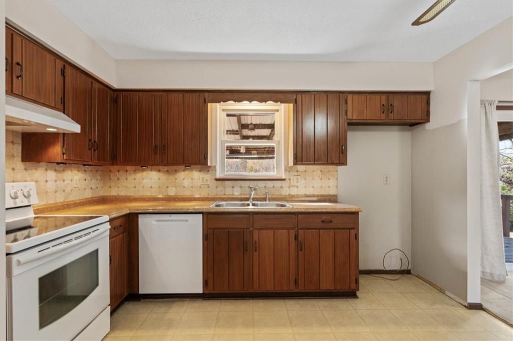 Lovingly maintained by the same owner for forty-two years, this home carries the kind of care and consistency that’s hard to find today. The vaulted living room with exposed beams welcomes you inside and flows into a bright dining area that opens onto a large covered back deck—an ideal spot for grilling, entertaining, or unwinding while overlooking the fenced yard. The kitchen is clean, functional, and has nice updates like under cabinet lighting and newer appliances. All three bedrooms sit on the main level, including a primary suite with its own full bath. The lower level offers a warm second living area anchored by a full brick fireplace, complemented by classic wood paneling in excellent condition. It’s a perfect space for movie nights, hobbies, or a playroom, with a convenient half bath and laundry nearby. Outside, the backyard includes a storage shed, ample green space, and both a covered deck and a patio area beneath it for extra outdoor living. Just beyond the yard, you’ll find access to the neighborhood walking trails—part of the local path network that winds through nearby parks and greenways. The exterior updates also includes a brand new roof in 2025! And with Mahaffie Elementary just around the corner plus quick access to shops and highways, this location fits everyday life remarkably well.
