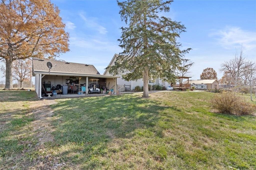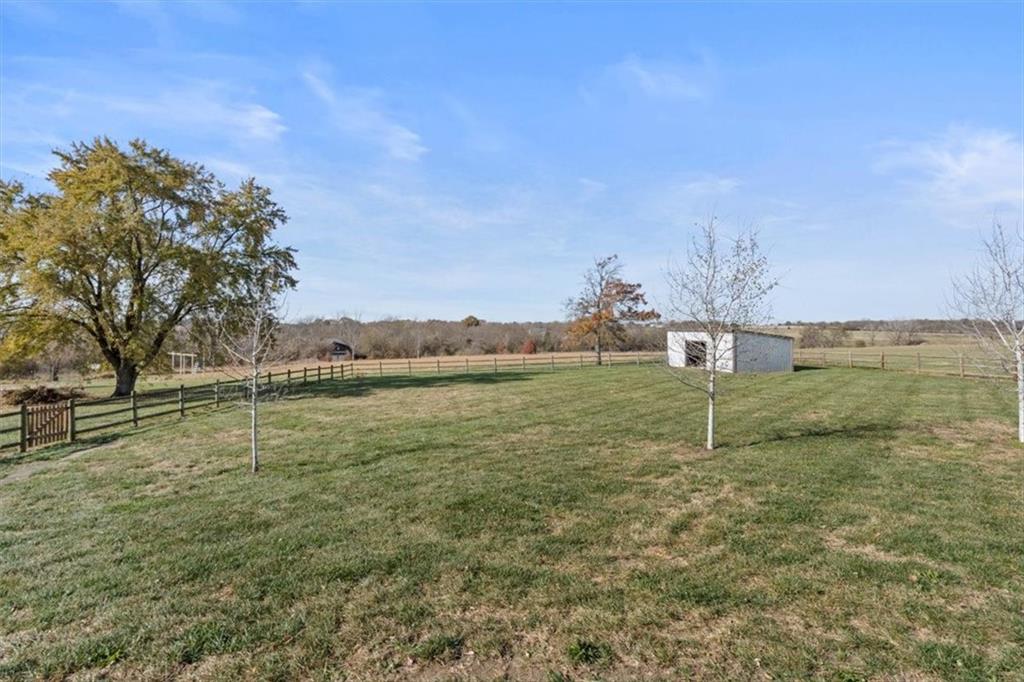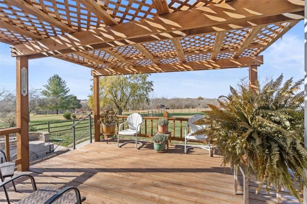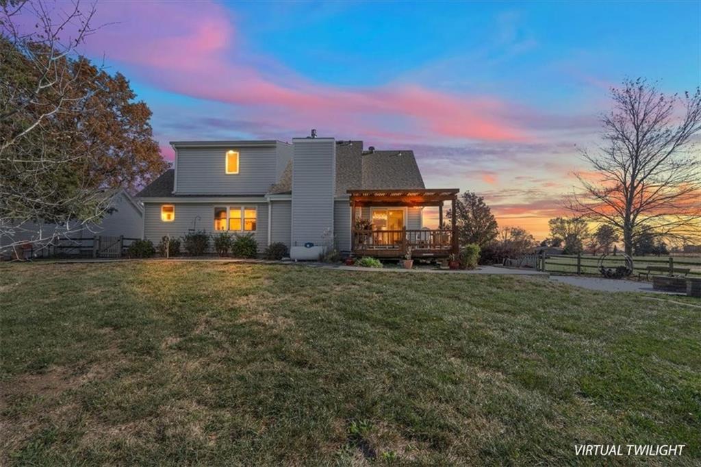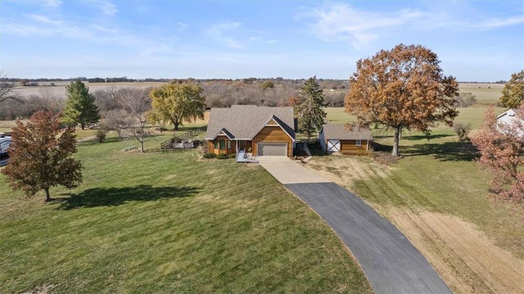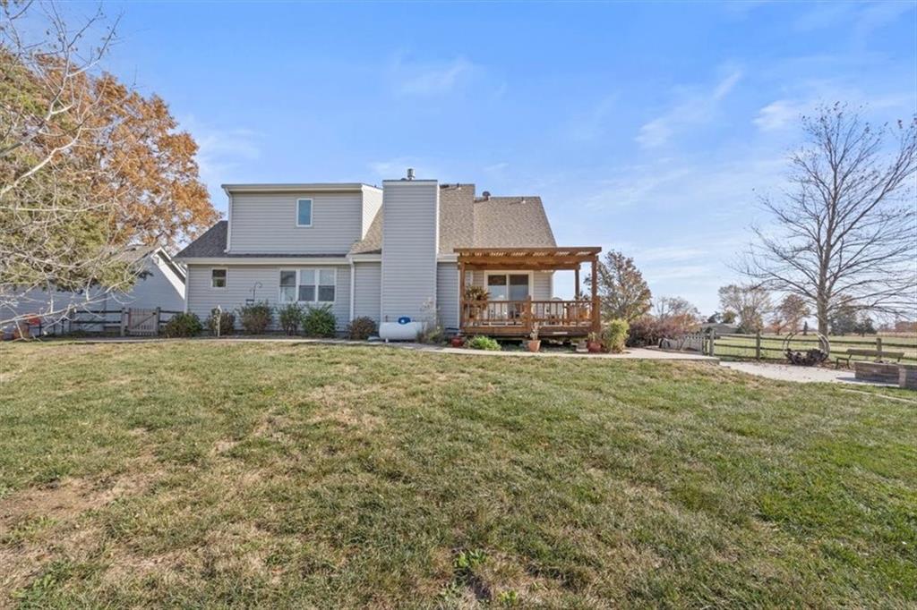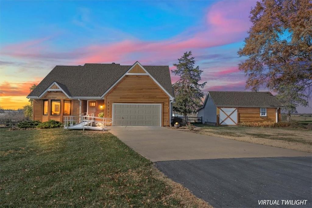 Experience the perfect blend of country charm and modern convenience in this 1.5-story Gardner home, nestled on 3.3 level acres with a long, picturesque driveway. Beautiful stained wood siding gives the home a warm, inviting country feel. The main floor features an updated kitchen with custom cabinetry, granite countertops, and stainless steel appliances. The eat-in kitchen boasts two pantries—a custom cabinetry pantry with pull out shelving and a double closet pantry conveniently located in the hallway leading to the dining room. A laundry closet is also tucked into this hallway for added convenience. The spacious family room impresses with a vaulted ceiling and an open area to the second floor, creating a bright, airy atmosphere. A gas fireplace adds warmth and ambiance, while the adjacent dining area overlooks the backyard, deck and oversized patio with fire pit, ideal for outdoor gatherings. The main floor master suite easily accommodates a king-size bed with plenty of additional space. The ensuite bath has 2 large closets and a linen closet. Upstairs, you’ll find three generously sized bedrooms and a stylishly renovated full bath. The unfinished walk-up basement offers incredible potential to create additional living space tailored to your vision. Just steps from the driveway is a small 23’x18’ barn or workshop with a door wide enough to store a vehicle. attached to the back of the barn is lean to style covered open storage. There is an additional shed in the back as well. This home perfectly captures country living while keeping the conveniences of the city close by—a rare find in Johnson County. Enjoy the peace and privacy of a spacious, rural setting, while still being just minutes from shopping, dining, schools, and all the amenities the city has to offer. It’s the best of both worlds—your own country retreat without sacrificing modern convenience. *The ramp is not permanent and the sellers can remove upon request*