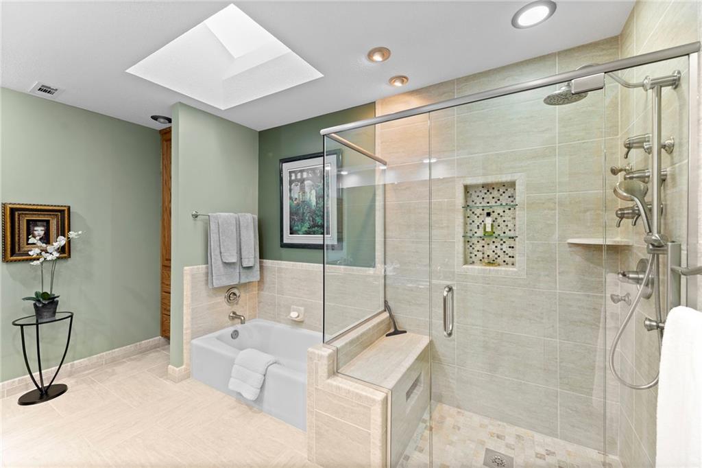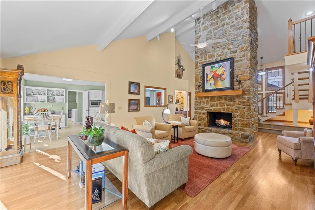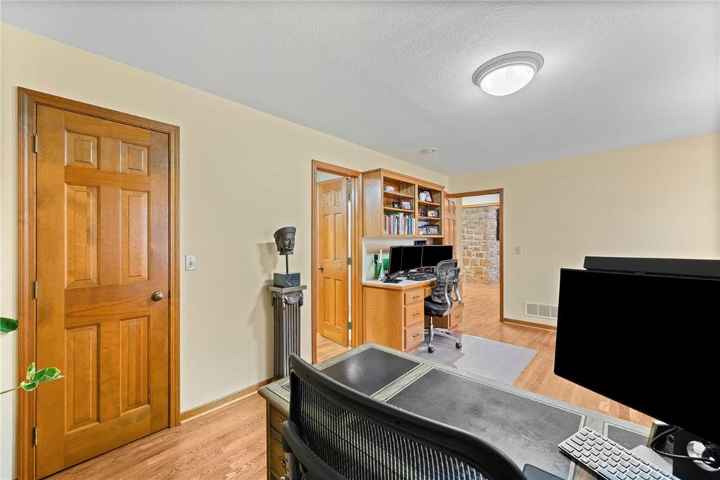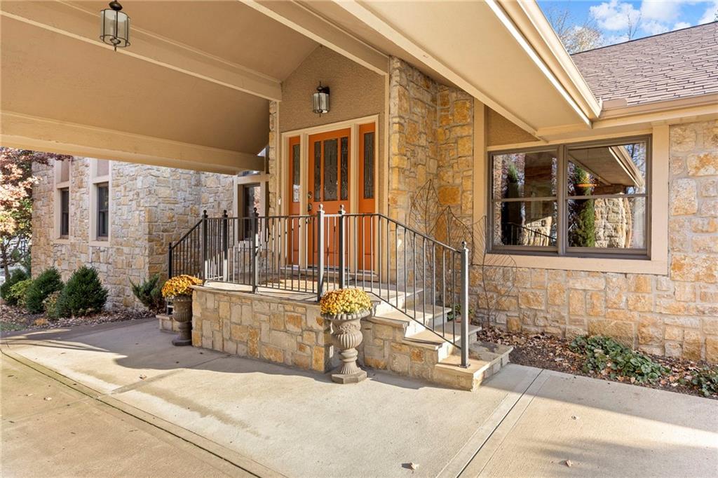 PRAIRIE LODGE ELEGANCE with luxury upgrades and prime Kansas City location. Architecturally unique home on a private, picturesque dead end street in prized Claymont Estates has the perfect blend of rustic charm and modern upgrades. From the moment you arrive, the impressive stone and stucco exterior, circle drive with portico parking, and exquisite plantings set a warm and inviting tone. The only other homes you see are all unique and prestigious but you are only minutes from the heart of Kansas City, the airport and the new Morton Salt entertainment venue in Riverside. And there is NO earnings tax in Gladstone! Soaring vaulted ceilings and a massive stone fireplace anchor the open living area, complimented by a dramatic window wall that fills the space with light. Gleaming oak floors flow throughout, while built-ins provide both character and storage. Enjoy your coffee and paper in the library with floor to ceiling windows overlooking the peaceful garden. Ascend the floating staircase to a serene master suite with a steam shower, heated floors, and an expansive walk-in closet. As a mater of fact, every bedroom has a walk-in closet. The second upstairs bedroom is 19X12. Two more ample sized bedrooms are located on the ground floor. Need even more bedrooms? Configuring them in the light, airy finished basement would be easy and there is an unfinished room at the base of the steps already roughed-in for a bath. Step outside the basement family room, through the new Anderson doors to the stamped concrete patio. Then to the backyard oasis, professionally curated by a Master Gardener, boasting lush landscaping and tranquil privacy. The new $35,000 composite deck with electric canopy on the main living room level will welcome all of your guests to enjoy the view also. There is also a backyard door out of the laundry so that area can double as space for plants, has a dog bathing shower pan, and enough cabinetry for event staging. Zoned heating, 1-yr-old roof.