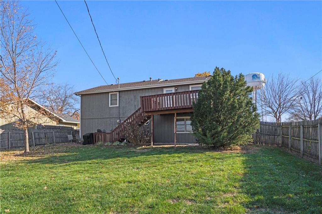 The moment you open the front door, the bright, vaulted living room steals the show. Natural light pours across the space, highlighting a layout that feels open, comfortable, and instantly the house you'll want to call home. The kitchen is finished with white cabinetry, granite countertops, stainless steel appliances, and a modern tile backsplash, flowing into the dining area and offering an open view of the living room below. The hallway bathroom has direct access to the primary bedroom and includes a dedicated sink and vanity inside the suite—an ideal setup that adds privacy and everyday convenience. Two additional bedrooms complete the upper level, while the lower level offers a generous rec room that’s perfect for a second living space, hobby room, or home gym, along with a combined laundry and full bath. Outside, enjoy an elevated deck overlooking the spacious fenced yard, plus a patio area ready for grilling or gatherings. Beyond the home itself, the location can't be beat! Tonganoxie Elementary and Middle School are just around the corner, and everyday essentials like parks, grocery stores, and downtown shopping are just minutes away. It’s a spot where daily life feels organized, connected, and comfortable.