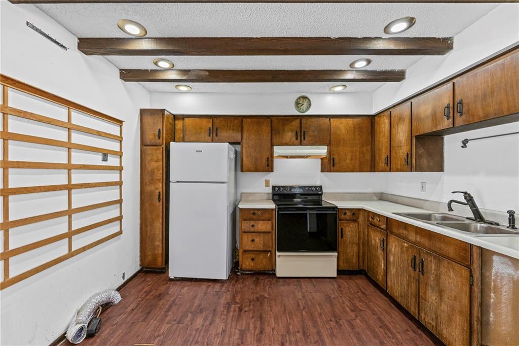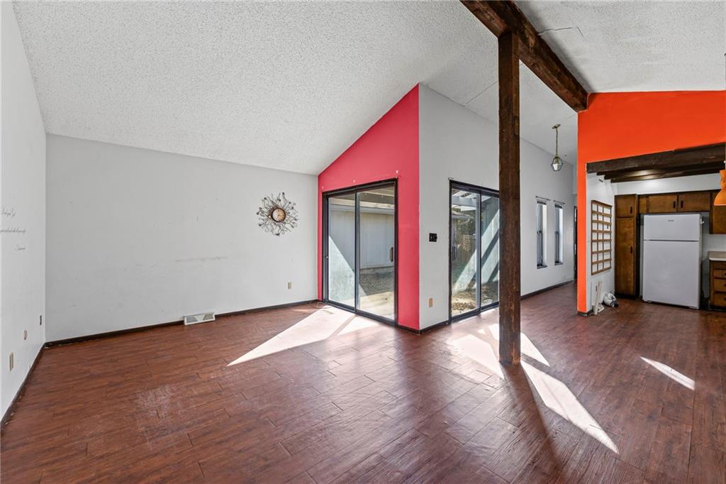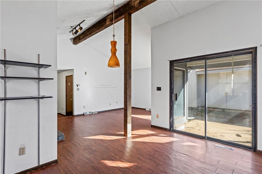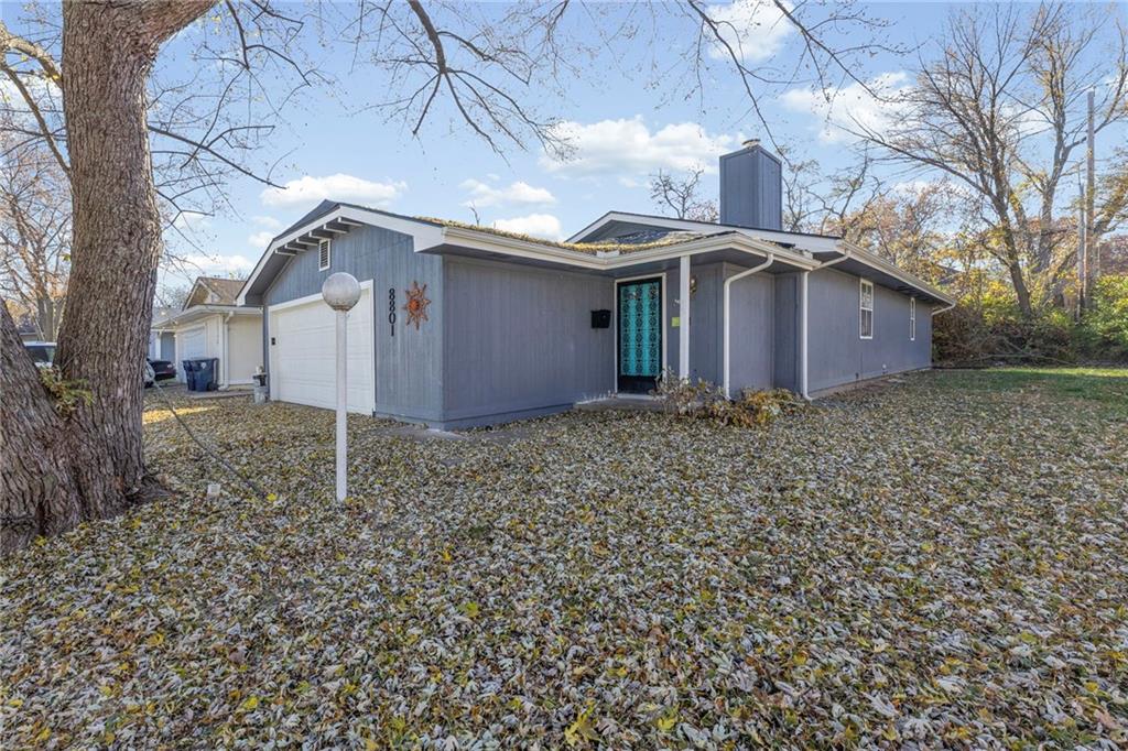 Cozy and full of character, this 2 bedroom, 2 bath ranch at 8801 E 109th is ready for its next chapter. Step inside to a vaulted great room with exposed wood beams, stone fireplace, and wood-look floors that give the space a warm, inviting feel. Large windows and a sliding glass door let in tons of natural light and walk out to the backyard. The spacious eat-in kitchen offers abundant cabinet and counter space, plus room for a dining table or island and sight lines back toward the living area—perfect for everyday living or entertaining. Down the hall you’ll find a comfortable primary bedroom with its own bath, a second bedroom, and an additional full bath. Outside, mature trees and a generous yard provide space for pets, play, or a future patio or garden. Conveniently located in south Kansas City with quick access to shopping, dining, and highways, this home is a great opportunity to move in now and add your personal updates over time.