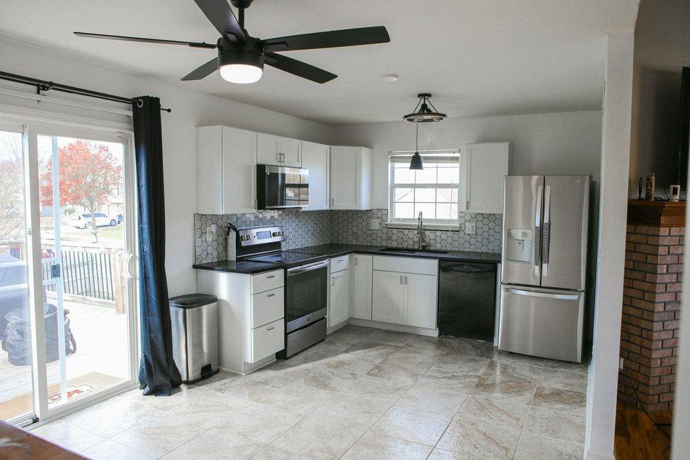 Beautifully updated home in the Northland with major improvements inside and out. The kitchen was fully remodeled in 2024 with quartz counters, new cabinets, tile floors, stainless-steel fridge, and a heat-sensing microwave. Updated lighting throughout the main level. The upstairs bath features modern black fixtures, new tub/shower hardware, and a new exhaust fan/light. Roof replaced in 2024. Exterior upgrades include new solar driveway lights, black shutters, railing, perennials, pavers, mulch, and a privacy-fenced walkout. Yard has been professionally treated and aerated. Garage offers a built-in workbench, shelving, keypad, and wiring for Google Fiber and Vivint. Quiet neighborhood close to schools, shopping, highways, and just 11 minutes from KCI. FSBO and move-in ready.