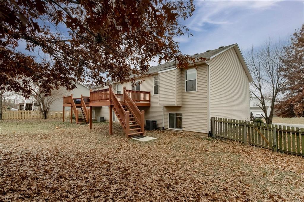 Move-in ready and updated with new roof, fresh paint, new flooring, new epoxy floors in garage, new lighting, newer A/C. Great layout with a large primary suite and walk in closet. Primary bath has dual vanities and sinks with separate shower/tub. Kitchen cabinets have been freshly painted. Fridge stays! Guest bath also has dual vanities. Vaulted ceilings, fireplace, hardwood and ceramic tile floors, new carpet, thermopane windows. Huge fenced yard, re-stained deck, maintenance free exterior. Built-in garage shelving. Awesome location close to highways and conveniences in the award winning Olathe school district.
