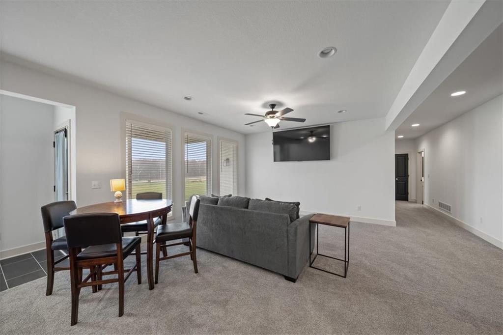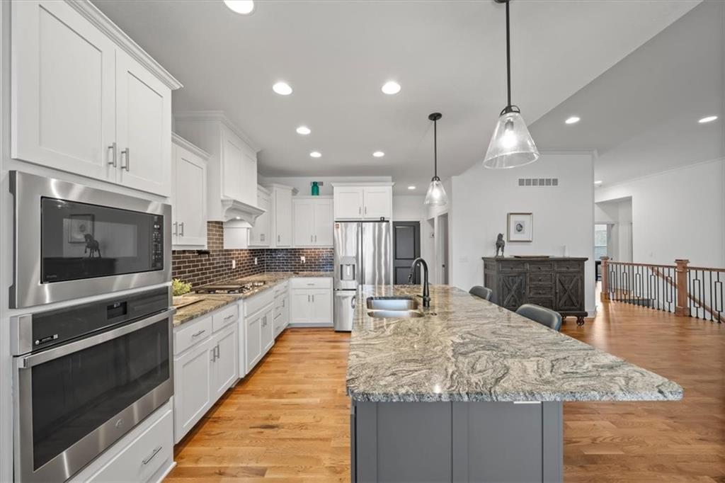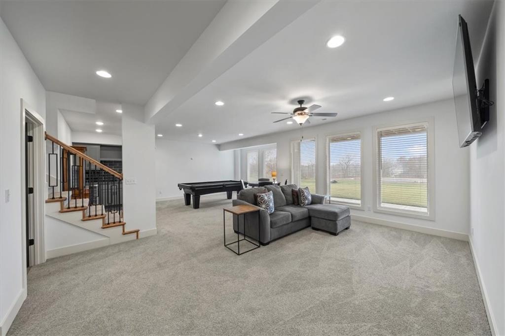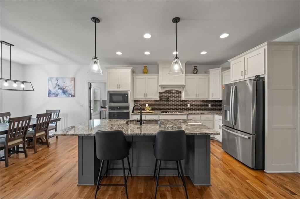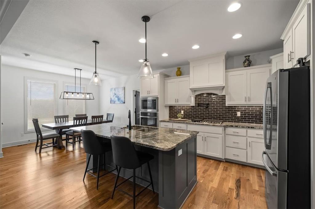 Stunning Reverse One-and-a-Half Home with Premium Upgrades Main Level Features This impeccably and lovingly maintained reverse one-and-a-half home showcases a wealth of upgrades throughout the main level. Step onto the stupendously large front porch, perfect for leisure and gazing at the surroundings. Inside, sunlight pours into the foyer, which towers above beautifully maintained hardwood floors found throughout the main living areas. All bedrooms are equipped with walk-in closets, providing ample storage space. One of the bedrooms offers flexibility and can be used as a home office. The open-concept living room and dining room create a relaxing atmosphere, seamlessly connected to a screened deck that overlooks a tranquil nature reserve and trail. The kitchen features upgraded granite and quartz countertops, complemented by abundant cabinetry, stainless steel appliances, and a convenient pot filler. A vent hood is designed for outside ventilation, enhancing the kitchen's functionality and appeal. Lower Level Amenities Descending to the walk-out basement, you will find a spacious family room and a wet bar, ideal for entertaining. The ground-level patio extends the living space outdoors. Two Jack and Jill bedrooms each include sinks for added convenience, and two built-in bookcases provide space for displays or storage. The additional fully finished recreational room offers additional versatility, accompanied by a separate finished gym and a storage room. There is also a partially finished storm shelter adjacent to another partially finished storage room for added safety and utility. Outdoor Space The property is complemented by a large backyard, perfect for relaxation, play, or enjoying the natural surroundings.
