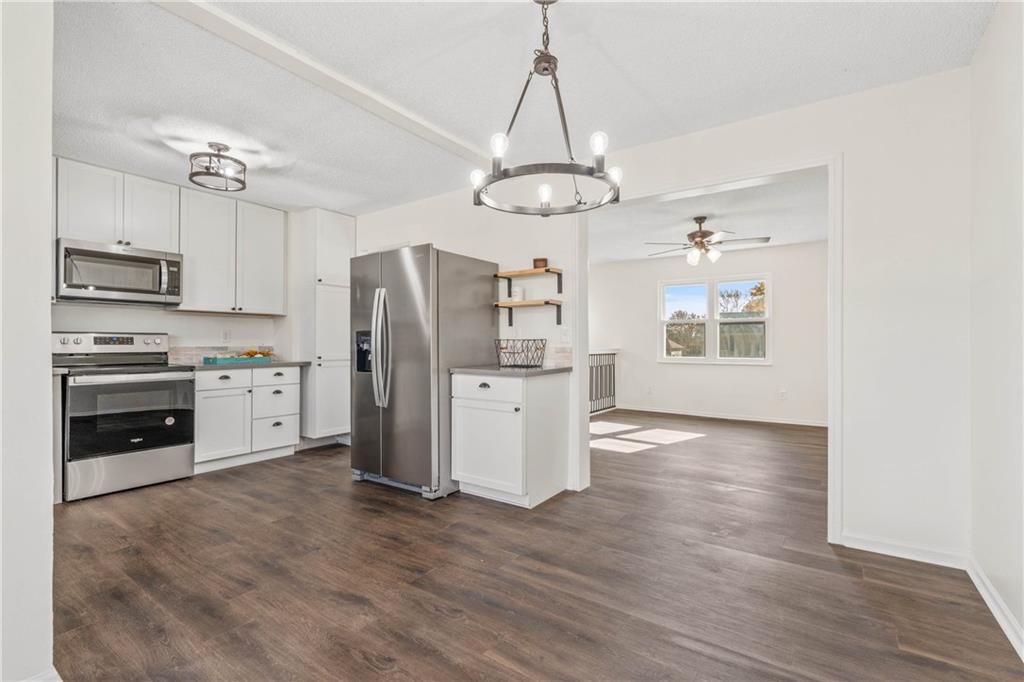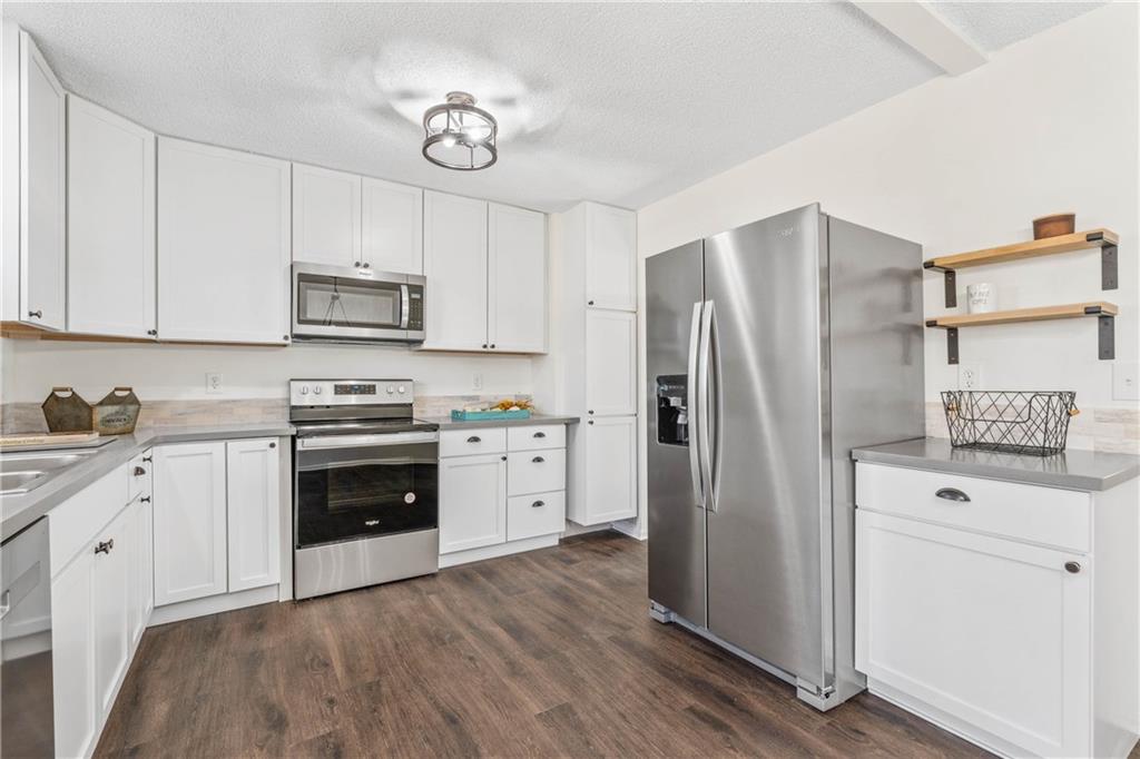 This charming 3 bedroom, 1 and 1/2 bath home features a split entry design. The heart of the home is a newly remodeled kitchen, boasting sleek stainless steel appliances and durable, solid surface countertops. A cozy coffee nook provides a perfect spot for morning routines. New flooring throughout brings a cohesive, modern look, and the bathrooms have been updated. The split level layout includes a bright main floor living area and lower level space perfect for a rec room or additional bedroom. The deck overlooks an extra large, fully fenced backyard, providing an area for recreation, gardening, and entertaining.