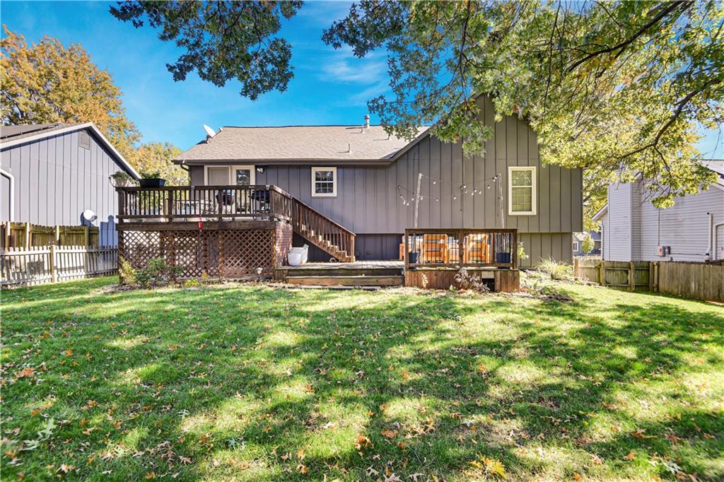 Welcome to 12838 Navaho Drive—perfectly positioned in a highly desirable Olathe location with quick access to nearby parks, shopping, restaurants, and major highways. Step inside to a warm and inviting main floor featuring a beautiful stone fireplace, built-in shelving, updated light fixtures, and sun-filled living and dining spaces. The kitchen impresses with stainless steel appliances, updated countertops, a pantry, and a window over the sink that frames a lovely view of the backyard. The dining area sits under a charming chandelier and opens directly to the multi-tiered deck, creating effortless indoor-outdoor flow—perfect for hosting gatherings, grilling, or enjoying fall evenings. Upstairs, the primary suite offers fresh paint, a large closet, and an attached bath with new flooring and a thoughtful layout separating the vanity area from the shower and toilet. The secondary bedrooms each feature ceiling fans and generous closets. The deep garage provides room for large vehicles plus extra storage. Head downstairs to a bonus living area complete with a bar, ideal for game nights or movie weekends. The stair carpet is new as of November of 2025. The basement also includes a large laundry area and a convenient half bath. Located in a fantastic neighborhood with top-rated schools, this home combines comfort, functionality, and unbeatable access to Olathe amenities. Just minutes from Black Bob Park, Heritage Park, the 151st Street shopping corridor, and easy connections to 69 Hwy, K-10, and I-35, this home offers convenience in every direction. A must-see!