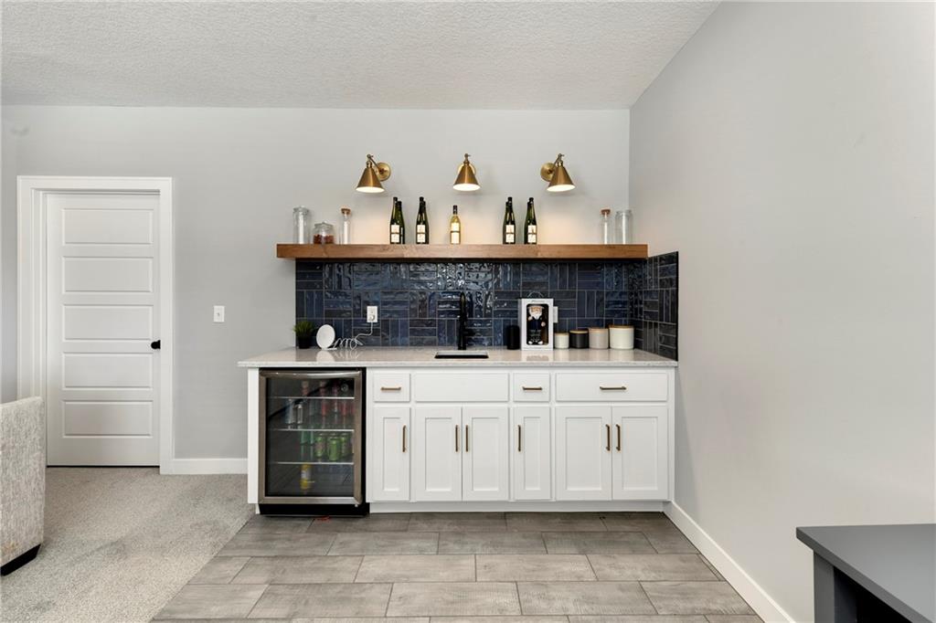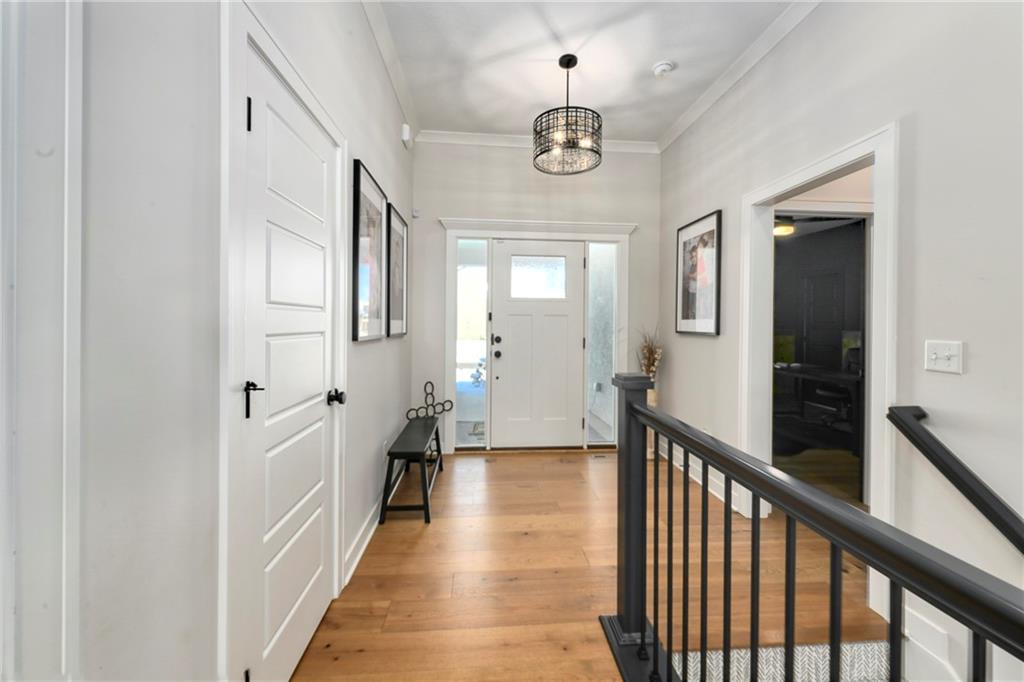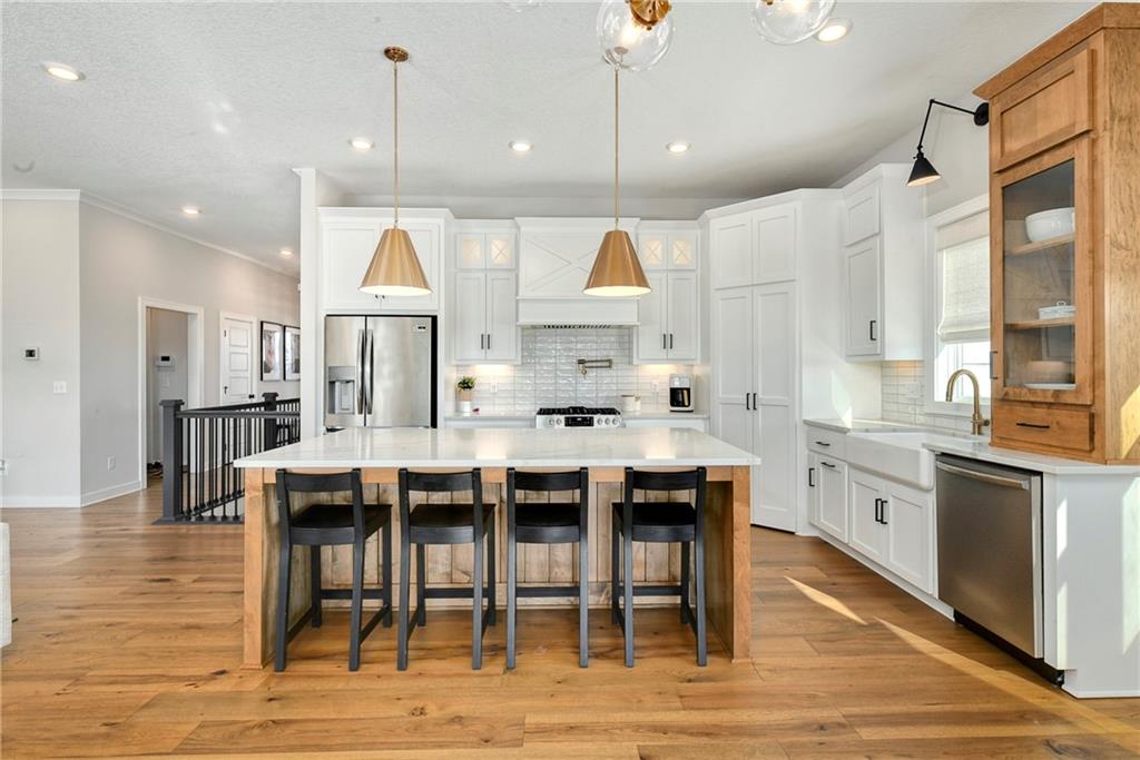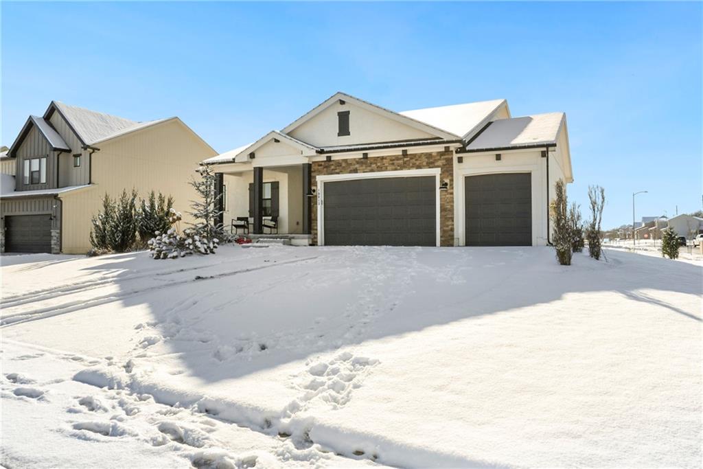 Immaculate 2-year-old Reverse Ranch on a premium corner lot featuring a modern open layout, upgraded finishes, and exceptional indoor/outdoor living spaces. This former model home showcases a spacious great room with floor-to-ceiling stone fireplace, large windows for abundant natural light, and engineered hardwood floors throughout the main living areas. The designer kitchen includes quartz countertops, large center island w/ seating, upgraded trim, Gas Range w/Convection, pot-filler, stainless appliances, farmhouse sink, brushed brass fixtures, glass-door display cabinetry, and subway tile backsplash. The dining area flows seamlessly to the covered deck overlooking the fenced backyard. The primary suite offers a tray ceiling with wood plank detail, large windows, and a spa-inspired bath with dual quartz vanities, upgraded lighting, a walk-in tile shower with bench, herringbone accent wall, and matte black fixtures. The oversized walk-in closet connects conveniently to the laundry and mudroom w/ built-in drop zone. Additional main-level bedrooms include upgraded lighting & modern wall accents along with attractive wood finishes in the vanity and matching mirror. A second full bath features contemporary vertical tile and updated finishes. The finished lower level provides a generous second living area with recessed lighting, plush carpet, & a wet bar with custom backsplash. Additional bedroom & full bath offer flexibility for guests or extended living arrangements. The unfinished portion is plentiful too, providing value add for future finished space or great storage as it sits. Outdoor features include a covered deck, fully fenced yard with wrought iron fencing, and ample space for recreation. The climate-controlled garage is ideal for storage, hobbies, or year-round comfort. Additional upgrades include premium lighting throughout, wainscoting and trim accents, energy-efficient windows, & a clean modern color palette. Move-in ready and well maintained.