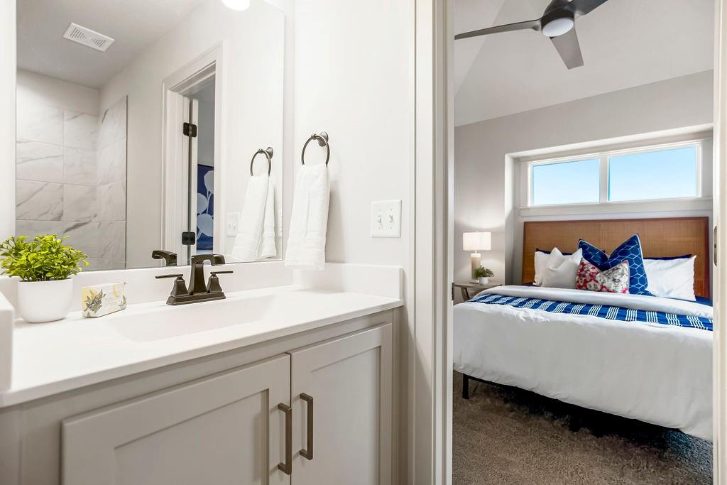 Located on a quiet cul-de-sac street in Stonebridge South, this Middleton II.I by Hilmann Home Building offers a functional 5-bedroom, 4-bath layout with detailed trim work throughout, including wainscoting in the entry, dining area, upper hallway, and primary bath, plus a trimmed feature wall in the primary suite. A front flex room with French doors provides a dedicated office or optional bedroom. The kitchen features quartz countertops, gas cooktop, under-cabinet lighting, walk-in pantry, and an oversized island that opens to the vaulted dining area with rear windows. The great room includes a modern fireplace with floating shelves and abundant natural light. A main-level full bath adds flexibility for guests or multi-use space. The upper level includes a primary suite with tray ceiling and shiplap inset, freestanding tub, Euro-style shower, dual vanities, and a signature walk-in closet with windows and built-ins. Three additional bedrooms include one en-suite and a Jack-and-Jill bath, plus a bedroom-level laundry room with folding counter and cabinetry. Outdoor living includes a covered deck with backyard access. The lower level can be finished now, offering options for expanded living or recreation space. Residents enjoy Stonebridge amenities including four zero-entry pools, two clubhouses with fitness facilities, playgrounds, sports courts, and sand volleyball areas. Heritage Park is approximately 0.5 miles away, offering a 40-acre lake, off-leash dog area, golf course, disc golf, athletic fields, picnic shelters, and trails. Served by Spring Hill Schools: Timber Sage Elementary (~1.8 miles), Woodland Spring Middle School (~2.5 miles), and Spring Hill High School (~3.0 miles). Shopping, dining, services, and highway access are nearby. Estimated completion date late March 2026. Photos are of a previous build. Taxes and square footage are estimated. Buyer/Buyer agent to verify.