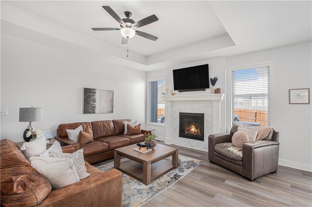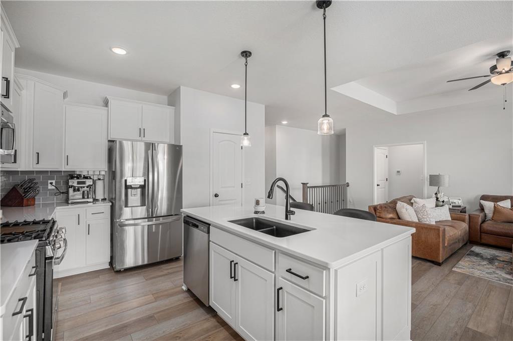 Why settle for new when you can embrace the elegance of this beautifully upgraded home, built in 2022. Step inside to discover a light, bright, and airy ambiance that creates an irresistible invitation to unwind and relax. This stunning residence features 4 spacious bedrooms and 3 full baths, complemented by an attached two-car garage and a fully fenced, beautifully landscaped yard that offers both privacy and curb appeal. As you enter through the front door, you'll be greeted by soaring high ceilings, gleaming wood floors, and an open floor plan that seamlessly flows throughout. The heart of the home is the expansive white kitchen, showcasing luxurious quartz countertops and a chic grey tile backsplash. The oversized island provides additional seating, while a walk-in pantry, gas stove, and stainless steel appliances complete this chef’s paradise. The kitchen elegantly opens to a sunlit living room adorned with a tiled fireplace, floor-to-ceiling windows, and a charming dining area featuring an accent wall that adds character and warmth. Your primary suite is conveniently located on the main level, offering a generously sized bath with a double vanity, a spacious shower, and a walk-in closet that dreams are made of. Two additional bedrooms and a full bath are also located on the main floor, ensuring comfort and convenience. Don’t forget the thoughtfully designed laundry and mudroom, situated off the primary suite. Venture downstairs to the amazing newly finished lower level, where a cozy family room awaits, complete with a newly installed wet bar, a full bedroom, and an additional bathroom. There’s even an unfinished storage space for all your organizing needs! Step outside to an extended patio surrounded by a privacy fence, making this yard a perfect 10 out of 10. Nestled in the highly sought-after Platte County School District, this home is part of a vibrant community that offers a pool, playground, and scenic trails.