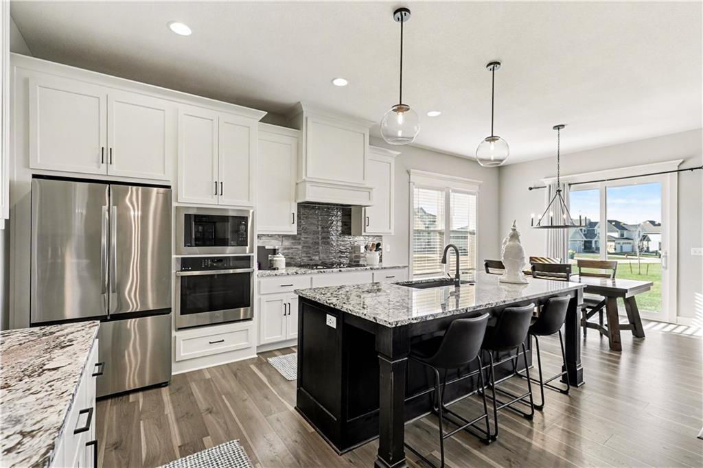 Why buy new when you can get the best value in the neighborhood right here? This stunning reverse 1.5-story is the total package—4 bedrooms, 3 baths, a 3-car garage, and just over 2600 square feet of beautifully maintained space that truly shows like new. Sitting proudly on a flat corner lot, this home greets you with an open floor plan, soaring ceilings, and incredible natural light that fills every room. The kitchen is a standout with its oversized island, abundant cabinetry, granite countertops, stylish backsplash, gas stove, and a walk-in pantry—perfect for everyday living or hosting a crowd. The kitchen flows seamlessly into the great room, complete with custom cabinets and built-ins framing the elegant tiled fireplace. Step out from the dining room onto the fully covered patio, ideal for morning coffee, evening cocktails, or game-day grilling. The primary suite is a retreat of its own with a walk-in shower, double vanity, and a massive closet. The laundry and mudroom are conveniently located right off the primary for easy living. A second bedroom and full bath round out the main level. Head downstairs to a spacious lower level featuring a huge family room, two additional bedrooms, and a full bath—plus an impressive amount of unfinished storage space you won’t want to miss. Located in Prairie Field, you’ll enjoy amenities like a community pool and scenic trails. This home has everything—style, space, value, and location. Don’t miss your chance to make it #1!