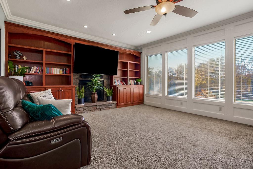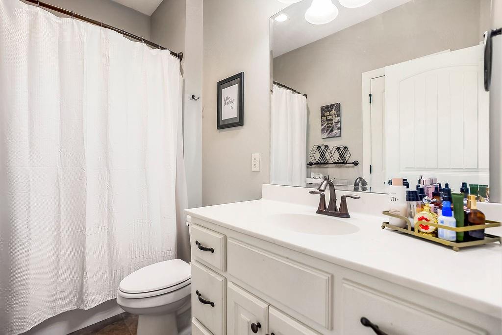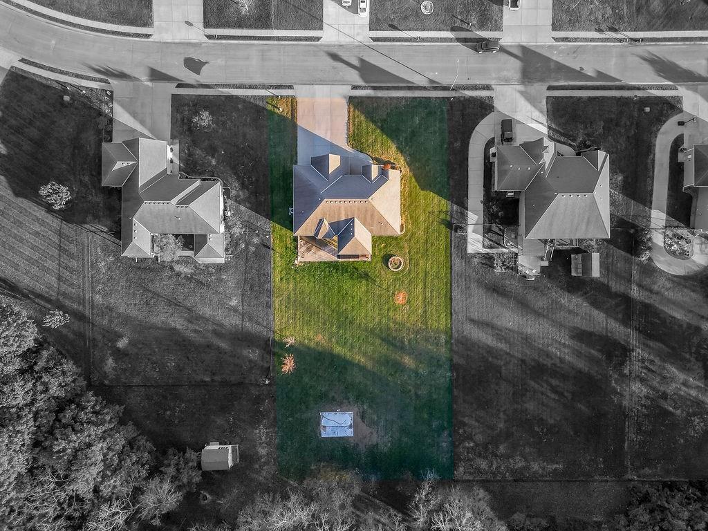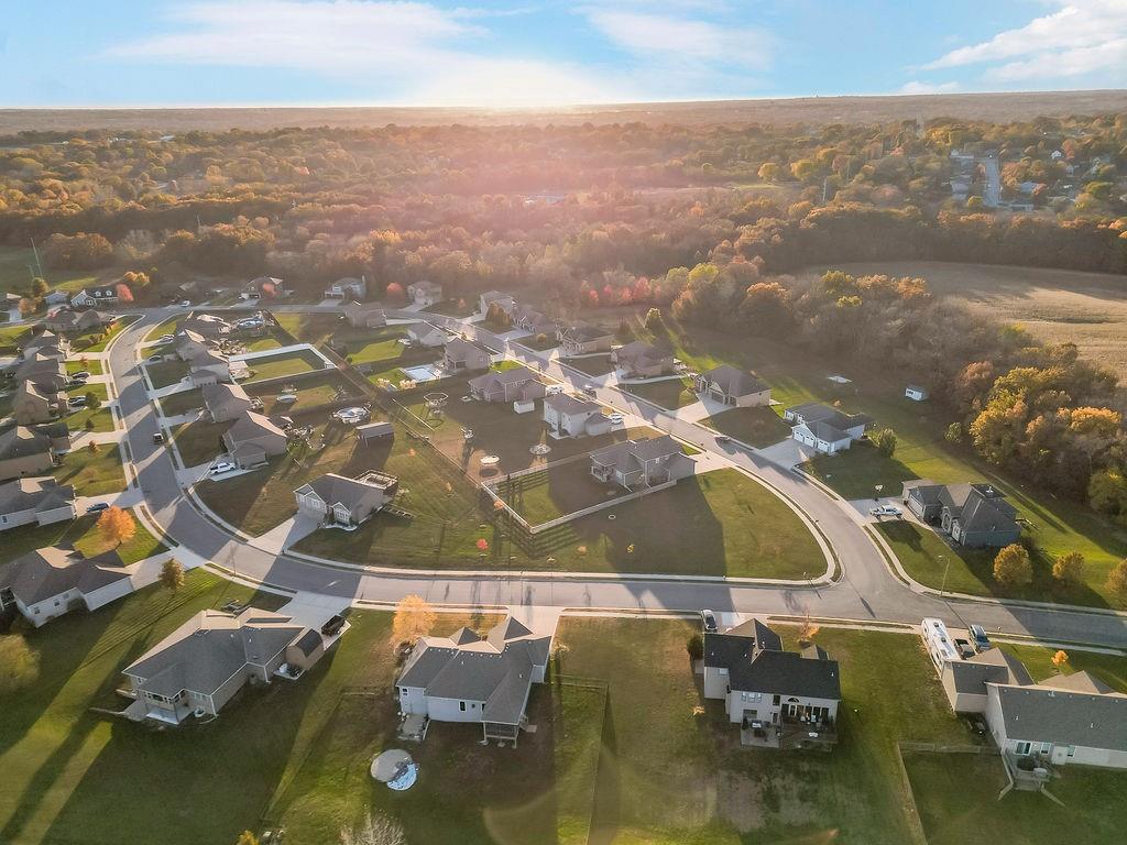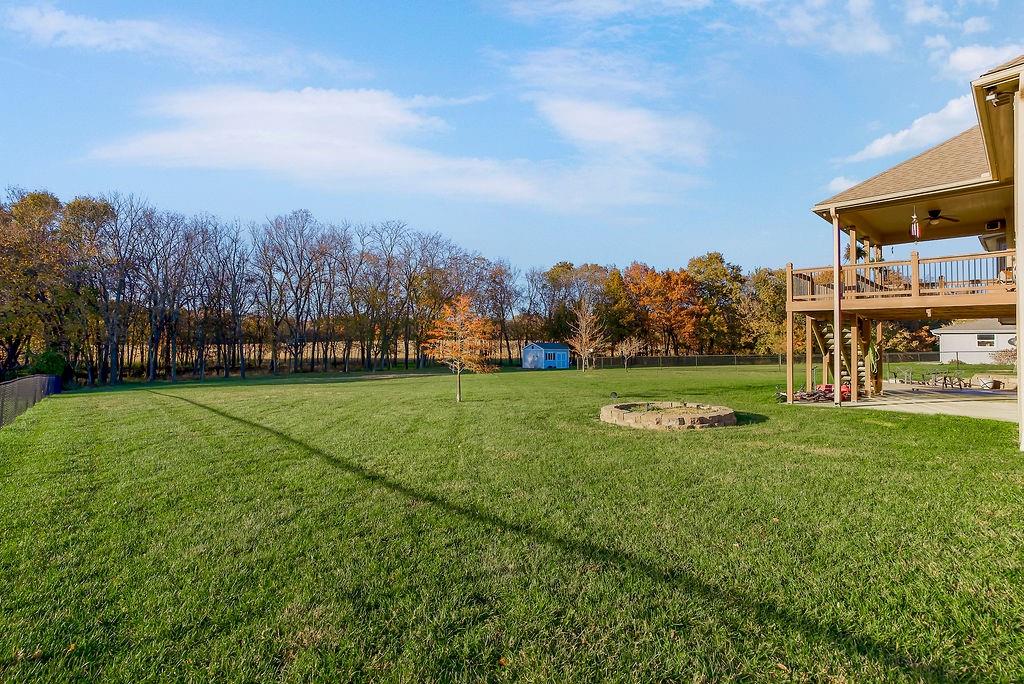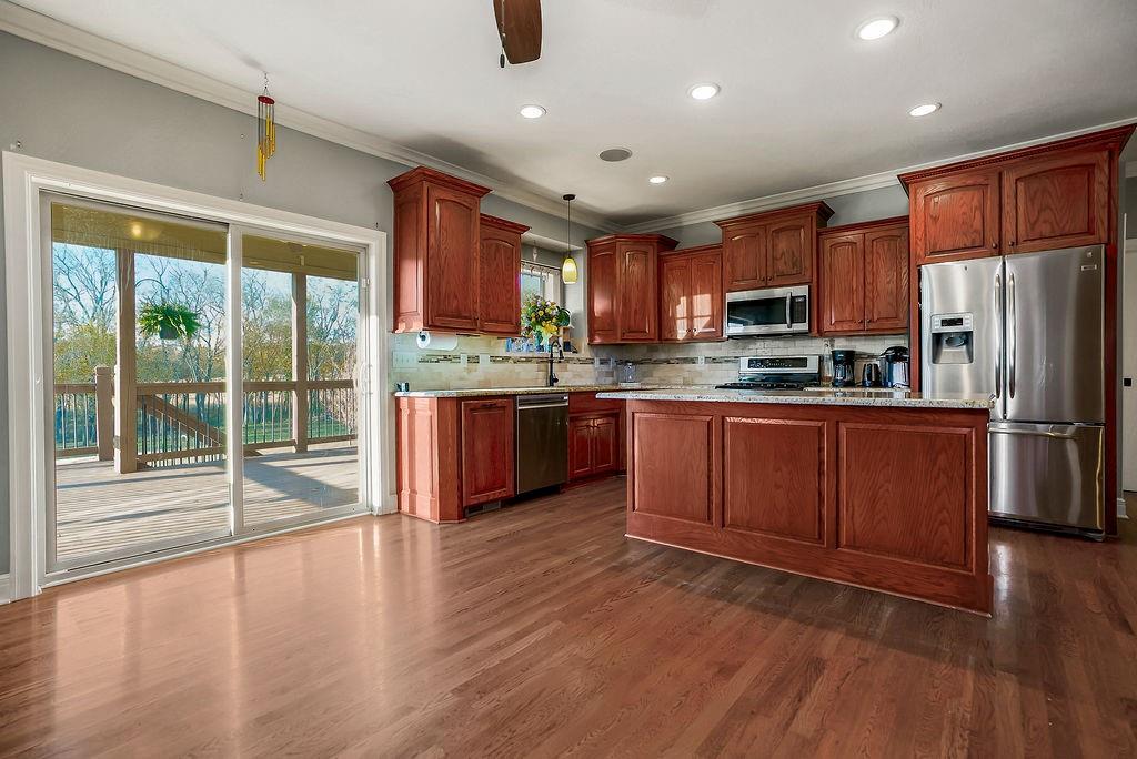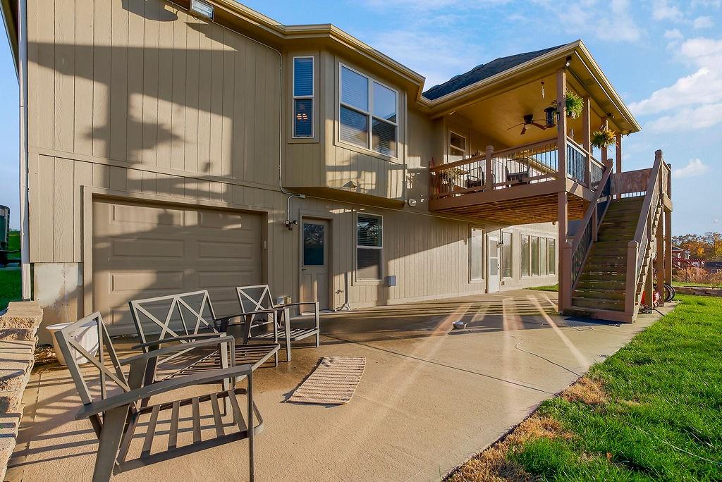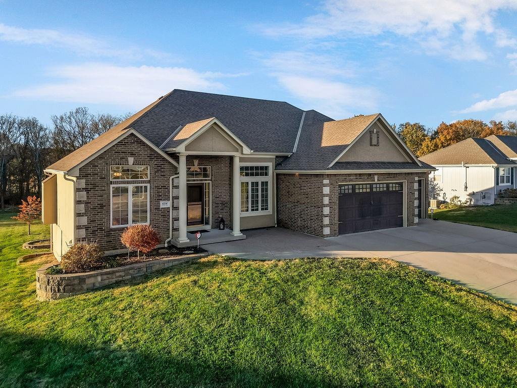 Stunning Reverse Ranch on Nearly an Acre in South Pleasant Hill. Experience peaceful, country-style living in a beautifully maintained neighborhood just minutes from 7 Highway. This inviting reverse ranch offers an open-concept kitchen and living area featuring an island, granite countertops, stained cabinetry, and a gas range. The spacious yet cozy living room includes built-ins for storage and display, along with a gas fireplace. Expansive windows throughout the home fill each space with natural light. A formal dining room, main-level laundry, and generous primary suite provide exceptional comfort and convenience. The luxurious ensuite features dual vanities, a whirlpool tub, and an oversized walk-in closet. The finished walkout lower level is perfect for entertaining, complete with a large family room, kitchenette/bar, and a third full bathroom. Parking is abundant with a three-car main-level garage plus an additional rear bonus garage—ideal for a workshop, tools, or extra storage. Relax outdoors on the covered deck overlooking the expansive backyard that backs to a serene forested area. The large lot and quiet street offer ample room for recreation and play. Additional unfinished storage space adds even more flexibility. No HOA!