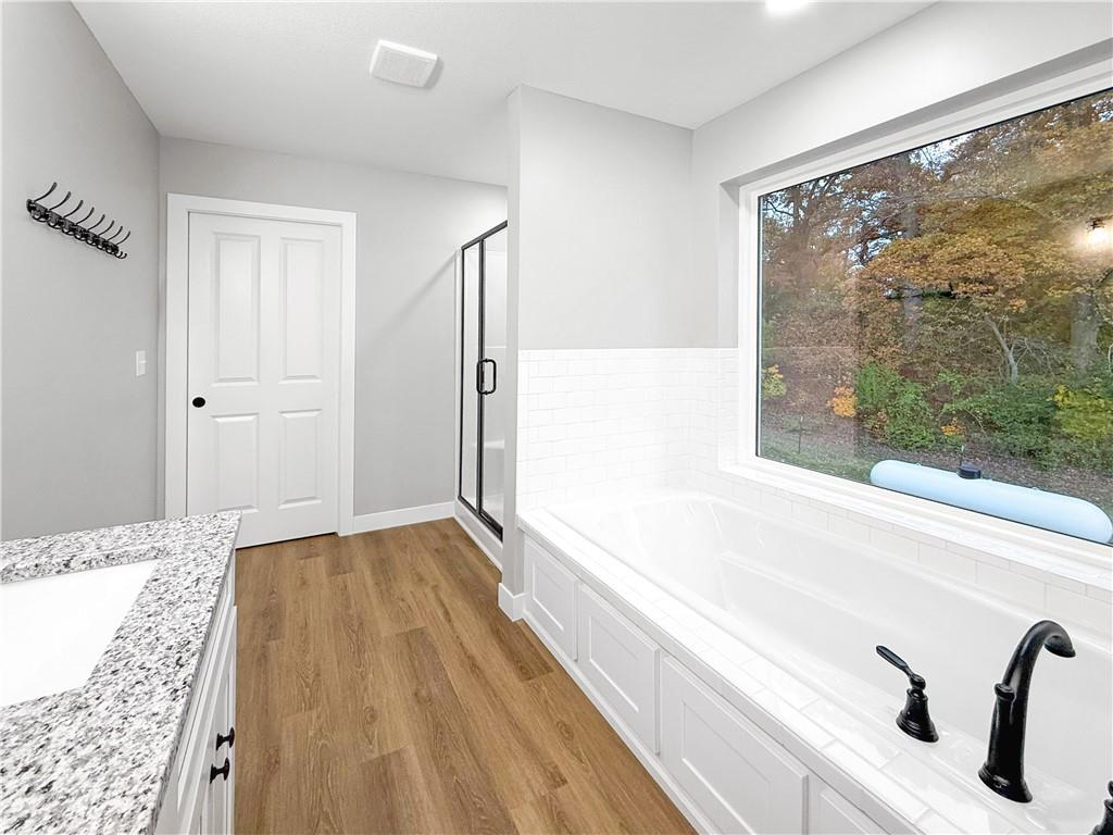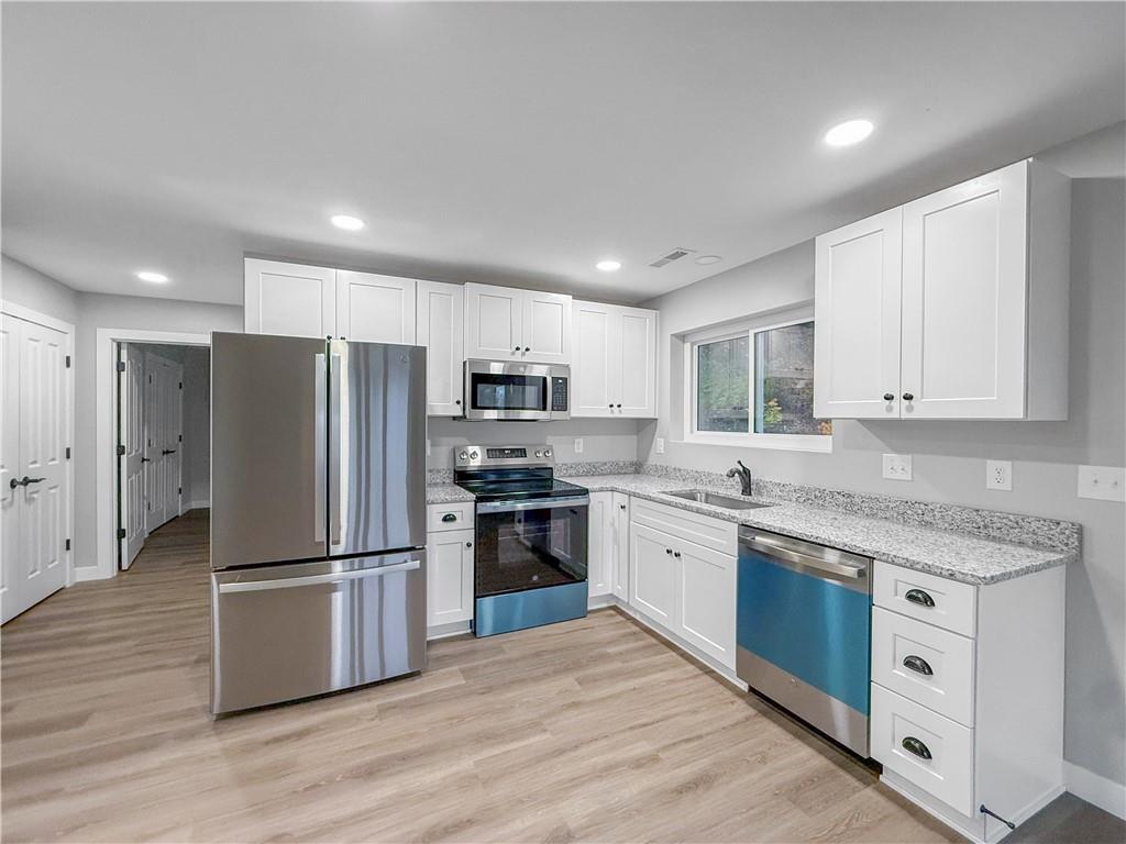 This stunning new-construction barndominium offers modern living with incredible function and style. Step inside to an open-concept layout filled with natural light, luxury vinyl plank flooring, recessed lighting, and serene country views. The gorgeous kitchen features crisp white cabinetry, granite counters and stainless steel appliances. A private primary suite includes a spa-inspired bathroom with dual vanities, a soaking tub, walk-in shower, and a large custom walk-in closet with built-in shelving. Additional bedrooms are bright and comfortable, with updated finishes throughout the home. Enjoy outdoor scenery from the covered upper deck and lower patios overlooking the tree line. The impressive spray-foam insulated garage/shop space is a dream—complete with concrete floors, loft storage, and oversized doors measuring 18'x8' and 12'x14', ideal for RVs, boats, farm equipment, or recreational vehicles. Designed for both comfort and convenience, this unique property blends high-quality craftsmanship with the peacefulness of rural living—move-in ready and built to impress!