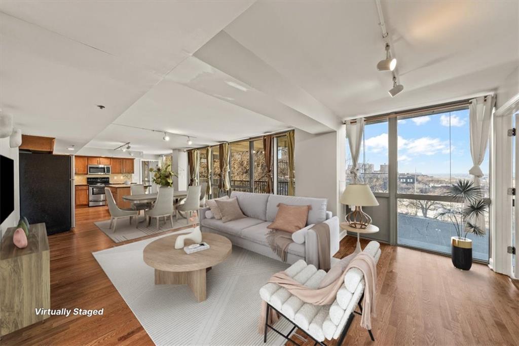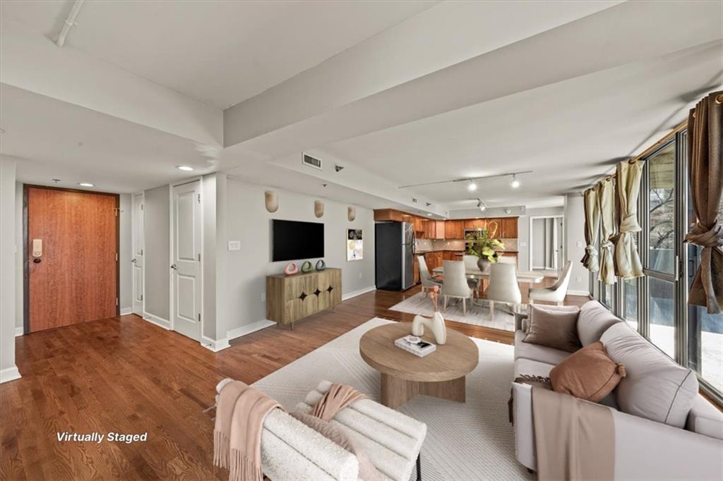 Prime location and all the amenities you could want! This spacious 2 bedroom, 2 bath condo in The View offers a spacious open floor plan with newly refinished wood floors throughout the main living area and a private balcony. Enjoy ample natural light with windows along one entire side of the unit affording views of the city, pool, and Heart of America bridge from each bedroom and the living space. Bedrooms are on opposite sides of the unit for privacy and each has direct access to a bathroom and its own walk-in closet. The kitchen features dark stained cabinets, stainless appliances, granite counters and a spacious island. In-unit stackable laundry with washer and dryer included. This property includes one assigned covered garage space and a designated storage unit. The View provides an abundance of amenities including both indoor and saltwater pools and hot tubs, a fitness center, tennis/pickleball court, both indoor and outdoor basketball courts, a theatre room, indoor putting green, catering kitchen, dry sauna, and a secured entry with on-site concierge team and overnight security. All this within minutes of shopping, restaurants, bars/breweries, and entertainment in North Kansas City, Power and Light, River Market and more. Easy access to freeways/interstate.