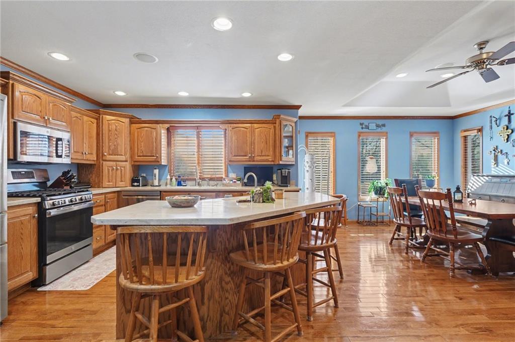 Beautiful, well-maintained brick ranch offering a spacious and comfortable layout with thoughtful updates throughout. The large kitchen features abundant cabinetry, a center island with vegetable sink, solid-surface counters, and all new appliances. The kitchen, dining area, and family room sit at the front of the home, bringing in wonderful natural light. The family room offers a warm, welcoming feel with its brick gas fireplace, perfect for cozy evenings and gatherings. A generously sized laundry room provides excellent built-ins, a utility sink, and a convenient built-in ironing board. A water softener and reverse osmosis system are also included, and the furnace and hot water heater are only 2 years old. The primary suite includes two closets—one being a walk-in—and a private bathroom with a double vanity. The second bedroom offers its own private bathroom with a walk-in shower, ideal for guests or multigenerational living. Also has a bonus room that could be an extra bedroom/office. Outdoor spaces include a covered deck plus an additional patio area. The yard is easy to maintain and not overly large. Seller is also installing a new roof, providing peace of mind for years to come. This home combines quality, comfort, and smart updates—ready for its next owners to move right in.