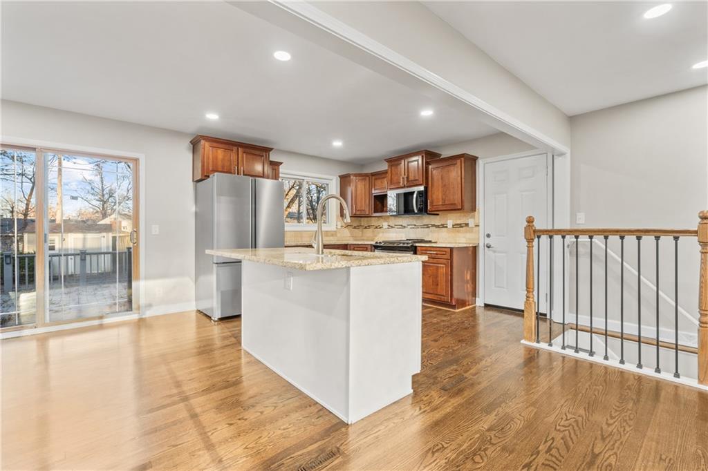 Stunning Total Remodel – Modern Living at Its Finest! This beautifully renovated ranch-style home offers the perfect blend of contemporary design and timeless charm, featuring 4 bedrooms, 2 full baths, oversized 2 car garage, and an impressive list of upgrades that will take your breath away. Completely Updated for Peace of Mind Brand-new plumbing and a 200-amp electrical system. Gourmet chef's kitchen redesigned from top to bottom, boasting: Large island with new granite countertops Sleek stainless steel appliances (dishwasher, microwave, refrigerator, gas range) Modern, high-end finishes throughout Two luxurious, fully renovated bathrooms Fresh interior and exterior paint Refinished hardwood floors on the main level, new hardwood floors in the kitchen, and LVP flooring on the lower level. Open-Concept Elegance The main level is thoughtfully designed with an open-concept layout, featuring: New recessed lighting and smooth, flat ceilings Spacious living and dining areas perfect for gatherings An inviting, airy ambiance enhanced by abundant natural light. Versatile Lower Level The finished lower level provides: A second family room Bedrooms 3 and 4 for added privacy or office space A fully updated bathroom A laundry room with a convenient laundry chute. Outdoor Oasis Step outside onto the oversized back deck, ideal for entertaining or relaxing, while overlooking a charming backyard complete with a large storage shed. Prime Location Conveniently located just minutes from Arrowhead & Kaufman Stadium, premier shopping, dining, and major highways, this home offers easy access to everything Kansas City has to offer—all within a family-friendly neighborhood. Owner is a licensed broker in KS & MO.