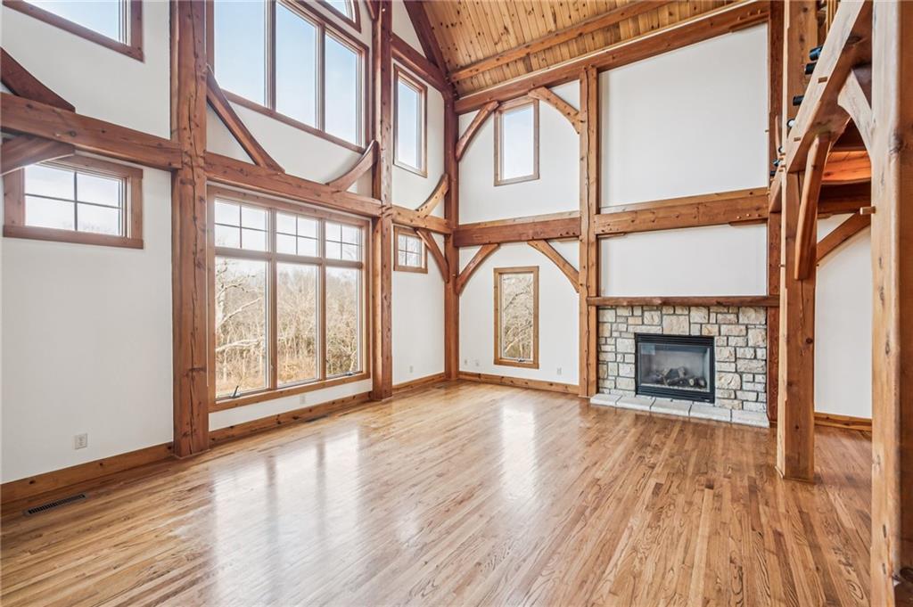 This exceptional one-of-a-kind custom timber-frame home seamlessly blends rustic character with modern luxury, set on 1.84 picturesque acres in Holmes Creek Hills North A welcoming front porch, perfect for rocking chairs invites you inside. Entertain with ease in the formal dining room, then take in the show-stopping living room featuring soaring 22-foot vaulted ceilings, exposed beams, a striking stone fireplace, and a dramatic wall of high-end angular windows overlooking the saltwater pool and wooded back yard. Hardwood floors extend throughout this open-concept main level into a gourmet kitchen with walk-in pantry. The main-level owner's suite offers a private retreat with heated floors, a tiled walk-in shower and freestanding soaking tub. Upstairs, three generously sized bedrooms offer provide flexible living options, including a nonconforming loft-style space ideal for a home office or study. The two-tier, finished walk-out basement is an entertainer's dream. Media/family room with 104" TV is the perfect area to cozy up for movies. The lower level hosts a second fireplace and full bar creating the perfect space for gatherings. Outdoors, unwind in the evenings around the firepit and enjoy the peaceful setting this property offers.