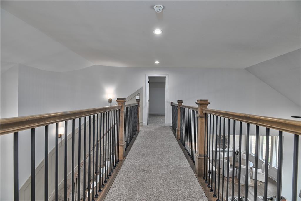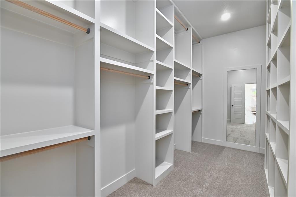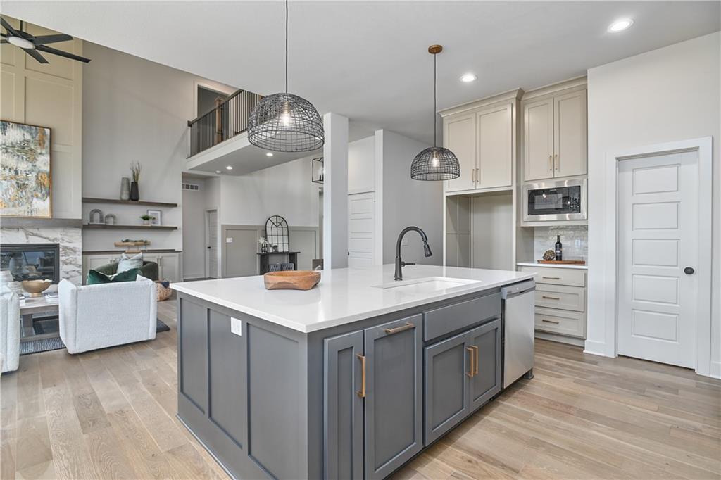 Stunning KCBD Geneva 1.5 story in highly sought after Woodland Hills - Olathe! This plan features a curved staircase at entry, beautiful hardwood floors. Primary bedroom suite on the main level with luxurious private bathroom. Additional bedroom and full bath on the main level. Kitchen with large center island, custom cabinets, and large walk-in pantry. The two-story great room features stone to the ceiling fireplace visible from the second level catwalk. Great location, great community.