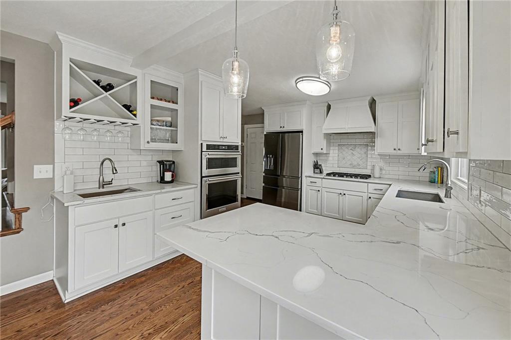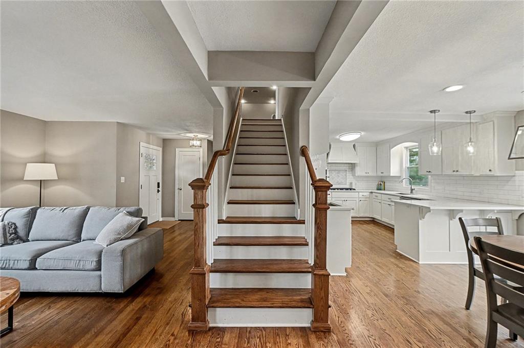 Welcome to this gorgeous Prairie Fields 1.5-story home featuring 3 bedrooms and 3.5 baths. This home sits on a large, nearly half acre lot on a beautiful tree-lined street. A covered front porch welcomes you to gleaming hardwood floors and fresh, open spaces. A large living room with custom built-ins, is centered around a fireplace and flows beautifully into both the kitchen and dining room. A fully-renovated gourmet kitchen complete with tons of custom cabinets, quartz countertops, professional KitchenAid stainless appliances, stylish backsplash, breakfast bar seating and designer touches is the heart of the home. The dining room is filled with natural light and flows beautifully to the deck. The main-level primary suite includes a large double vanity, spacious walk-in closet, and full-size washer and dryer for main-level laundry. Upstairs, you’ll find two generous bedrooms connected by a beautifully designed shared bath, along with a versatile loft area that works for office, play, gym or den space. The finished hard-to-find-walkout basement adds valuable living space with full bath, perfect for guests, a rec room, or a home office. A future nonconforming bedroom is framed and ready to go in the basement or add a dormer window to the upstairs loft for an additional two bedrooms if needed! Backyard is an oasis. A park-like setting for entertaining, gardening or play. Fully fenced. True two car garage and flat driveway. Situated in the highly sought after Shawnee Mission school district, close to the Prairie Village shops and downtown Overland Park you have your pick of restaurants, shops, parks and entertainment. This one checks all the boxes! An absolute must see!