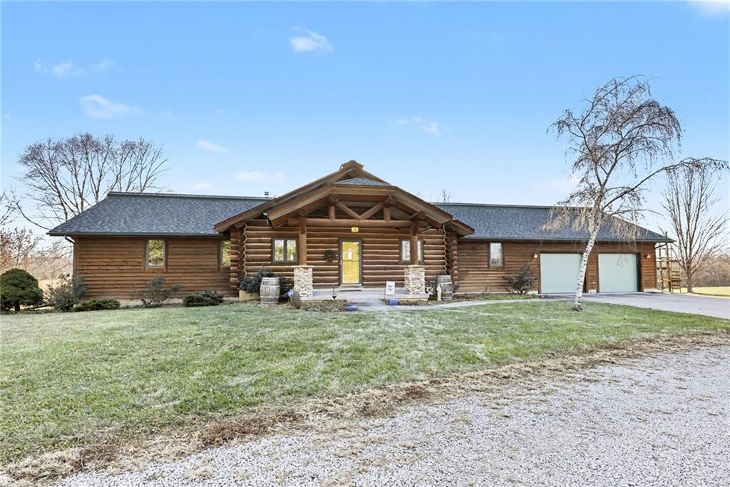Tucked away on 23 breathtaking acres, this 3,162 sq. ft. Craftsman ranch–style custom log home offers a rare blend of thoughtful design, and unmatched natural surroundings. Built in 2003 and lovingly maintained by its original owners, the home showcases full-round log construction in the central living areas, featuring exposed log trusses, open doorways, and a striking Palladian-style arched picture window that fills the space with natural light. Covered front and back porches invite you to relax and take in the peaceful setting, while cedar-sided, stick-built wings balance beauty with functionality. The main level is designed for effortless living, offering a spacious kitchen, living and dining areas, a walk-in pantry, and custom cabinetry and built-ins throughout. The primary suite includes a full bathroom and a walk-in closet. Two additional bedrooms, a second full bath, multiple linen closets, and a convenient laundry/mudroom are also on this main level. The finished walkout basement expands the living space with a fourth bedroom, third full bathroom, open living/game room, bar, safe room, and abundant storage—including a large utility room and under-stair storage. Comfort and efficiency in the home are enhanced by central air, a heat pump with propane backup, a wood stove fireplace, a radon mitigation system, and high-speed fiber internet. Outdoors, the property is equally impressive with an attached extra deep two-car garage, concrete driveway and patio, 42’ x 64’ shop/barn with a 12-foot door, circular gravel drive, garden shed, raised garden beds, and a landscaped backyard bonfire ring. Crafted from dead-standing pine and fir timber sourced from Wyoming, this one-of-a-kind home is perfectly positioned on a paved, lightly traveled road just one mile from Smithville Lake’s Mecca Access and boat ramp—offering true country living without gravel roads. The acreage borders U.S. Corps of Engineers land along Smithville Lake, ensuring privacy and protected views.