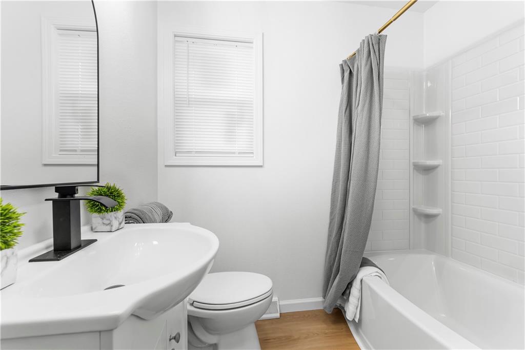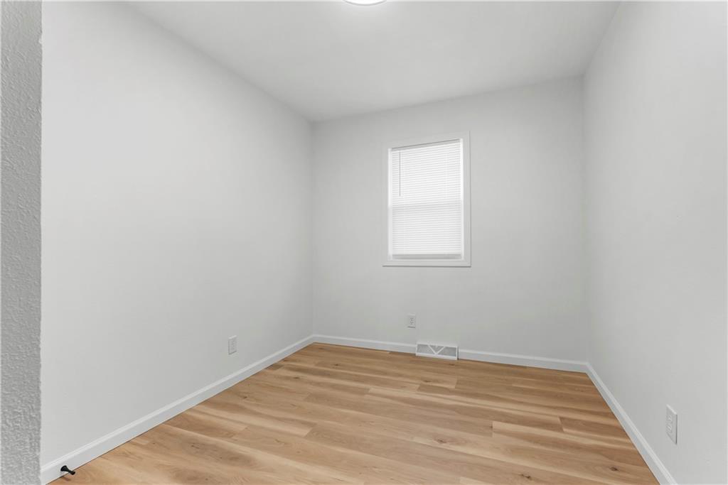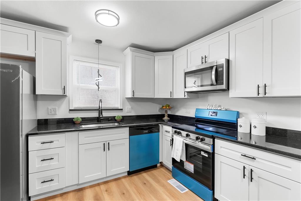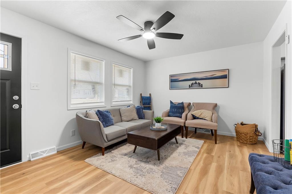 This 4-bedroom, 2-bath raised ranch is move-in ready with major updates already completed. The home features a new roof, new HVAC system, and a fully renovated interior including new kitchen cabinets, updated bathrooms, fresh paint, and modern finishes throughout. The main level includes the primary bedroom, while the finished basement adds a fourth bedroom, full bathroom, and laundry area. Outdoor living includes a front entry deck and a rear deck with stairs leading to the backyard. A one-car garage is located in the basement, with additional parking available at the rear of the property. Located next to Henry C. Kritser Park, near Rock Island Trail access, Scooters Coffee, Dutch Bros Coffee, and Route 350 W for convenient commuting.