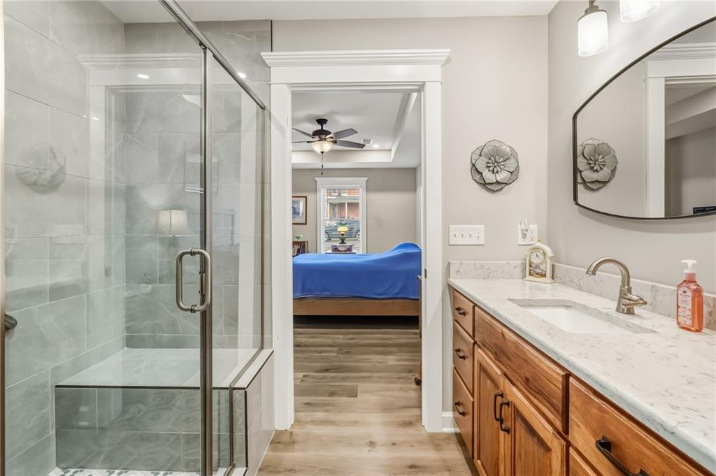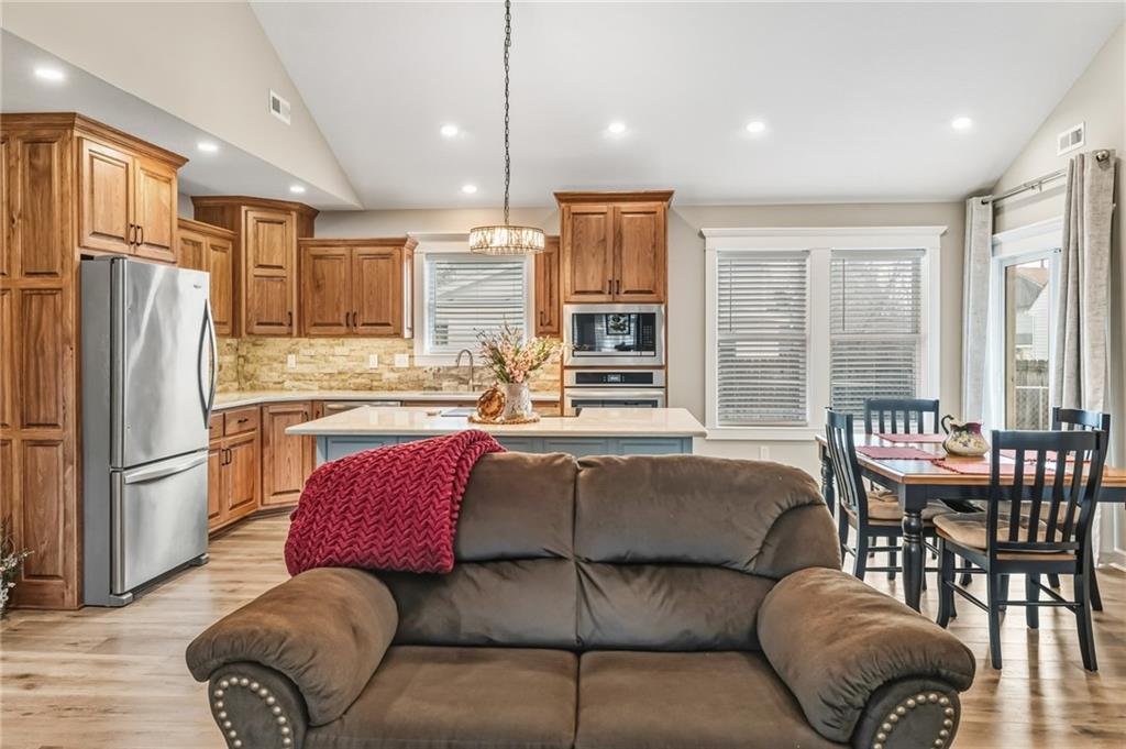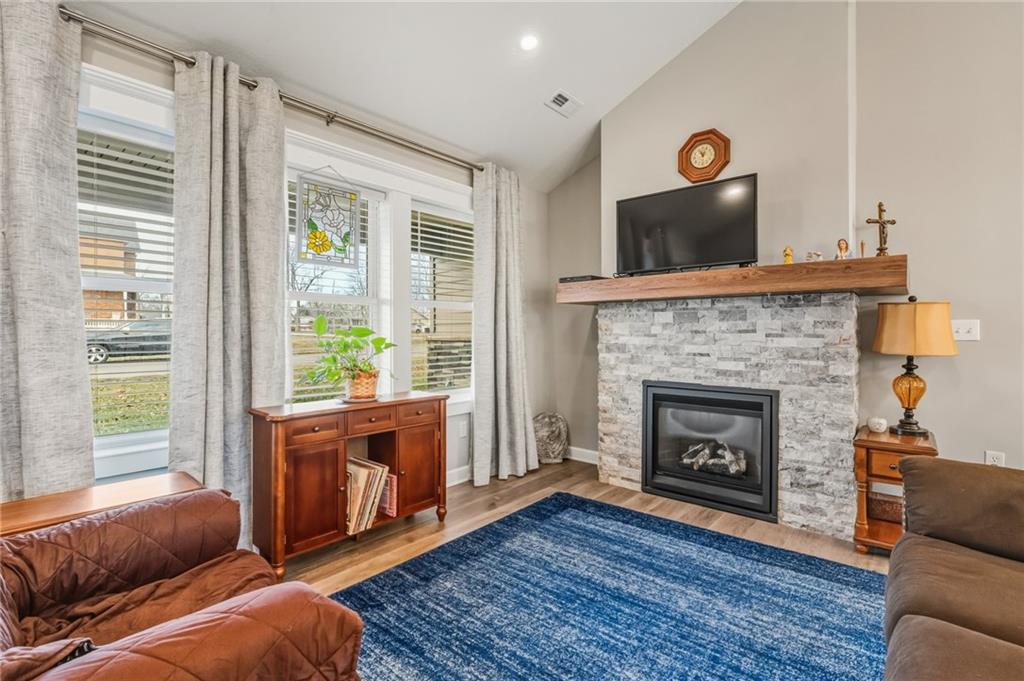 Easy Living, Elevated Style~ Welcome Home! Say hello to modern comfort made easy in this beautifully designed, newer-construction 2 bed, 2 bath, ranch home where style meets accessibility. Thoughtfully built for effortless living, this home invites you in with no-step entry, wide open spaces, and a layout that simply works for today’s lifestyle. Inside, natural light fills the open-concept living area, highlighting vaulted ceilings, a cozy travertine stone fireplace, and high-end finishes throughout. The stunning kitchen is a showstopper, featuring Amish-made custom cabinetry, a travertine backsplash, Quartz countertops, stainless steel appliances with an induction cooktop, and a large island perfect for gathering, entertaining, or everyday meals. The primary suite offers a spacious ensuite and walk-in closet, while the second bedroom is ideal for guests, a home office, or hobbies. Every detail was designed with comfort and convenience in mind, from custom cabinetry throughout to energy-efficient systems and added gutter guards. Step outside and enjoy a private patio, a fully fenced backyard perfect for furry friends, and a side yard with room to garden or unwind, on a nice corner lot. The attached 2-car garage offers room for storage, and yes, washer and dryer stay! Accessible, low-maintenance, and absolutely inviting, this home is ready for you to move in, relax, and fall in love.