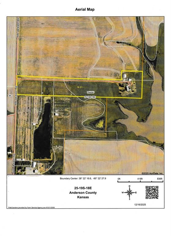 Sitting at the end of a nearly half mile driveway is this unique, 2985 square foot, 3 bedroom, 2 bath, 1 story home on 100 acres, more or less, in Anderson County, KS. Youll find an open floor plan which includes a huge master suite wing that is connected to the main body of the home by way of a large office which could be used a library, home school room or family room. Off that suite is your own private sunroom in which you will enjoy picturesque views of the countryside and neighboring lake. The main body of the home is wide open with the kitchen, dining and family rooms designed for easy communication and entertaining! The upstairs includes two large bedrooms with a large bathroom. Youll love the hard wood floors throughout and everywhere you look there are windows, lots of windows. Natural light flows in abundance. The home sits on a full unfinished basement ready for your finishing touches or storage. There is a nice 60 x 60 metal horse barn and a nice 30 x 40 metal detached garage/shop! The map is for general reference only and may not reflect exact locations or dimensions. Taxes TBD. Aerial map, created with Surety Pro paid subscription & used with permission from AgriData, Inc. The map is for general reference only and may not reflect exact locations or dimensions.