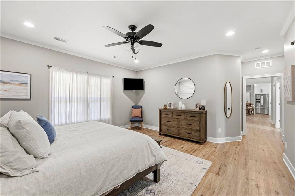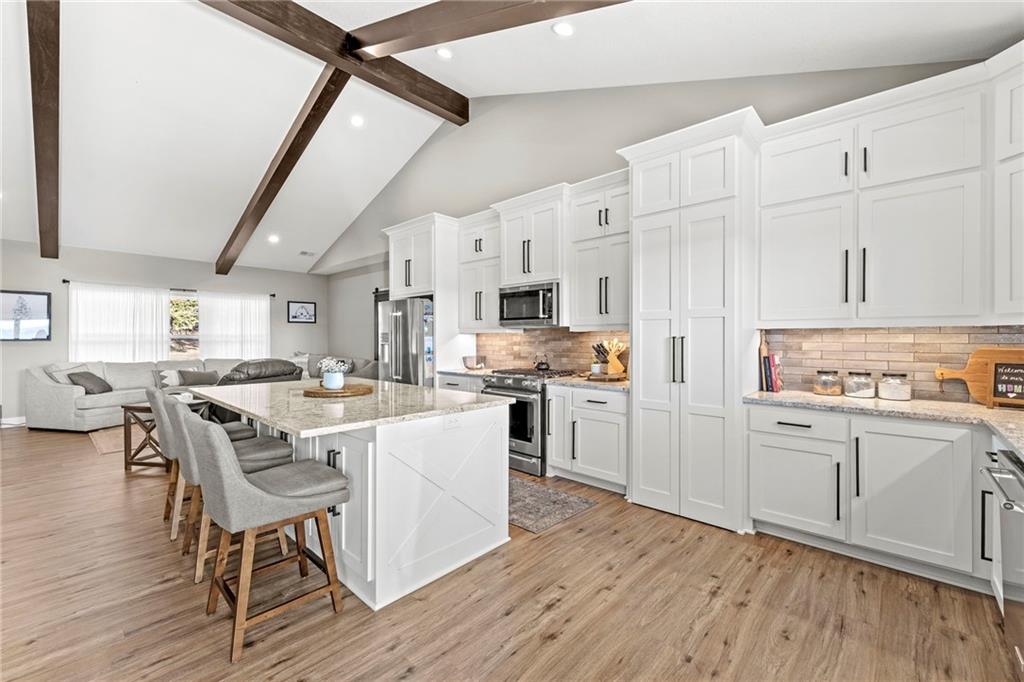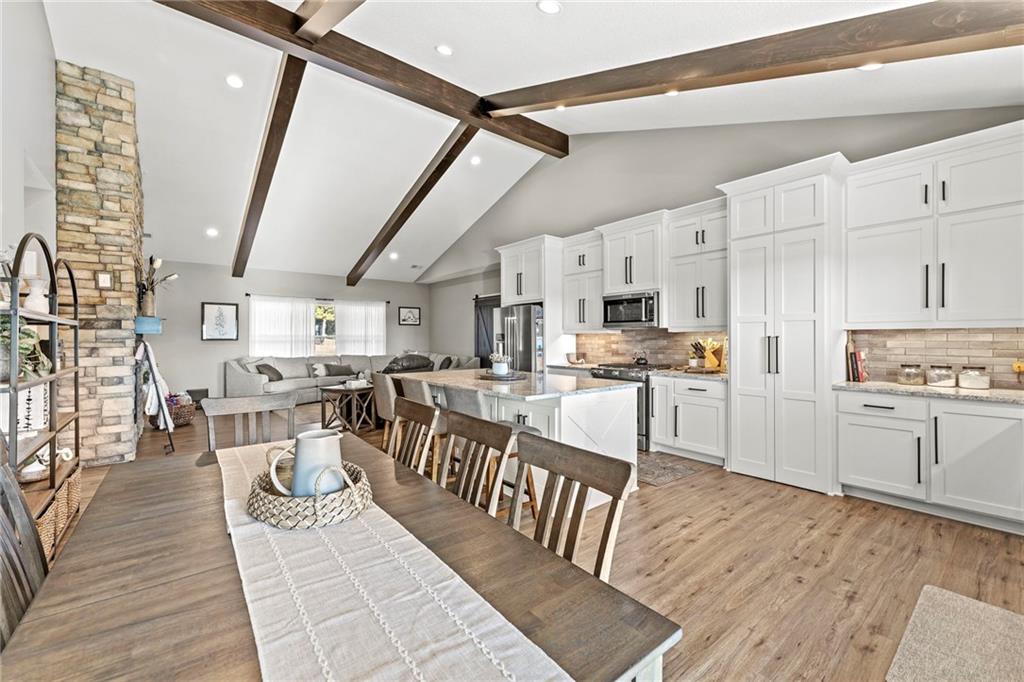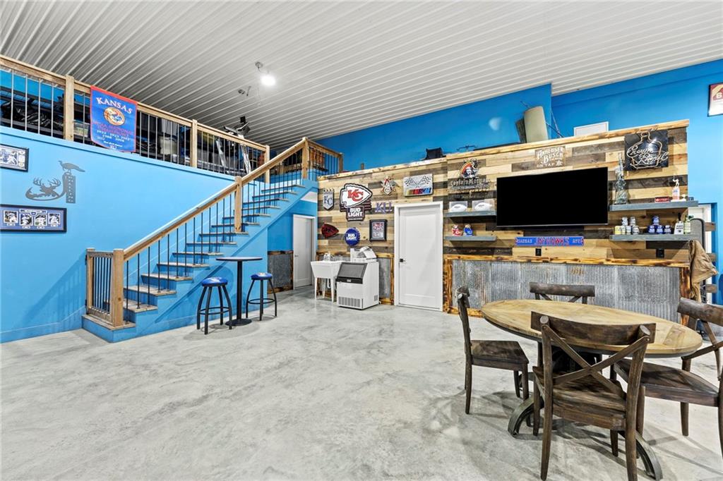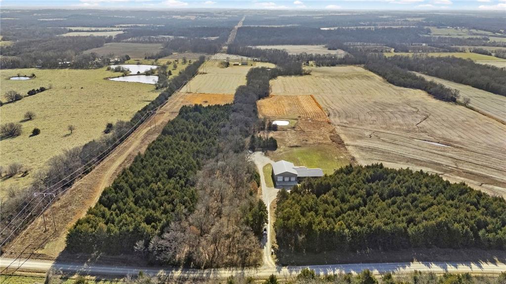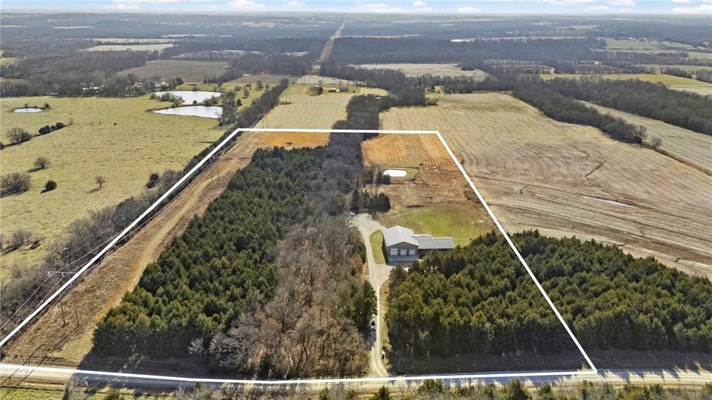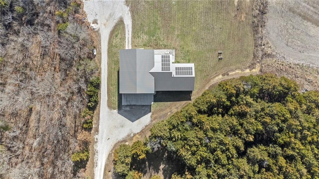 This absolutely stunning, custom-built 2021 barndominium offers the ultimate in secluded luxury across 20+ acres of gorgeous timber and pasture, greeting you with a sprawling covered porch perfect for taking in the abundant local wildlife. The interior showcases the finest craftsmanship through an open-concept layout defined by soaring ceilings, luxury vinyl flooring, and expansive walls of windows that flood the home with natural light. At the heart of the residence sits a gourmet kitchen featuring granite countertops, a massive island, custom cabinetry with pull-out drawers, and a 9x8 walk-in pantry with outlets, all flowing seamlessly into a dining area and a great room anchored by a cozy rock gas fireplace. Practicality meets style in the spacious mudroom, flanked by a dedicated laundry area and a convenient half bath, while the private primary suite serves as a true retreat with its tiled shower, deep soaker tub, and walk-in closet. Two additional generous bedrooms and a full bath provide ample space for family or guests, while a fully concrete 10 x 10 safe room ensures peace of mind. The home's technical specifications are equally impressive, featuring a sophisticated solar energy system supported by a propane gas generator and battery storage for total self-sufficiency. Covered back patio, great for entertaining. Completing this exceptional property is a 50x64, fully insulated, and sheet rocked garage/shop equipped with 200 AMP service, three overhead doors, an exit door, and dedicated attic storage—all situated on a prime piece of land ideal for hunting, farming, or recreation.