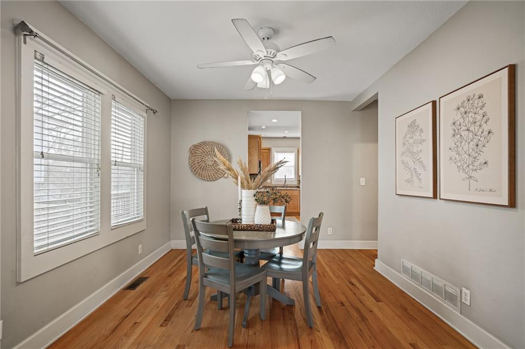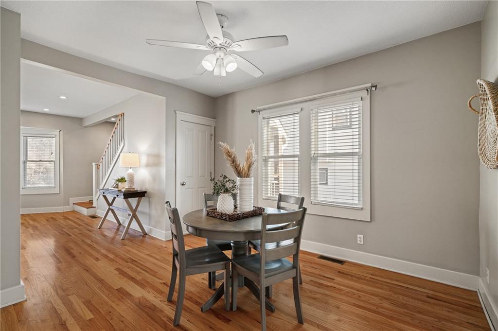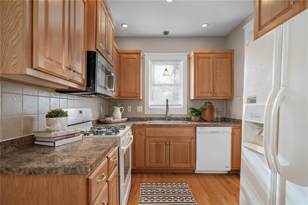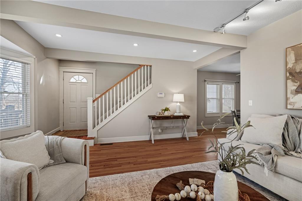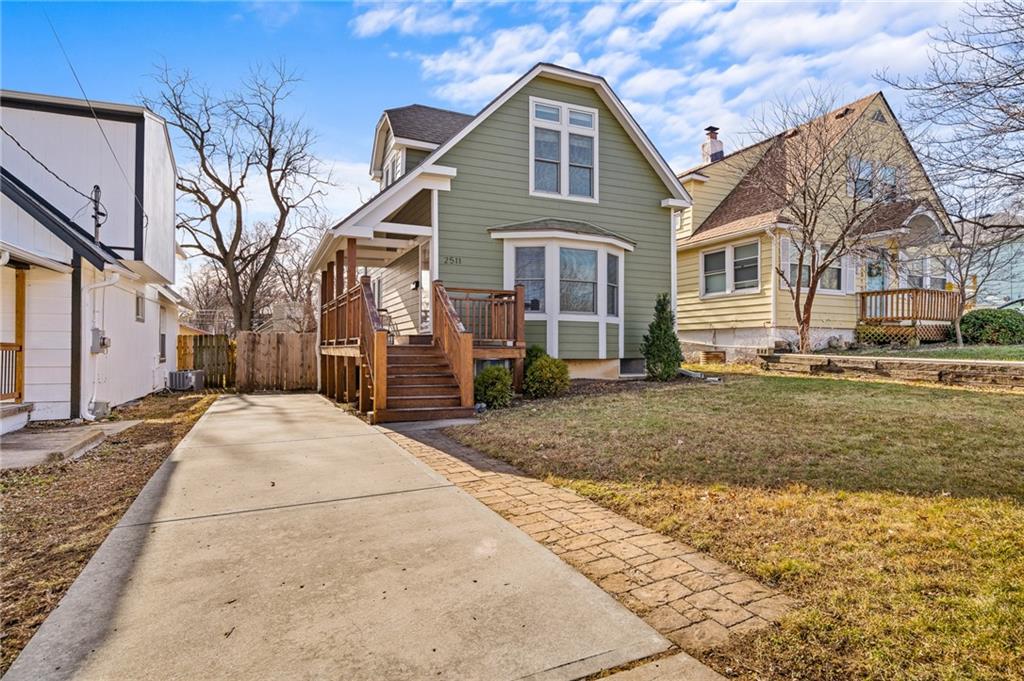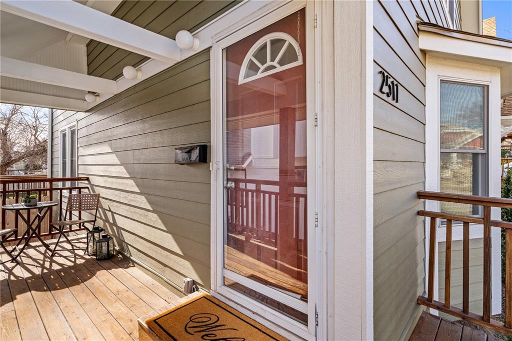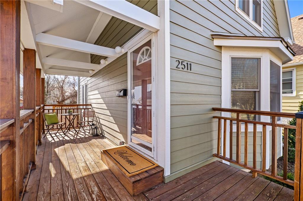 Charming, light-filled, and beautifully updated, this darling two-story home is easy to love. From the inviting façade of quality Hardie Board siding and fresh exterior paint to the expansive stained deck, every detail feels thoughtfully designed. Inside, white oak flooring sets a calm, cohesive tone throughout the main level, where a bright bay window creates the perfect sitting area and open sight lines lead to the dining space and kitchen. The kitchen impresses with quality white oak cabinetry, appliances that stay, and a bonus coffee nook or butlers pantry waiting for your touches. A full bath and a private work-from-home area round out the first floor. Upstairs, the serene primary suite features built-in bookcases, two spacious closets, and charming sconces, while the sun-drenched hall bath connects seamlessly to both bedrooms. The tall, poured-concrete basement offers excellent potential for future living space. Outdoors, enjoy a spacious, manicured backyard with room to play, plus convenient lawn storage beneath the deck. Located just a short distance to neighborhood favorites including Lulu’s Thai Noodle Shop, Joe’s KC Bar-B-Cue, Woodside Health Club, and KU Medical Center—this home delivers comfort, style, and an unbeatable location.
