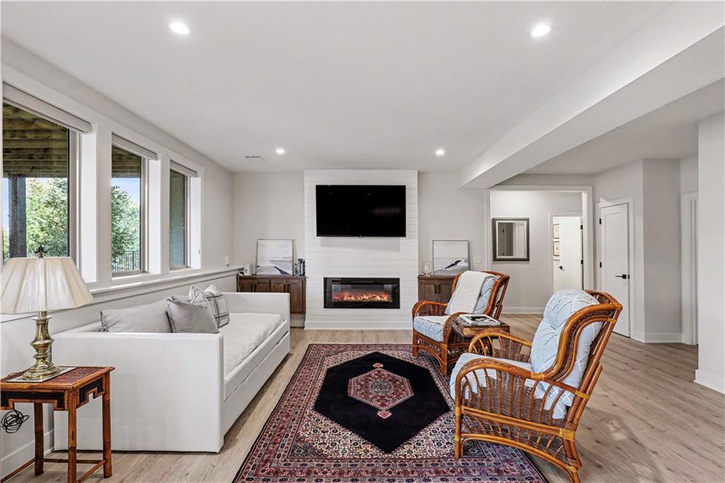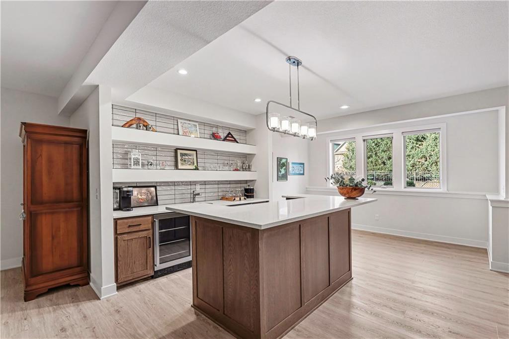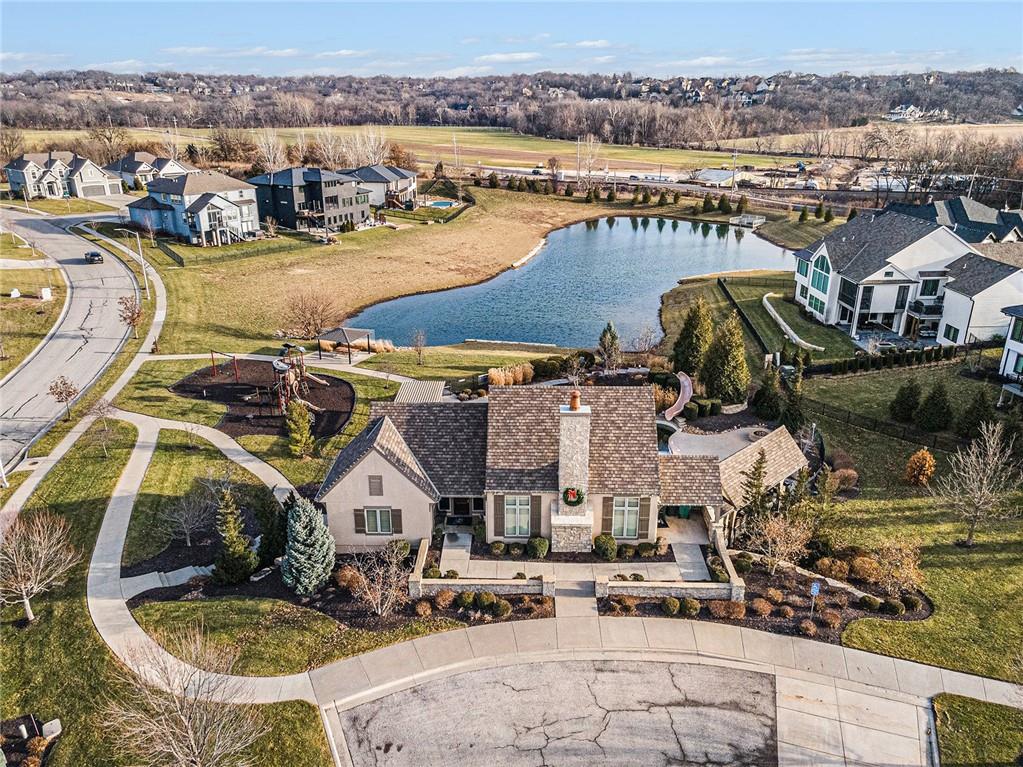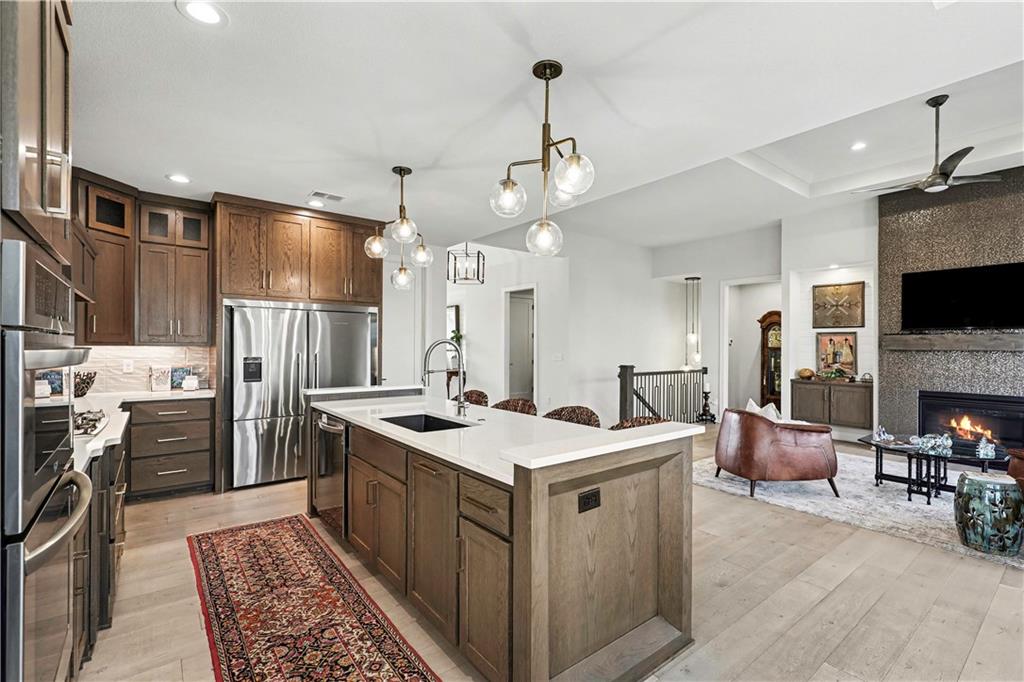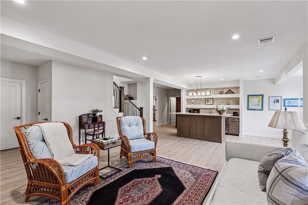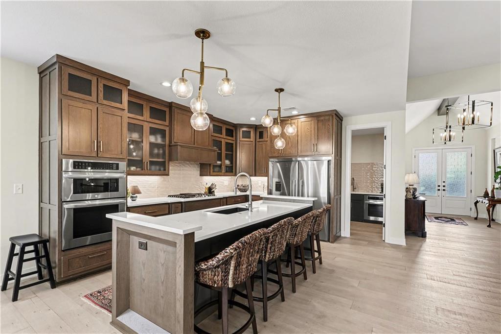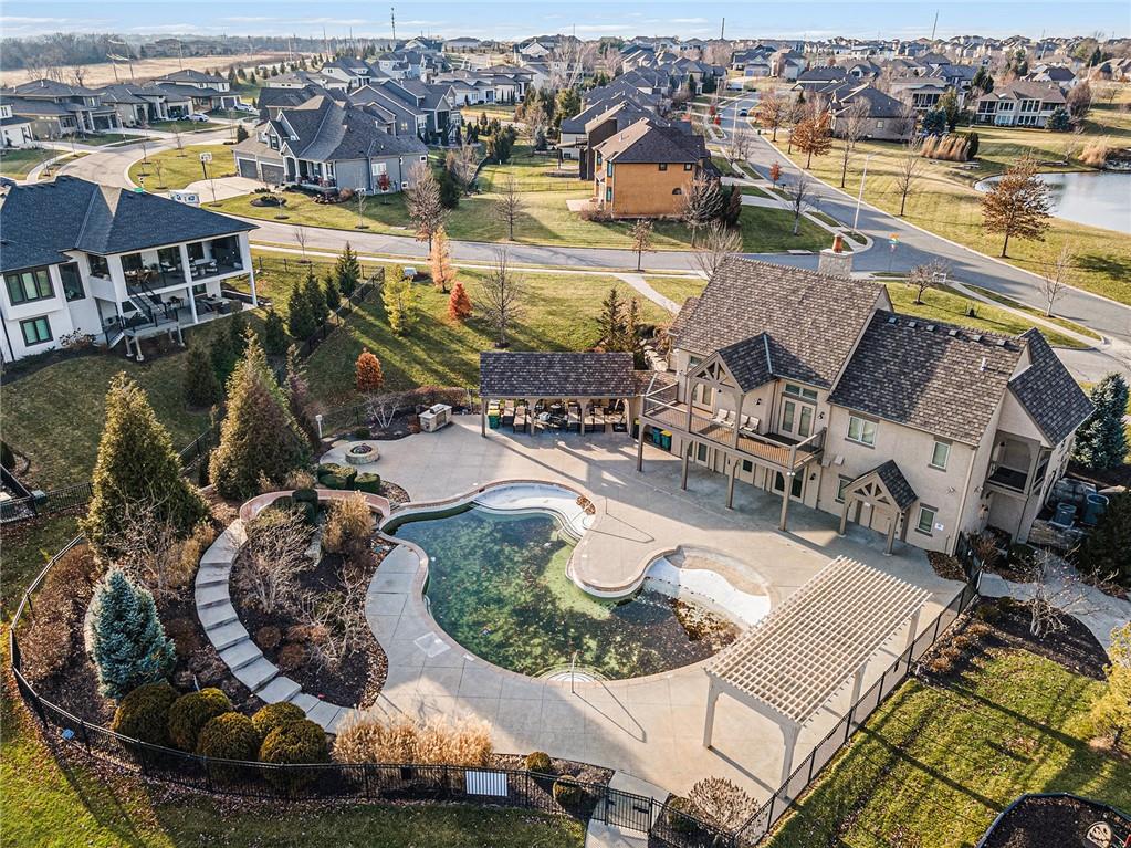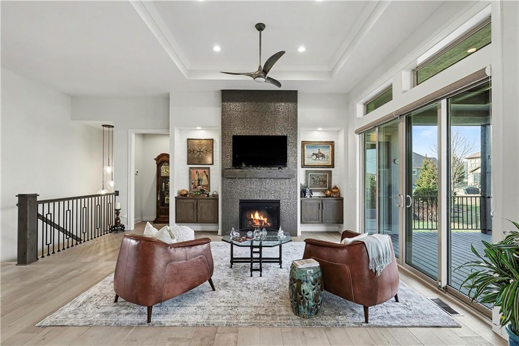 Exquisite Luxury Living in a Scenic, Sought-After WatersEdge Community Step through impressive double doors into this meticulous, less than 5-year young home, where refined design and thoughtful functionality come together effortlessly. The spacious great room is anchored by a striking fireplace and flows seamlessly into the chef-inspired island kitchen, complete with a walk-in pantry and second oven—perfect for entertaining and everyday living. The private primary suite is a true retreat, featuring an expansive walk-in closet and a spa-inspired bath with a beautifully tiled walk-in shower, dual quartz vanities, and a deep soaking tub designed for relaxation. The suite also offers direct access to the covered deck. A conveniently located laundry room off the primary closet adds ease to daily routines, while a second laundry in the lower level enhances flexibility. Also on the main level is a spacious second bedroom currently used as a home office, offering excellent flexibility as a private guest suite. It is served by a full bathroom featuring a luxury tiled shower—ideal for visitors or multi-generational living. An elegant curved staircase leads to a beautifully finished lower-level recreation room with a full bar, ideal for hosting gatherings. Two additional bedrooms, two bathrooms, and a versatile bonus room provide generous space for guests, hobbies, or work-from-home needs. Throughout the home, luxury finishes and custom craftsmanship reflect pride of ownership and a lightly lived-in feel. Located within a highly desirable subdivision celebrated for its scenic ponds, waterfalls, and tranquil water features, this exceptional property offers timeless appeal, comfort, and a premier setting in an unbeatable location.