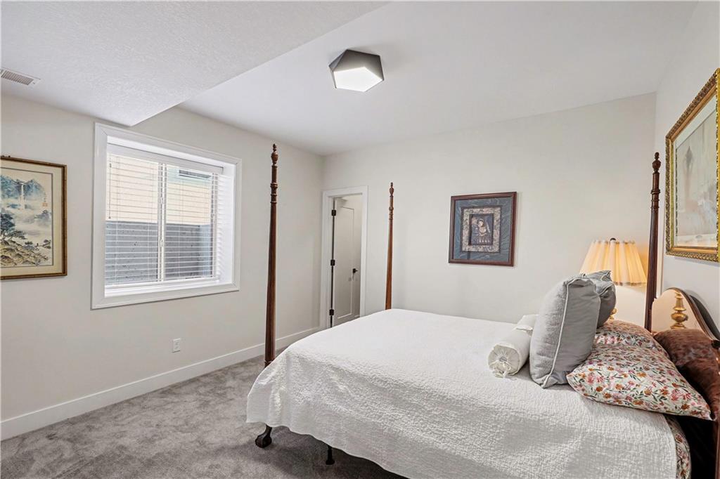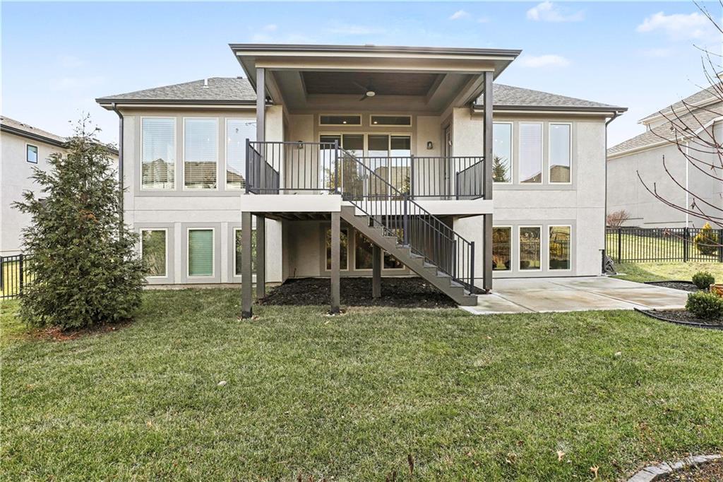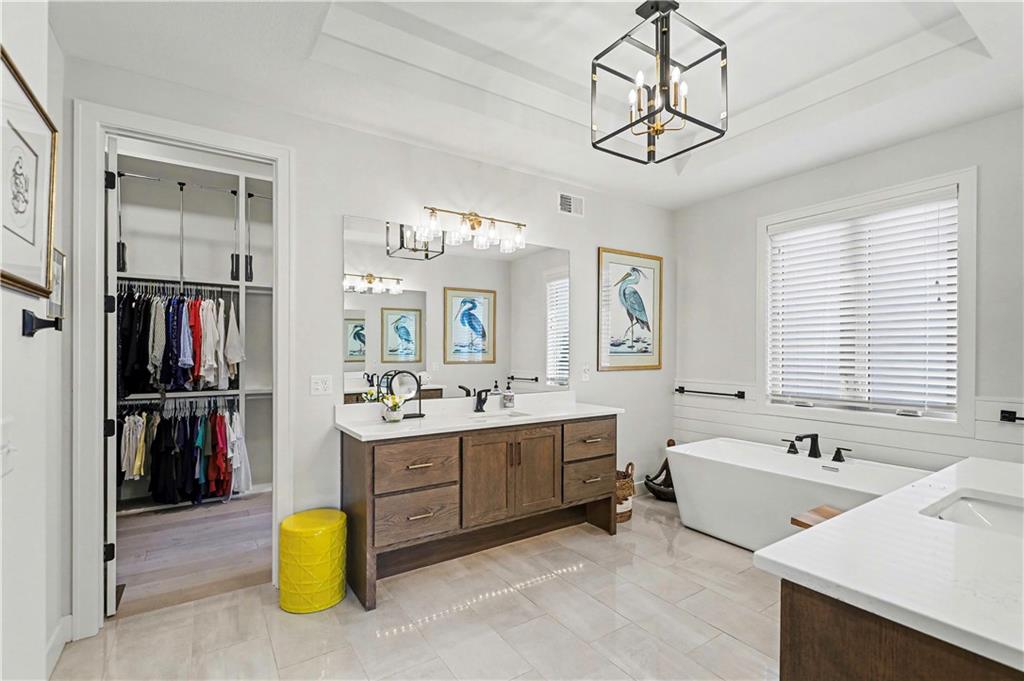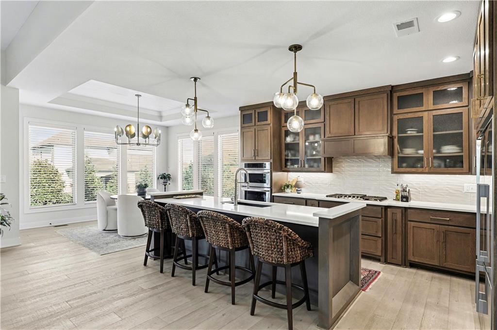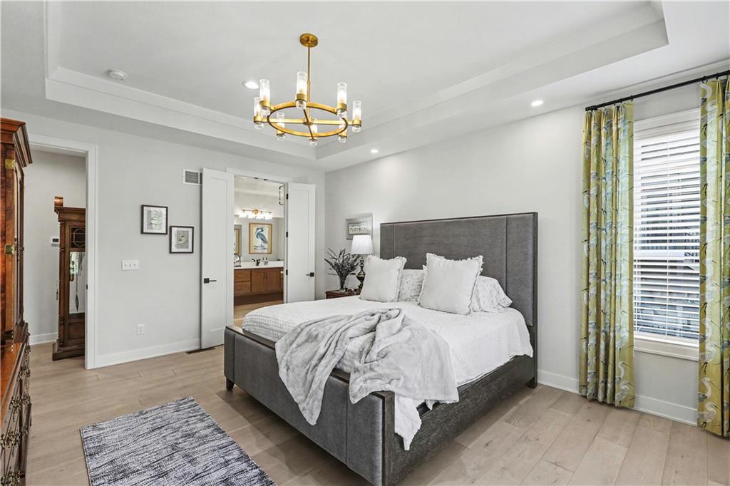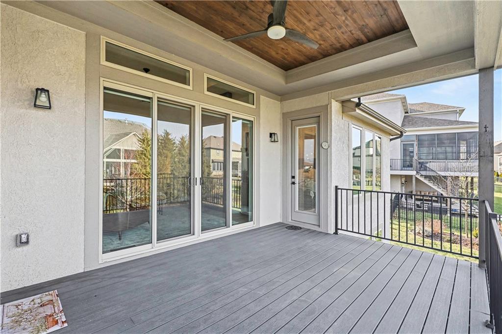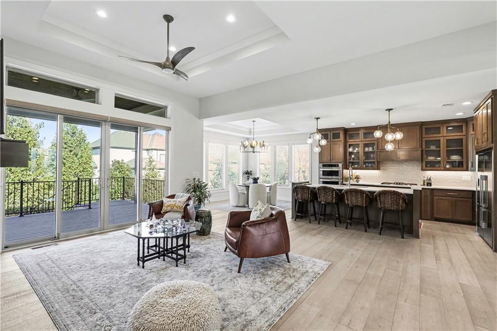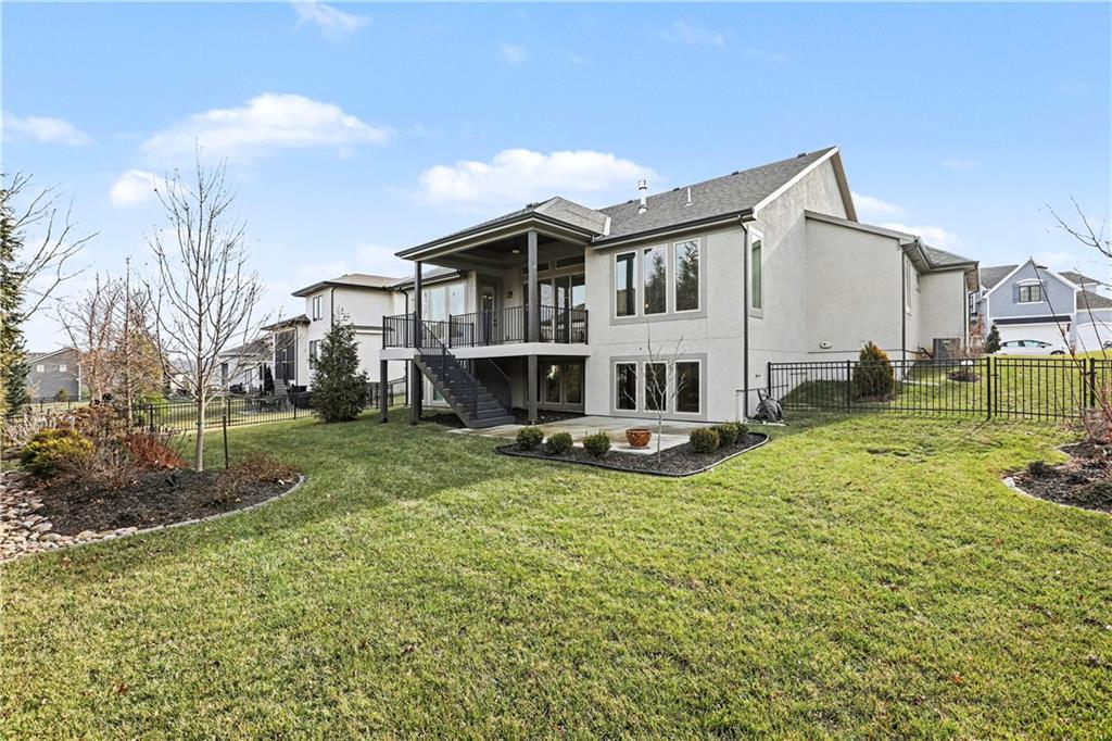 Exquisite Luxury Living in a Scenic, Sought-After WatersEdge Community Step through impressive double doors into this meticulous, less than 5-year young home, where refined design and thoughtful functionality come together effortlessly. The spacious great room is anchored by a striking fireplace and flows seamlessly into the chef-inspired island kitchen, complete with a walk-in pantry and second oven—perfect for entertaining and everyday living. The private primary suite is a true retreat, featuring an expansive walk-in closet and a spa-inspired bath with a beautifully tiled walk-in shower, dual quartz vanities, and a deep soaking tub designed for relaxation. The suite also offers direct access to the covered deck. A conveniently located laundry room off the primary closet adds ease to daily routines, while a second laundry in the lower level enhances flexibility. Also on the main level is a spacious second bedroom currently used as a home office, offering excellent flexibility as a private guest suite. It is served by a full bathroom featuring a luxury tiled shower—ideal for visitors or multi-generational living. An elegant curved staircase leads to a beautifully finished lower-level recreation room with a full bar, ideal for hosting gatherings. Two additional bedrooms, two bathrooms, and a versatile bonus room provide generous space for guests, hobbies, or work-from-home needs. Throughout the home, luxury finishes and custom craftsmanship reflect pride of ownership and a lightly lived-in feel. Located within a highly desirable subdivision celebrated for its scenic ponds, waterfalls, and tranquil water features, this exceptional property offers timeless appeal, comfort, and a premier setting in an unbeatable location.