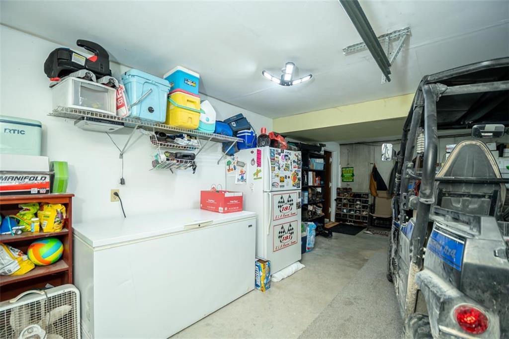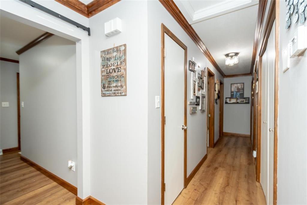 Welcome home to this gorgeous, well-maintained ranch-style property situated on a picturesque 1.02-acre corner lot with mature trees and room to breathe. This inviting home offers three bedrooms on the main level, including a primary suite with an attached full bath, plus an additional full bathroom for guests. The heart of the home features an open-concept kitchen and dining area with beautiful custom knotty pine cabinetry, thoughtful built-ins for extra storage, and an eat-in layout perfect for everyday living. Cozy up in the living room by the gas fireplace, or step out onto the large deck just off the kitchen, ideal for entertaining and enjoying peaceful outdoor views. Convenience is key with main-level laundry, while the finished basement adds even more space with a non-conforming bedroom, family/rec room, and a two-car garage. Outdoors, you’ll love the new concrete steps, sidewalks, patio, and gutters, along with a charming privacy-fenced patio designed for relaxing and hosting. A small shed provides extra storage, and there’s plenty of room for additional parking. Located in a quaint community with easy highway access, this home blends comfort, space, and functionality—ready for its next owner to enjoy.
