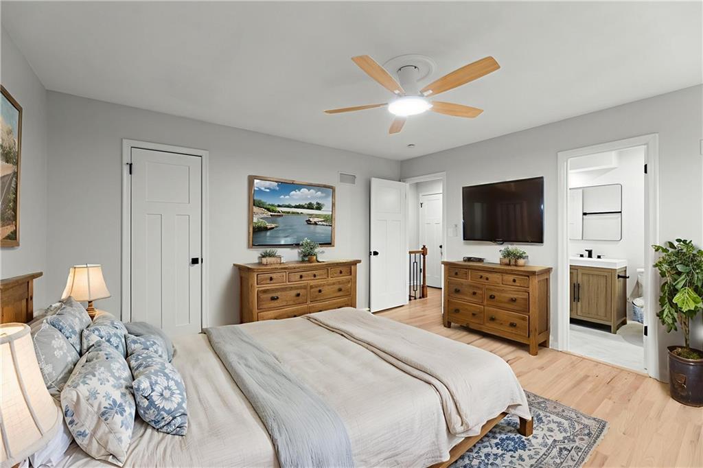Well-updated and move-in ready, this Overland Park home offers a layout that is comfortable. Refinished original hardwood floors, exposed beams, and a statement fireplace anchor the main living space, with a brand new kitchen with quartz countertops, and an open island for casual seating. A new roof and HVAC, the big-ticket items are already done. The floor plan is flexible and functional: two bedrooms on the main level including a primary suite, two additional bedrooms upstairs, and a finished lower level with an ensuite—ideal for guests, work-from-home, or extra living space.