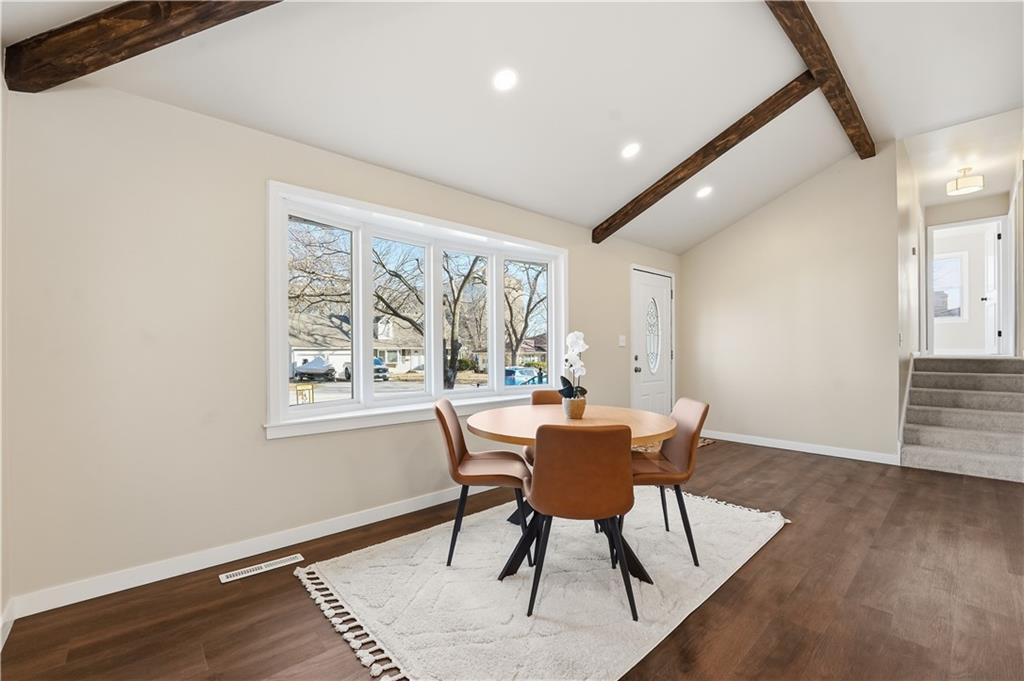 Welcome to this fully renovated split-level home, completely transformed from top to bottom and tucked into a quiet, established neighborhood with mature trees. The main level is bright and open with vaulted ceilings, exposed wood beams, and a comfortable living space that flows into the dining area and updated kitchen featuring ALL brand-new stainless steel appliances, white cabinetry, and modern finishes. Just off the main living area, a large sunroom offers additional space to relax or entertain. Upstairs, you’ll find well-sized bedrooms, including a primary suite with its own bathroom, plus an updated hall bath. The laundry is conveniently located on this level, right next to the bedrooms, making everyday living easy. The finished lower level adds valuable flexibility with a second living space, a full bathroom, and a spacious non-conforming 4th bedroom with a walk-in closet. With private exterior access, this area works well for guests, a home office, or additional living space. Additional features include updated flooring throughout, modern fixtures, ample storage, a two-car garage, and a rear deck overlooking the yard. Located just minutes from North Kansas City Hospital and approximately 10 minutes from Downtown Kansas City, this home offers quick access to city amenities while still feeling removed from the busy city life. Move-in ready and thoughtfully renovated throughout, this home is truly unrecognizable from its original condition and offers a functional layout, great location, and flexibility to fit a variety of lifestyles.