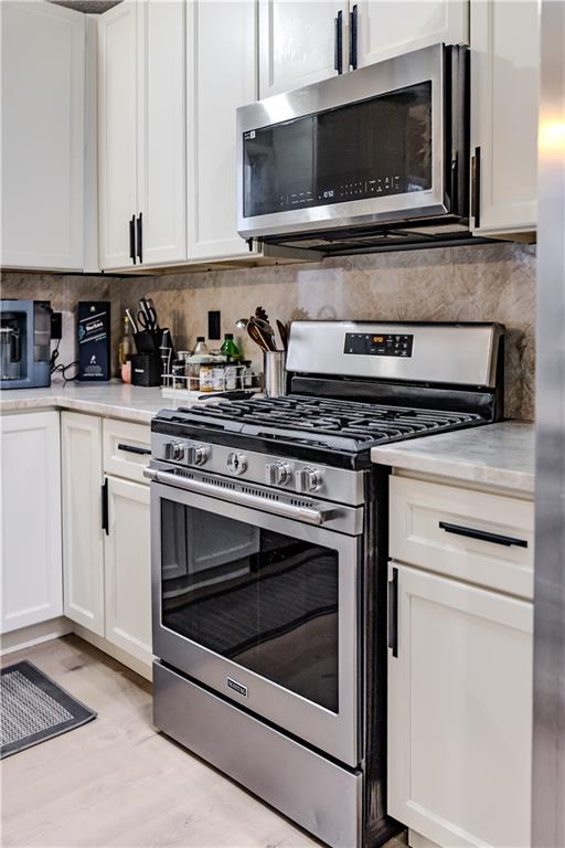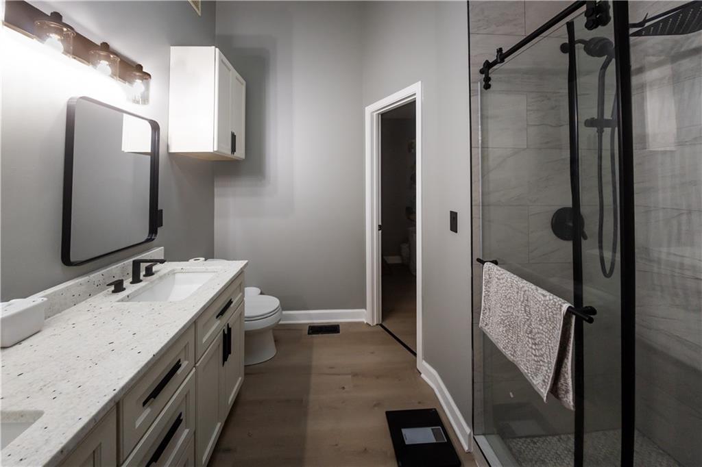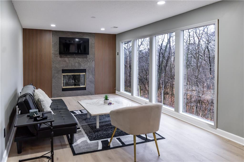 This beautifully remodeled home offers a light-filled, modern interior with thoughtful design and all-new major systems throughout. Vaulted ceilings and expansive windows create an open, airy feel while framing peaceful wooded views and filling the living spaces with natural light. The main living area features a striking fireplace with contemporary tile surround and vertical wood accents, serving as a true focal point for the space. Wide-plank flooring flows seamlessly throughout the main level, complementing the home’s neutral and modern colors. The fully updated kitchen is both stylish and functional, featuring crisp white cabinetry, new countertops, a large center island with seating, and brand-new appliances. Adjacent dining and living areas provide an open yet defined layout, ideal for entertaining or everyday living. Glass doors lead to a newly built deck overlooking mature trees and a creek, offering a private outdoor retreat for your morning coffee. Bathrooms have been tastefully remodeled with updated fixtures and tile work. Bedrooms are spacious and bright, updated lighting, and serene views. Major mechanical updates include brand-new HVAC and mechanical systems throughout, providing efficiency and peace of mind for the next owner. A brand-new washer and dryer are also included, making this home truly move-in ready