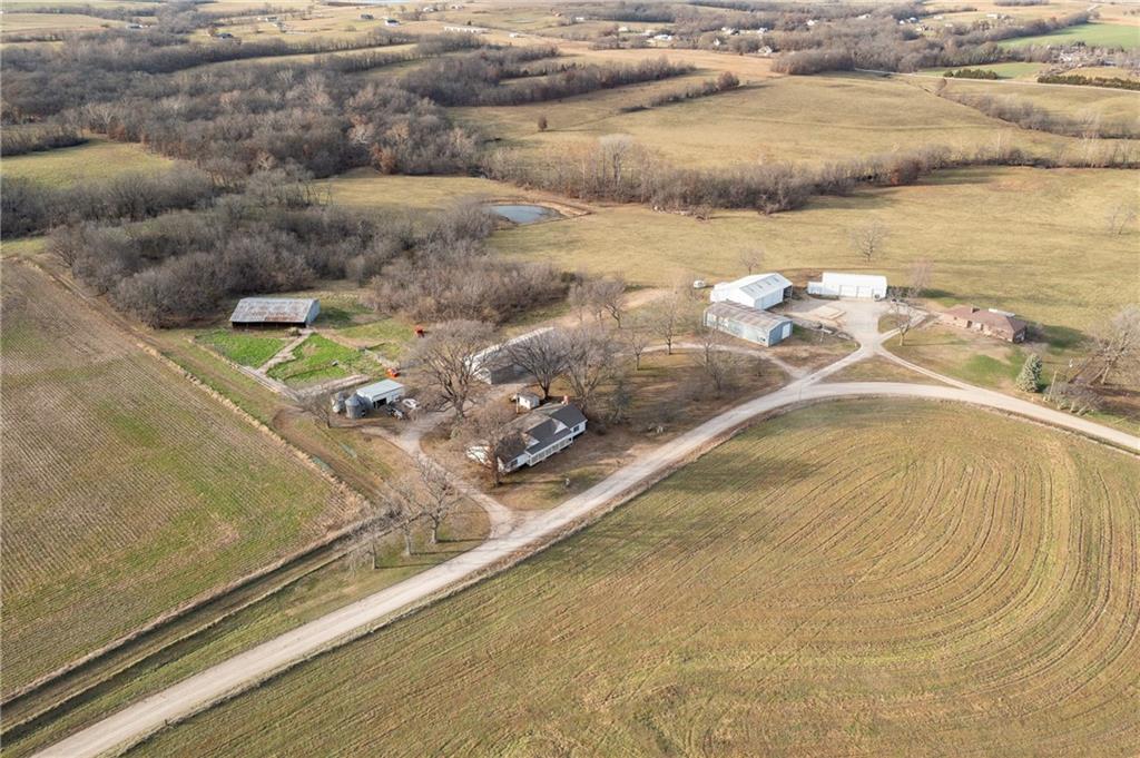 Located just one mile east of MO-58 and the town of Centerview, this 2.5 +/- acre property in Johnson County, Missouri, offers a combination of history, space, and shop infrastructure. The main residence is a 3,780 +/- square foot home originally built in the late 1800s, with major updates including a remodel in 1967 and an addition completed in 1990. The home features two beautiful brick fireplaces, original vintage trim, and a layout that provides substantial square footage for a full restoration or remodel. A new roof was installed in 2020. The home is connected to rural water, includes a sump pump, a newer sewer line installed in 2010, central air conditioning, and propane-fueled heat. The 2+ acre lot includes mature oak, walnut, and elm trees as well as pecan and peach trees in the yard, which offer privacy and a classic country feel. For buyers wanting to build new, the acreage and utilities provide an excellent homesite. The improvements on this property are what truly set it apart. The west shop offers approximately 4,000 square feet on the main level plus an upstairs area, featuring steel construction, insulation, an elevator hoist, and full utility connections, including electric, water, and a bathroom. The north “diesel” shop provides an additional 3,000 square feet with steel construction, insulation, an office area, plumbing, 110V and 240V power, three oversized bay doors, and a dump pit—making it ideal for a business, mechanical operation, or serious hobbyist. Additional improvements include two smaller grain bins suitable for storage or conversion into popular “binzebo” structures, a two-bay garage with concrete floors and functioning doors, and a small smokehouse-style building currently used for storage. This is a unique opportunity for someone looking to combine residential living with shop space, storage, and the ability to operate a business, all in a highly accessible Johnson County location.