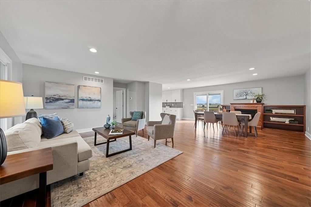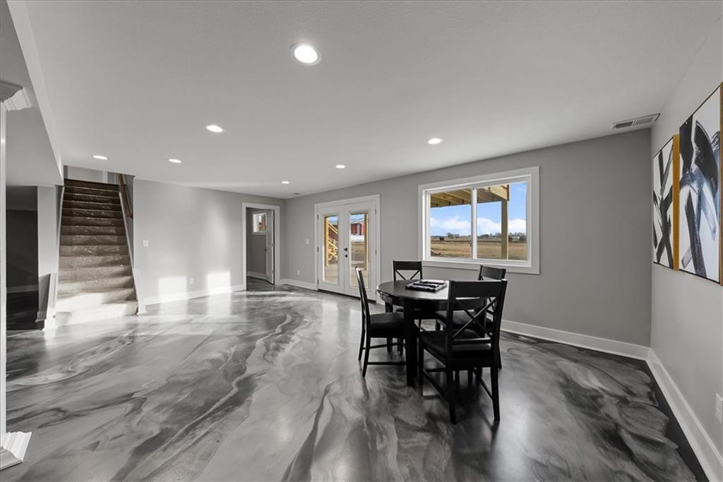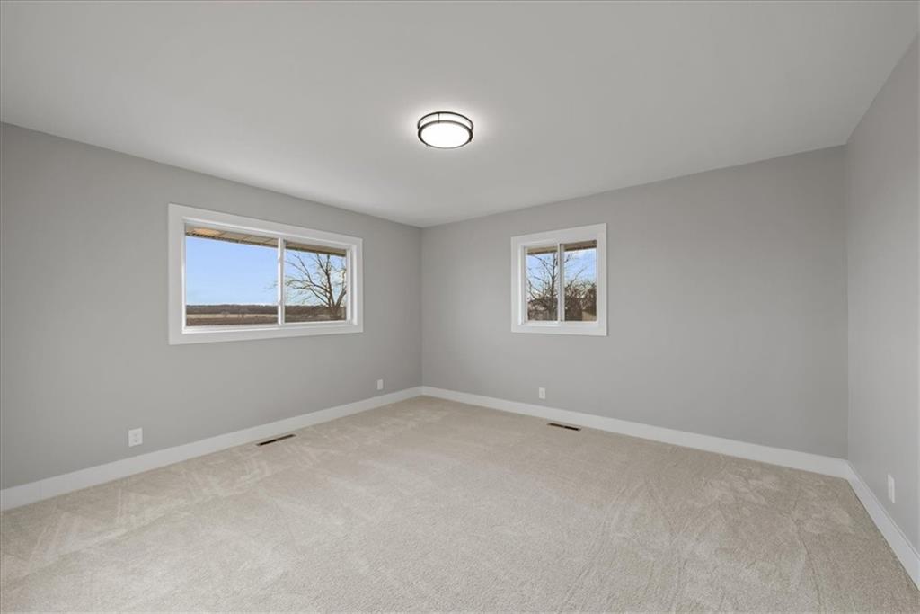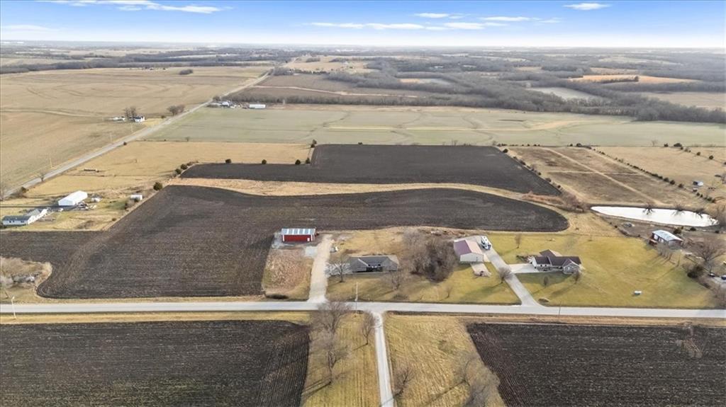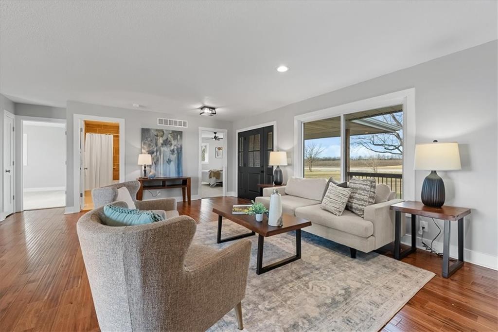 A rare opportunity for acreage living, this fully remodeled 3,017 sq ft ranch with a finished walkout basement is set on 10 acres. The home offers 4 bedrooms, 3.5 baths, and a flexible main-level office or fourth bedroom, thoughtfully updated to blend modern comfort with timeless ranch design. At the heart of the home is an all-new kitchen featuring abundant cabinetry, quartz countertop surfaces, and brand-new appliances—designed for both everyday living and entertaining. New bathrooms, all new windows, doors, flooring, HVAC System, Electrical Box and wiring, Siding, Exterior and Interior paint and all-new fixtures throughout reflect the home’s comprehensive renovation and elevated finish. Everyday functionality shines with an expansive mudroom and main-level laundry, along with a walk-in pantry complete with a convenient grocery door to the garage. The finished walkout basement extends the home’s versatility, offering a wet bar, professional epoxy flooring, and a striking glass-and-tile walk-in shower—ideal for hosting, relaxation, or extended living. The 2.5-car side-entry garage has new epoxy floors, providing durability with a polished look. Outdoor living is enhanced by a large new deck and expansive concrete patio overlooking the peaceful, open acreage. Additional amenities include a 40x60 outbuilding with electricity and a convenient lean-to, perfect for equipment, animals or additional storage. Paved road access—no gravel. The buyer receives first right to purchase the adjoining 8 acres, offering potential for added privacy or future expansion. NO HOA. No fencing. Just space, freedom, and the opportunity to make it your own.