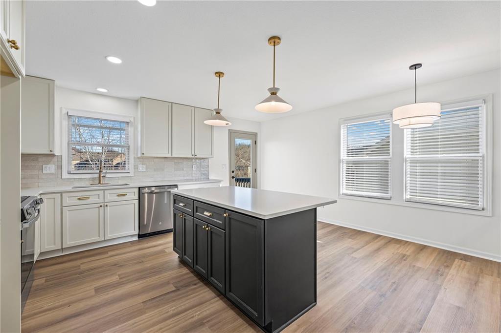 Beautifully remodeled California Split level home backing to neighborhood trail and pond! ALL NEW: Roof, Kitchen, Baths and MORE! Fresh interior and exterior paint pair perfectly with new floors. Inviting, light and bright Great Room features cozy fireplace for these chilly months. Please the chef in this kitchen with new cabinets, quartz countertops, center eat-in island, pantry and new stainless steel appliances! Adjacent dining area accesses the deck to easily move outdoors! Also on this level find two bedrooms, second full bath and convenient laundry! Head up to the Primary Retreat showcasing tray vault ceiling, walk-in closet and a private en-suite including double vanity, spa bath and separate shower! Finished, walk-out lower level has a family room, fourth bedroom and third full bath. Unfinished basement for additional storage needs. All of this in a fantastic location just minutes to all the activities at the Legends and easy highway access to enjoy everything the Metro has to offer. WELCOME HOME!