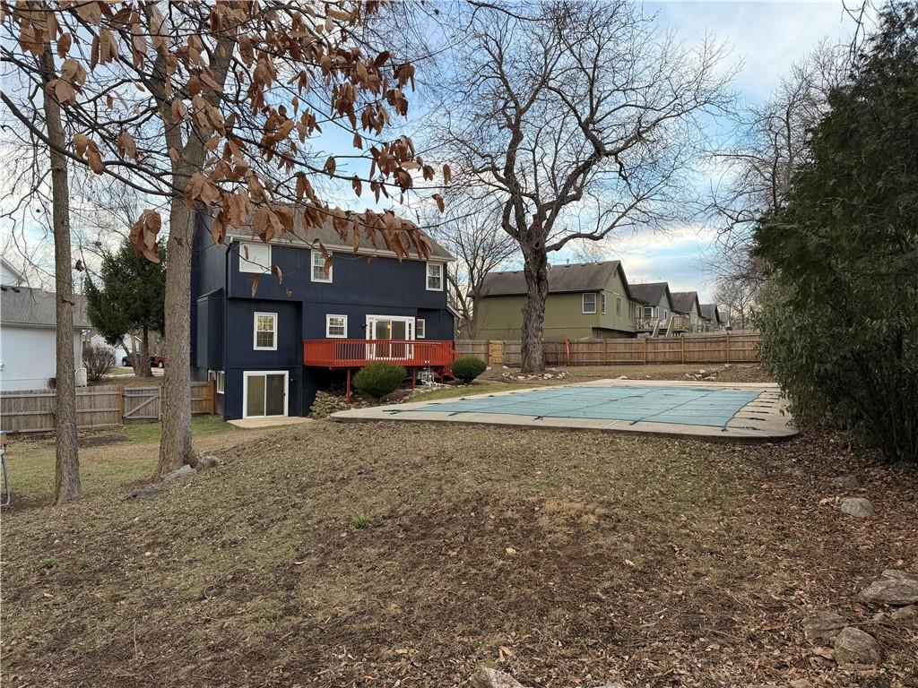 Tucked away on a cul-de-sac in the sought-after Blue Valley school district, this Willow Bend beauty is centered around a truly exceptional outdoor retreat. Set on a lush, .36-acre treed lot with fenced backyard featuring a beautiful in-ground pool surrounded by an expansive patio—perfect for summer gatherings, morning swims, or relaxing evenings under the trees. The deck overlooks the serene backyard and pool, offering the ideal space for dining, hosting, or simply unwinding. Inside, the home continues to impress with a welcoming great room showcasing a brick fireplace framed by built-in bookshelves. The kitchen has been completedly updated with white cabinetry, quartz countertops, a large island, stainless steel appliances, and pantry. The finished walkout lower level is designed with entertaining in mind, providing direct access to the pool and lower patio. The primary suite offers a walk-in closet and spa-inspired bath highlighted by marble countertops, dual vanity, tile floors, a corner whirlpool tub, and a stylish sliding barn door that adds warmth and privacy. Additional highlights include updated windows, newer garage doors, and updated lighting. Move-in ready as washer, dryer and refrigerator all stay! Close to Bluhawk, restaurants, shopping, schools, and parks. Green Meadows and Creekside park with trails, creek, green space, two playgrounds, and picnic shelter is just a short walk down the street. Don’t wait on this one!